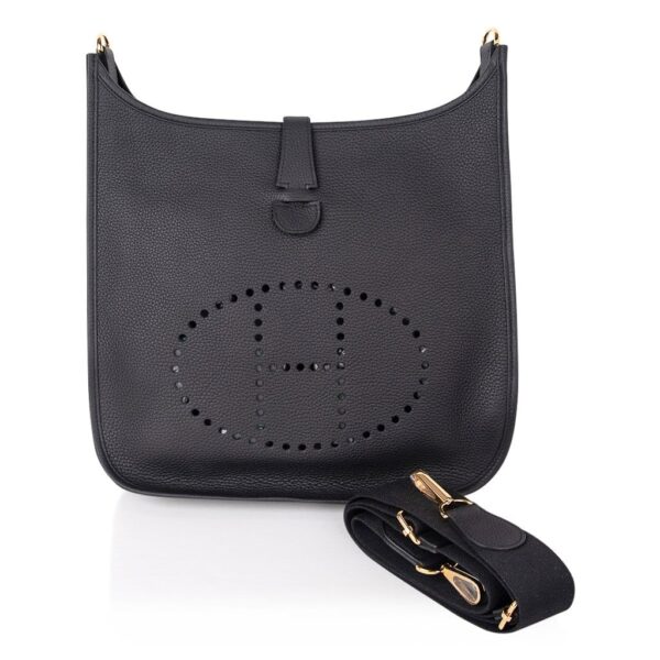 Guaranteed authentic Hermes Evelyne GM featured in Black clemence leather.
