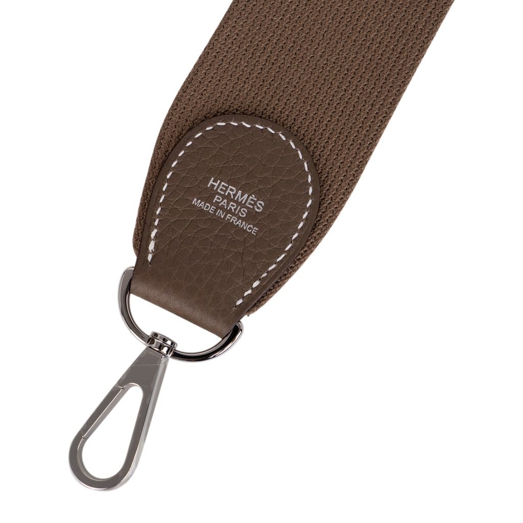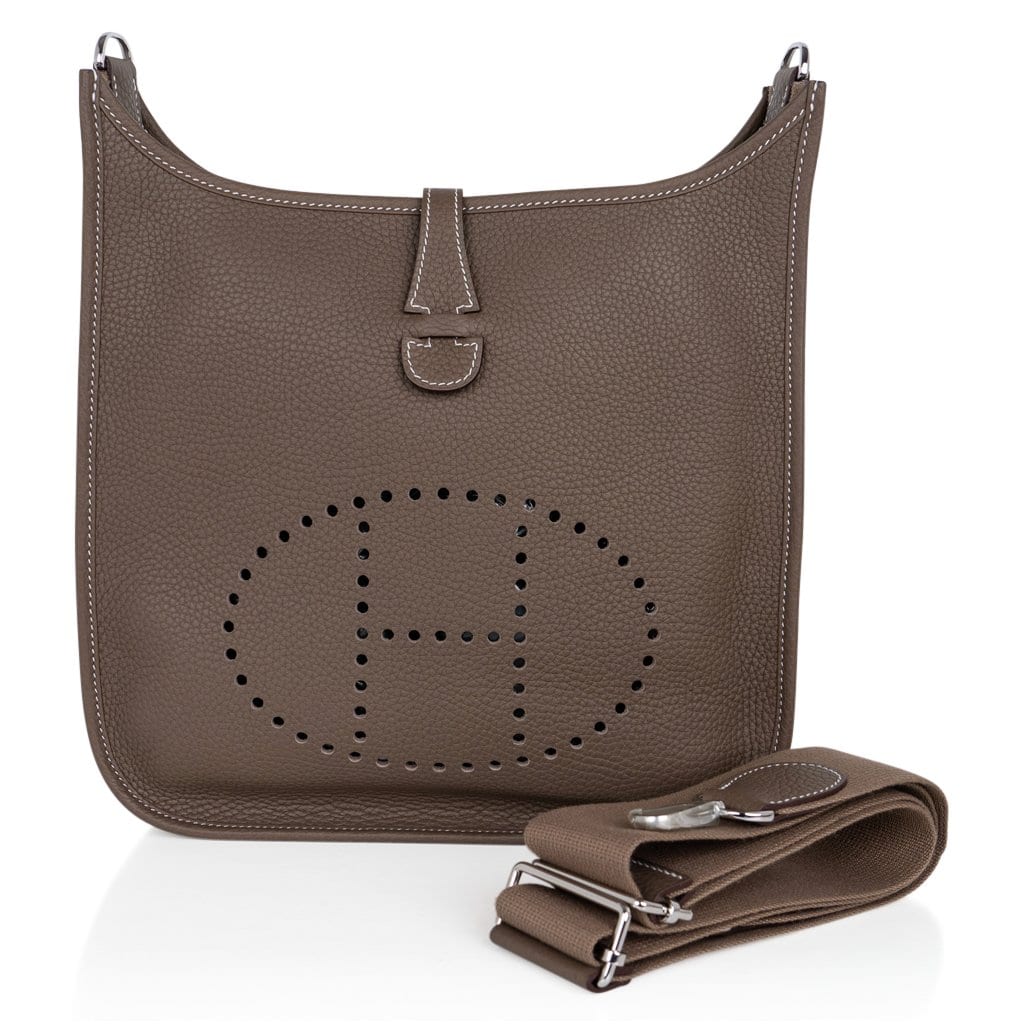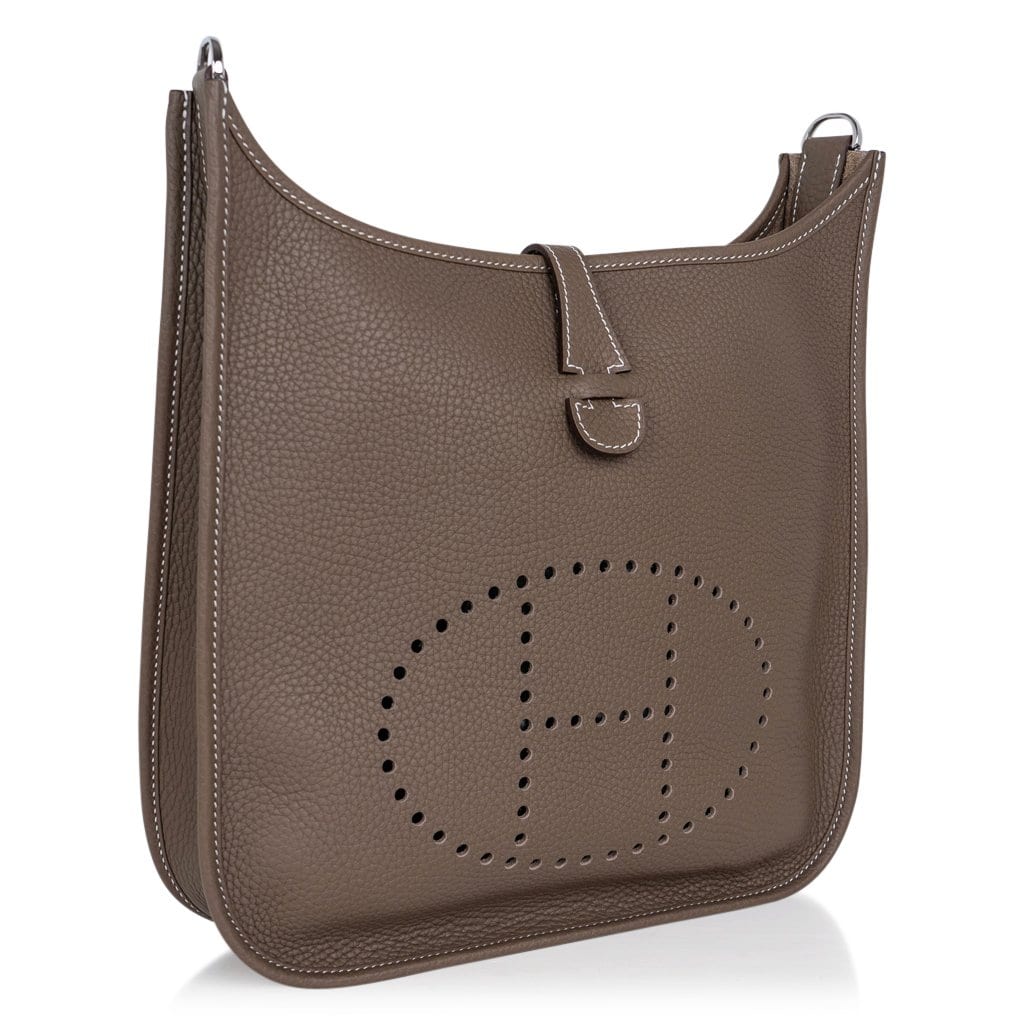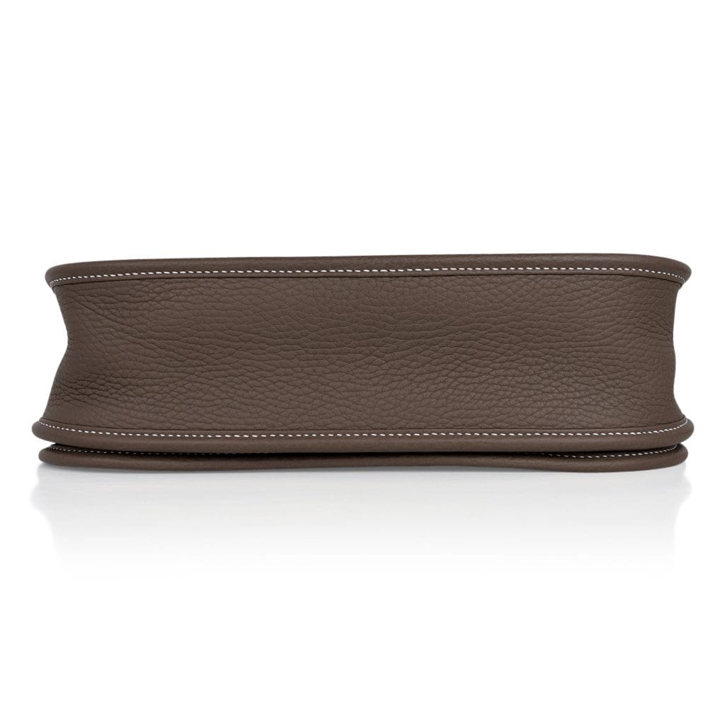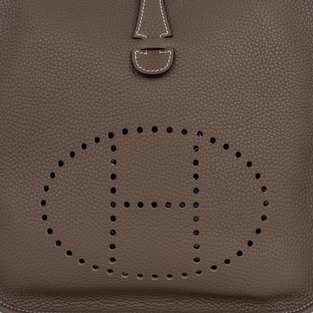 Guaranteed authentic Hermes Evelyne PM featured in neutral Etoupe clemence leather.