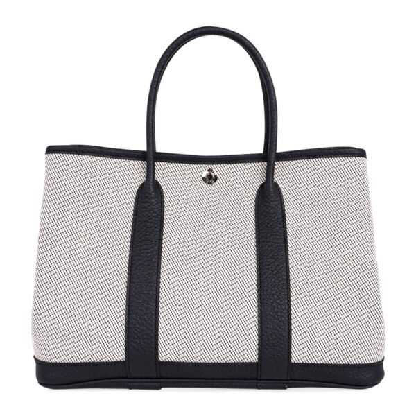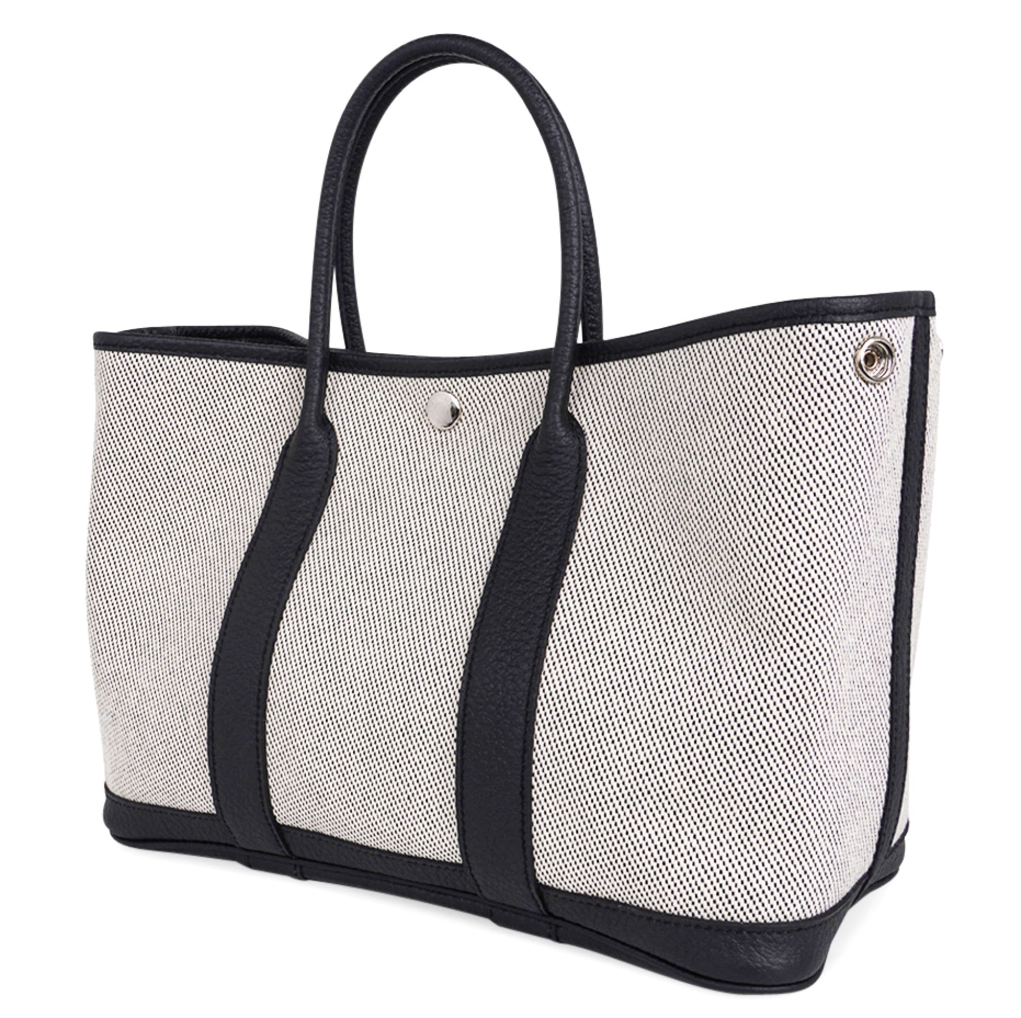 Guaranteed authentic Hermes Garden Party featured in Criss Cross Noir and Ecru Toile with Vache Country leather.