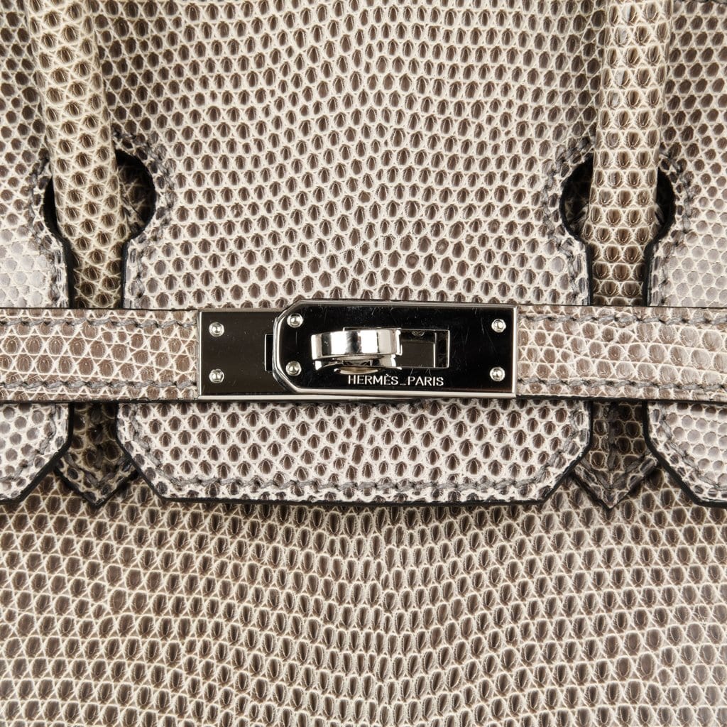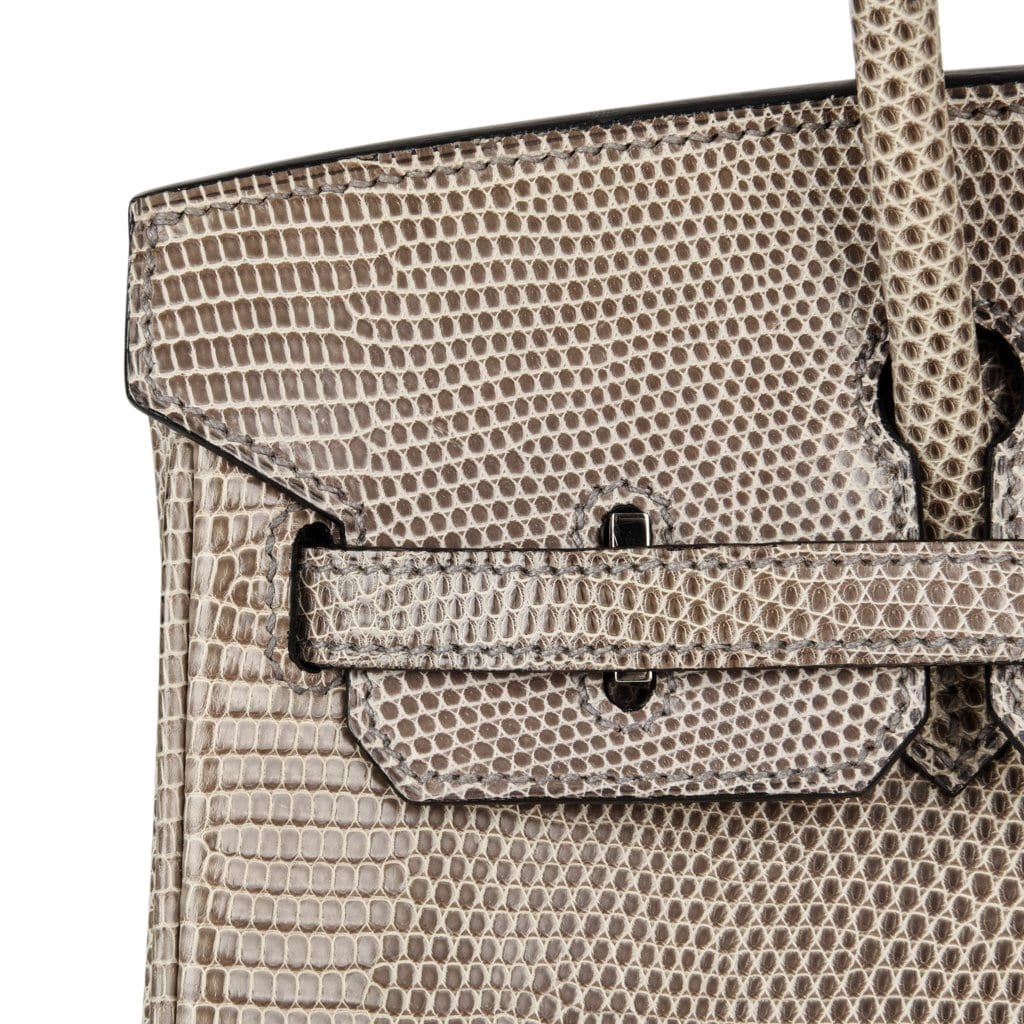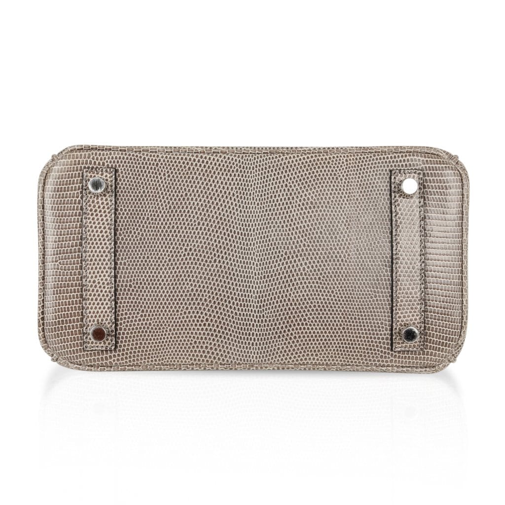 Guaranteed authentic Hermes Birkin 25 bag features rare Gris Agate lizard.