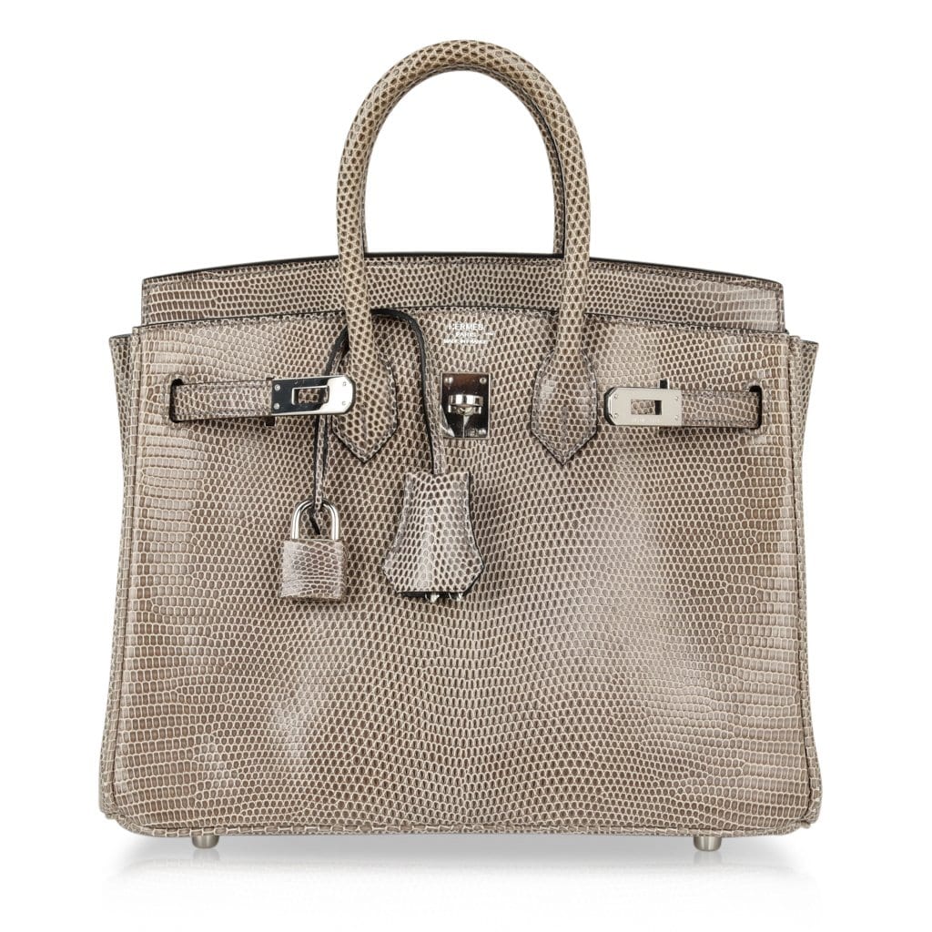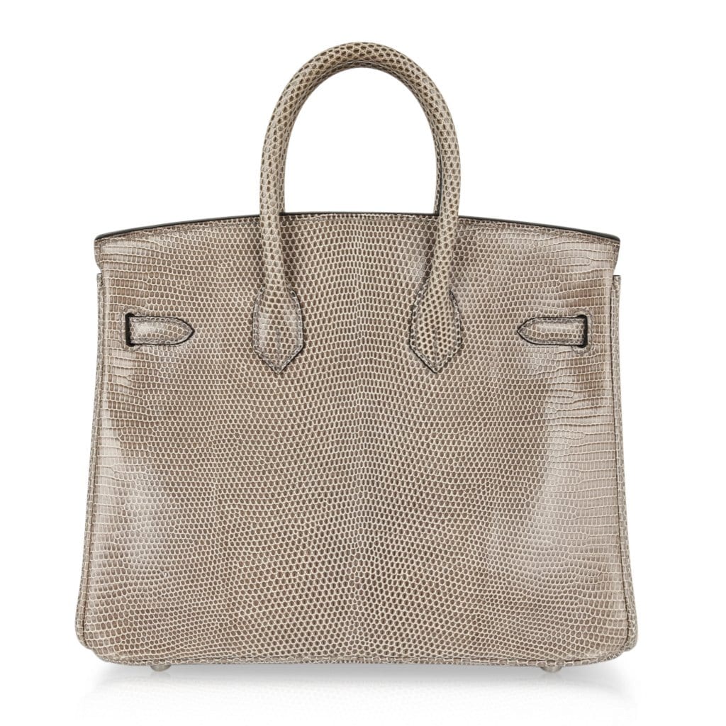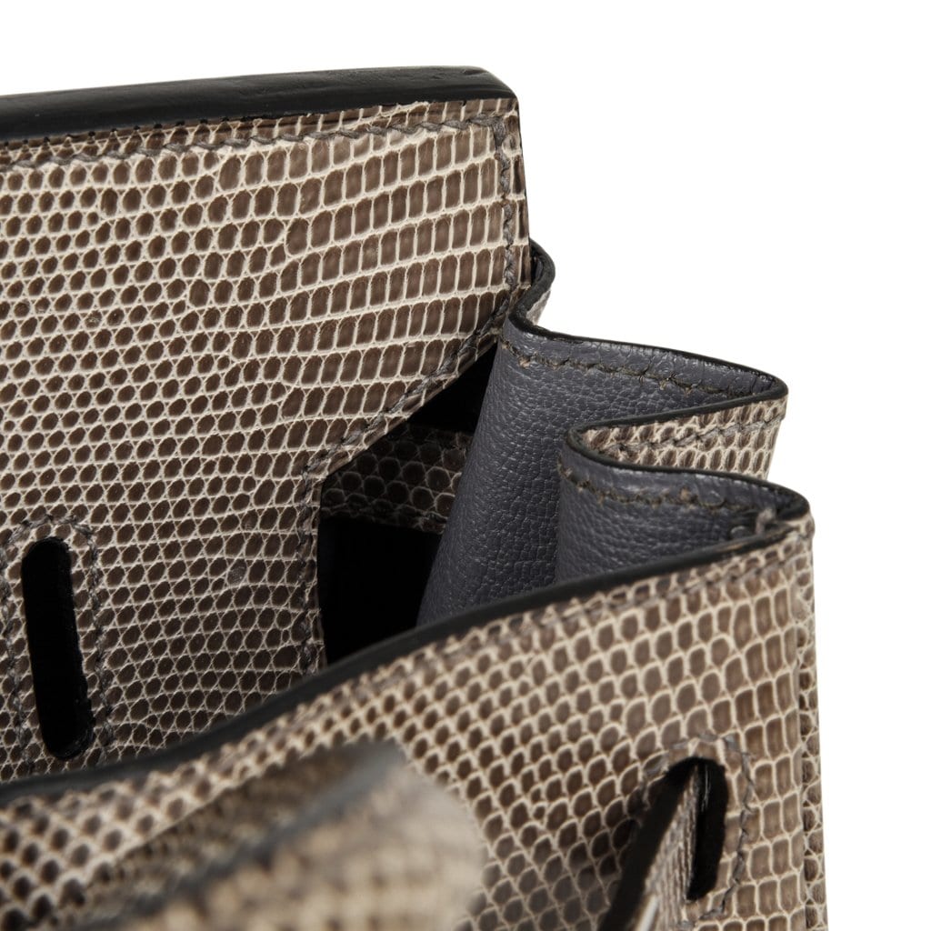 Guaranteed authentic Hermes Birkin 25 bag features rare Gris Agate lizard.