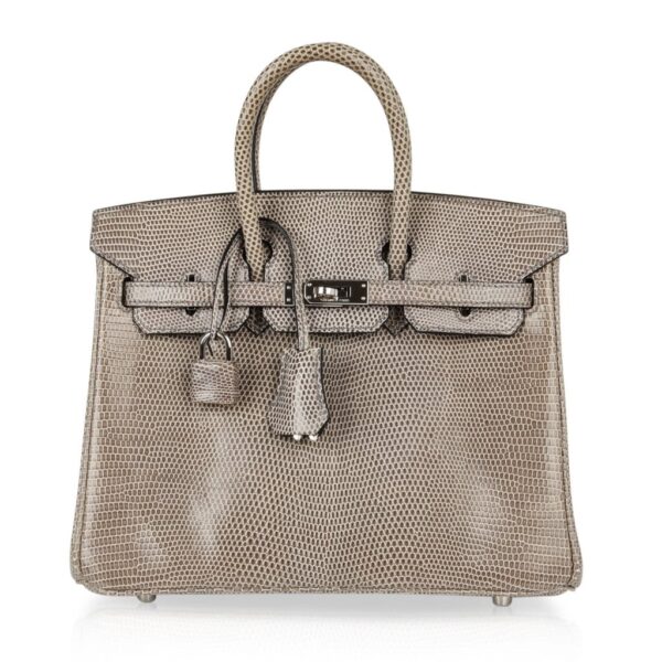 Guaranteed authentic Hermes Birkin 25 bag features rare Gris Agate lizard.