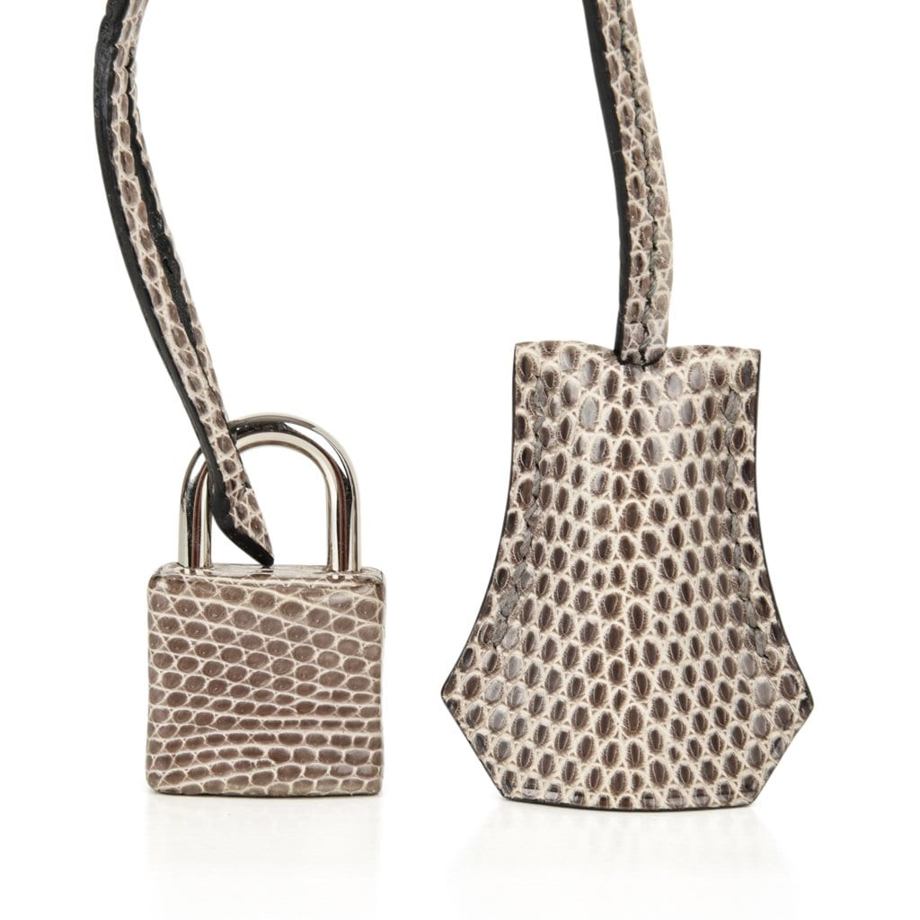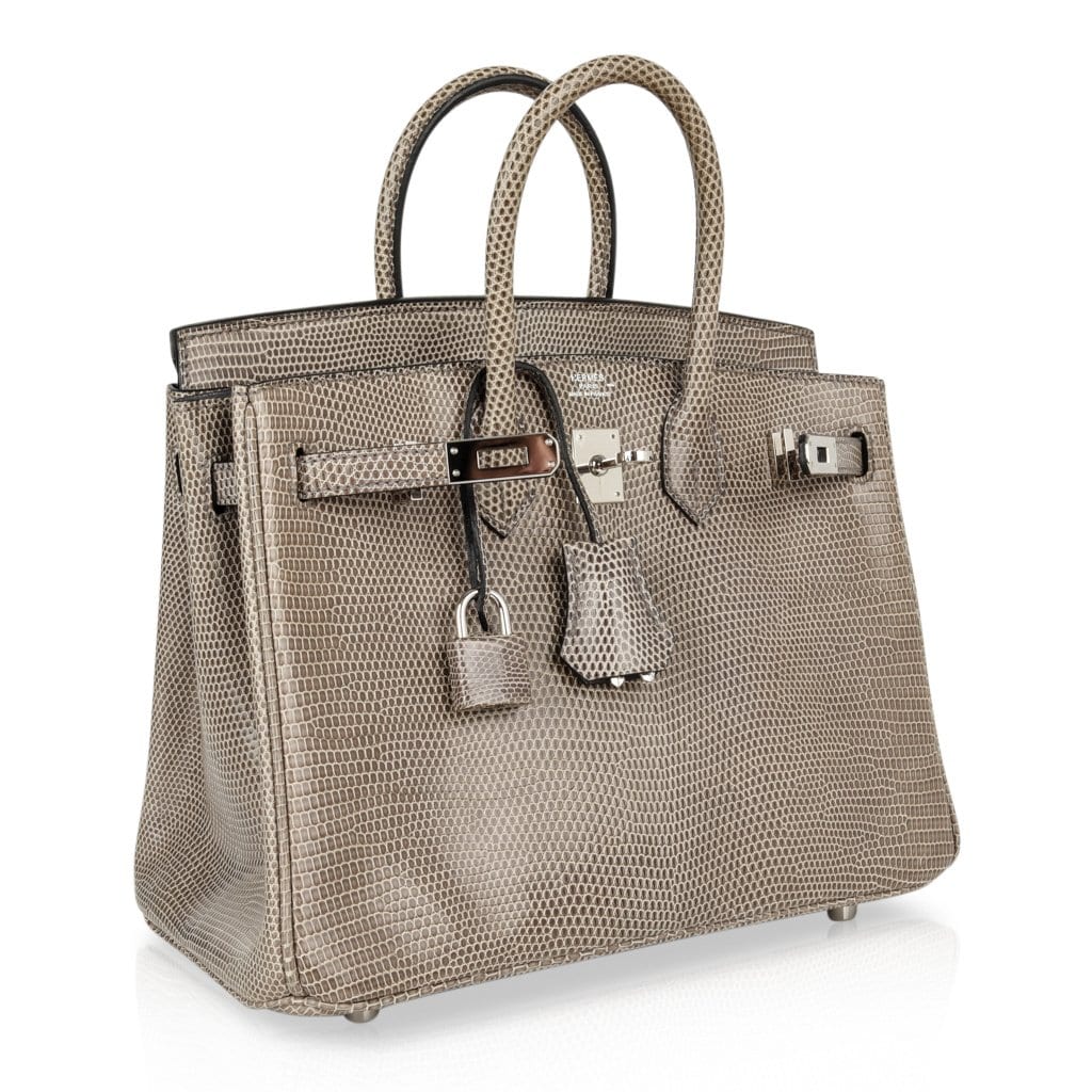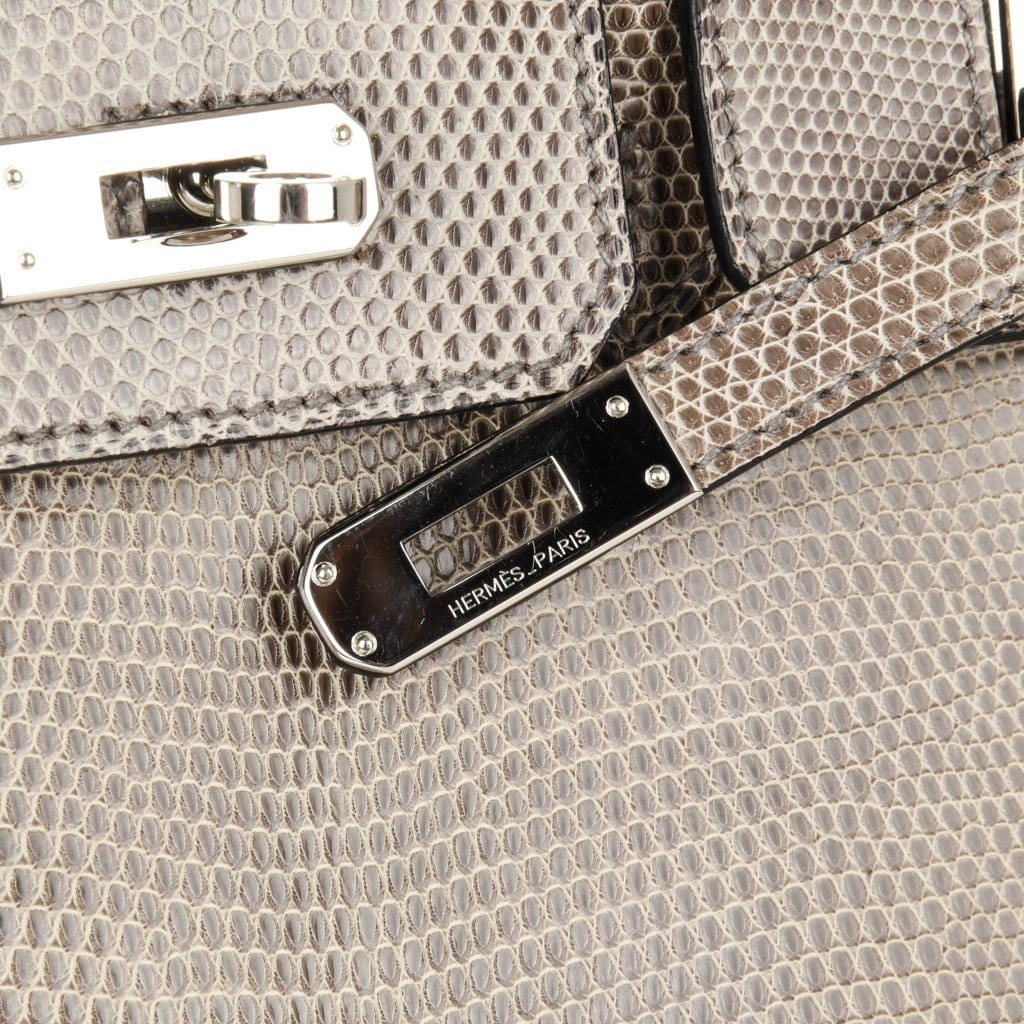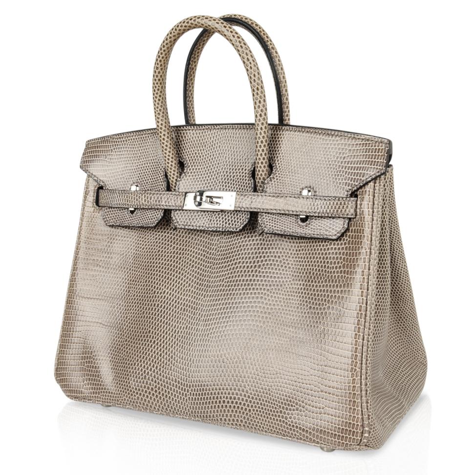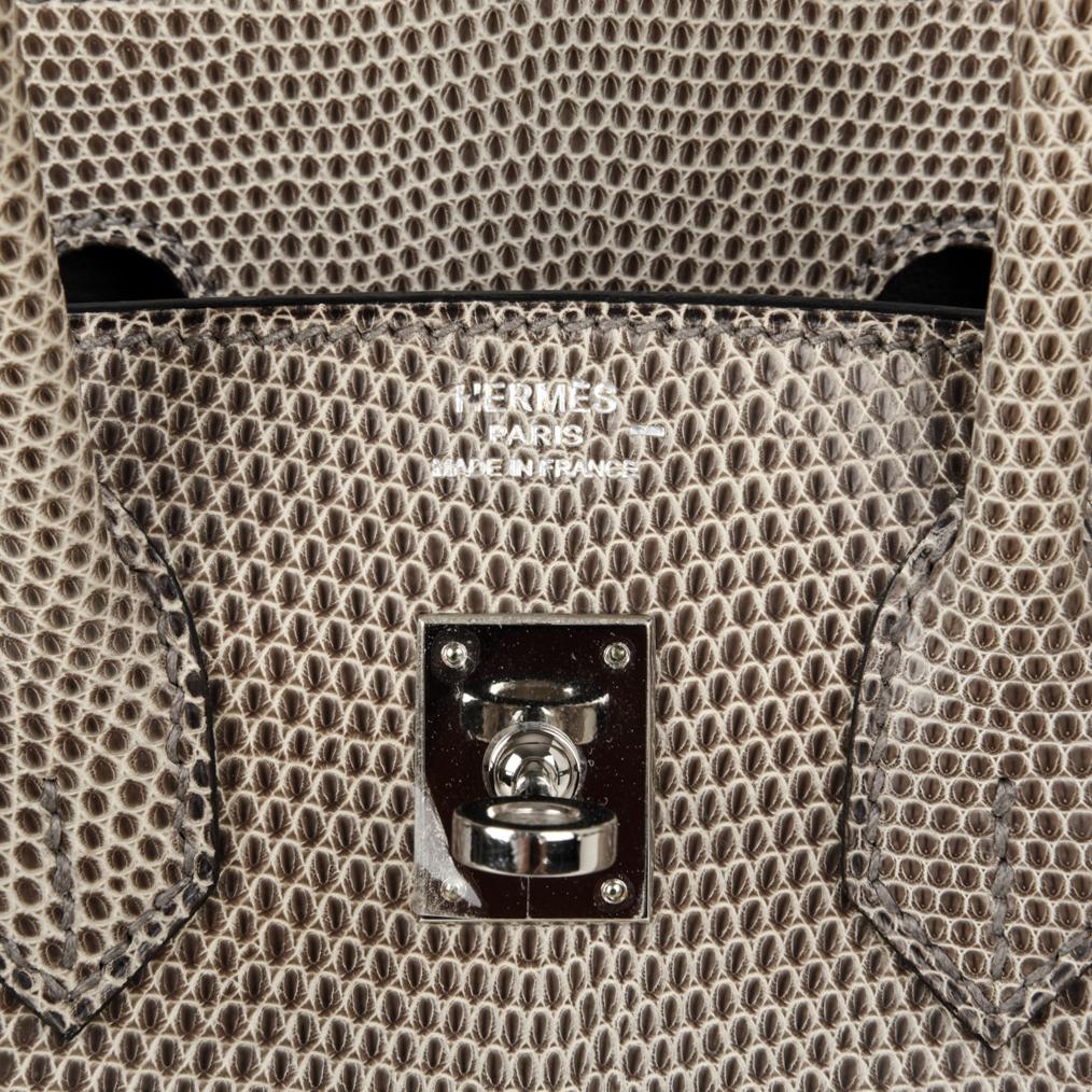 Guaranteed authentic Hermes Birkin 25 bag features rare Gris Agate lizard.