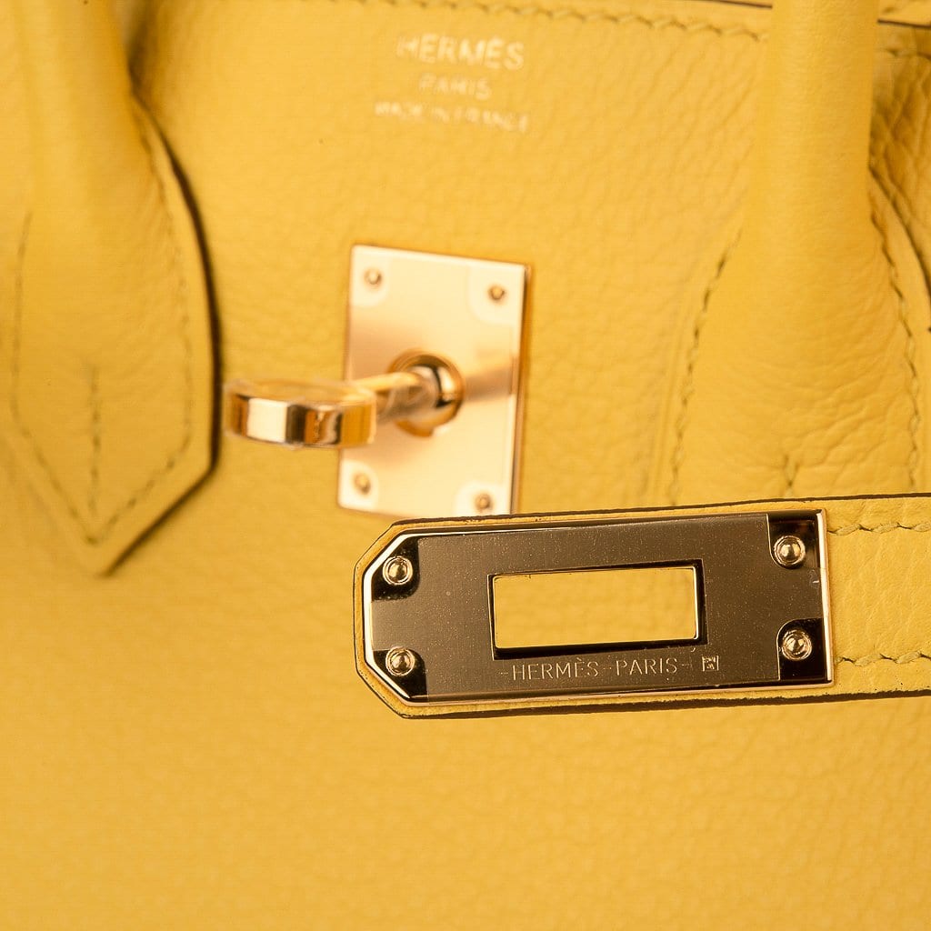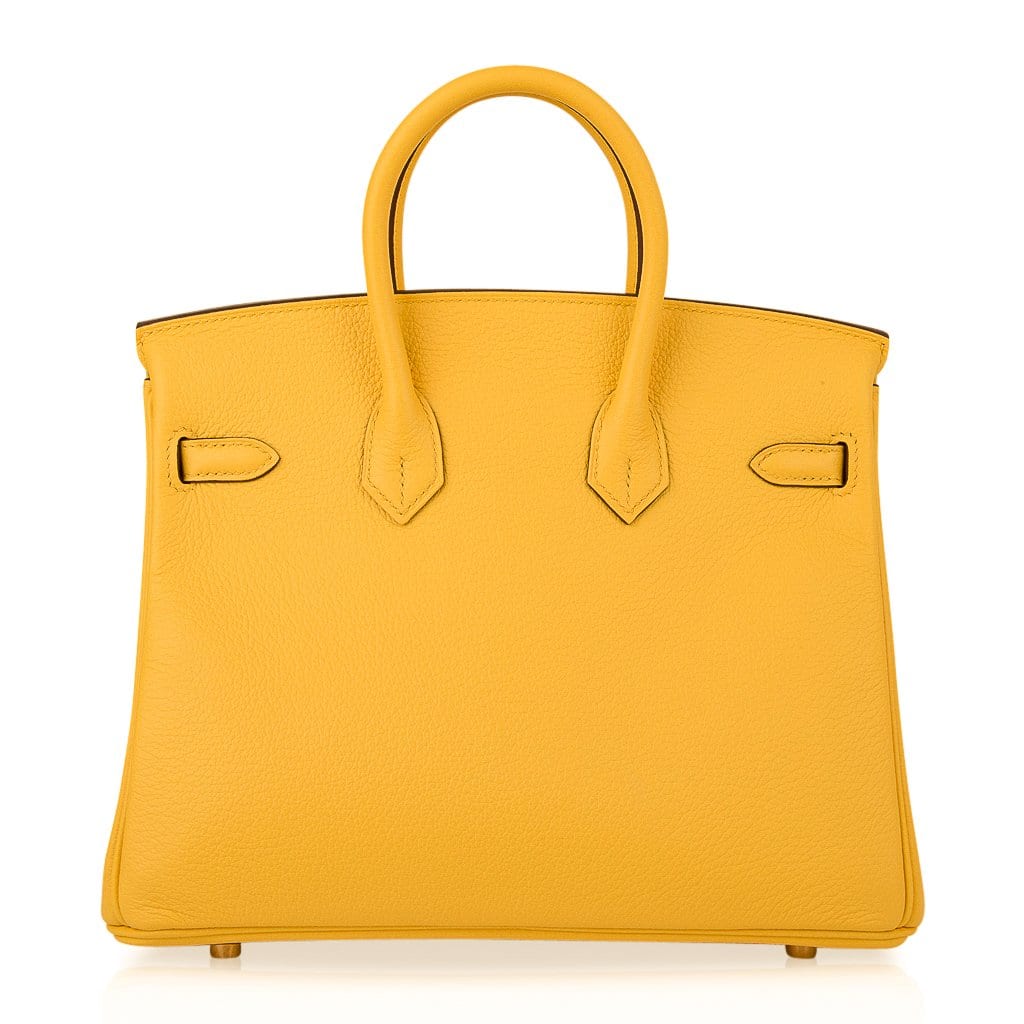 Guaranteed authentic Hermes Birkin 25 bag features Jaune de Naples in Novillo leather.