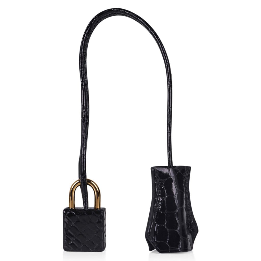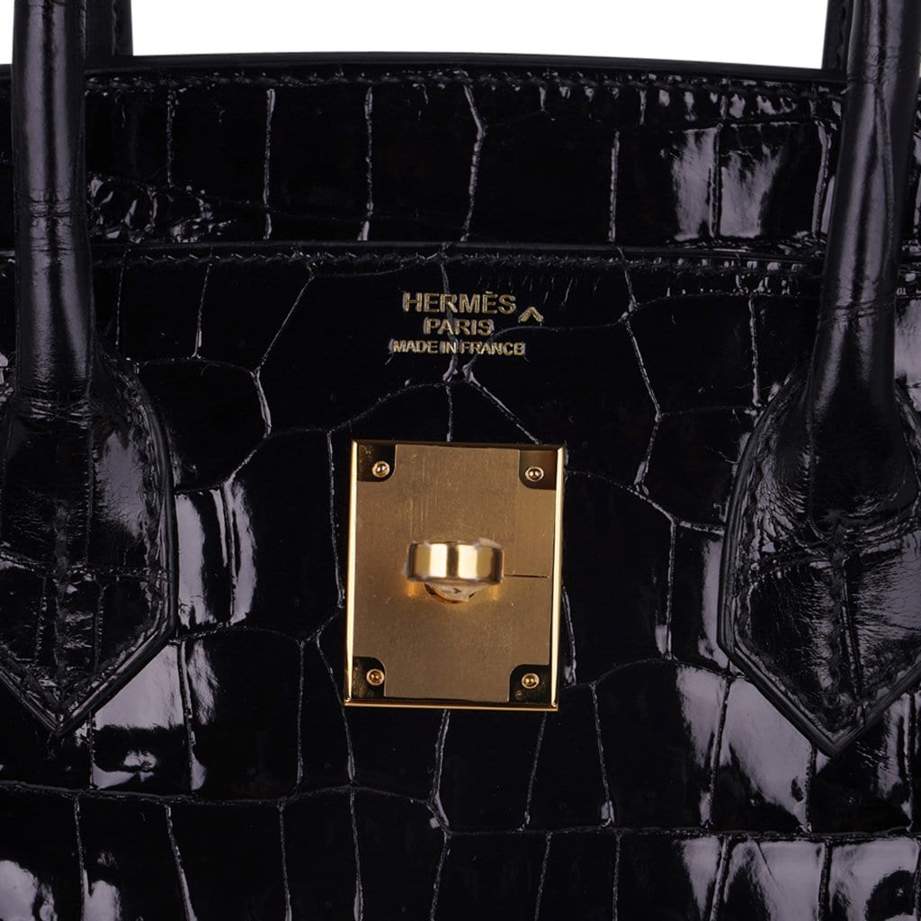 This rich Black Hermes Birkin bag in crocodile lisse skin with lush gold hardware is magnificent with beautiful scales!