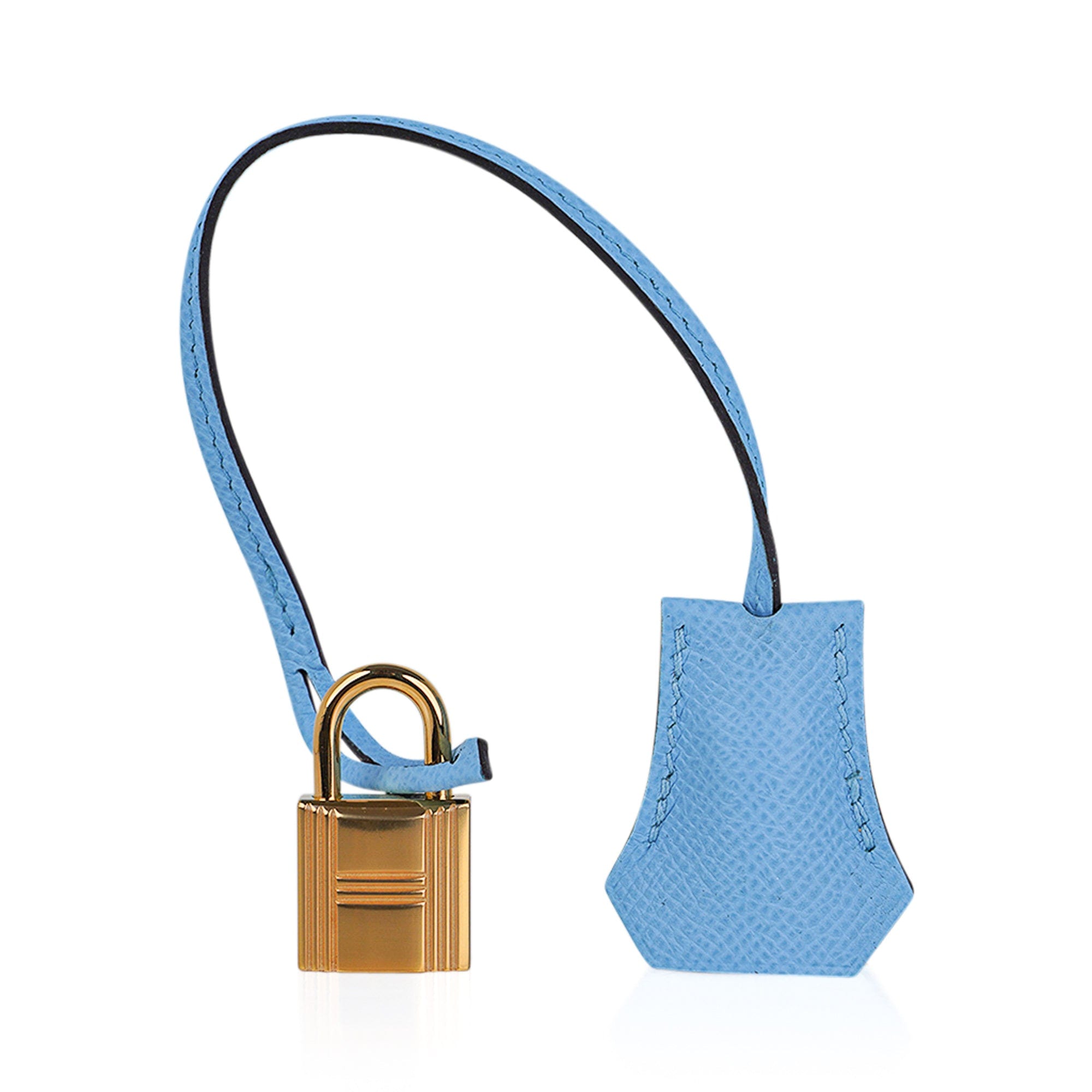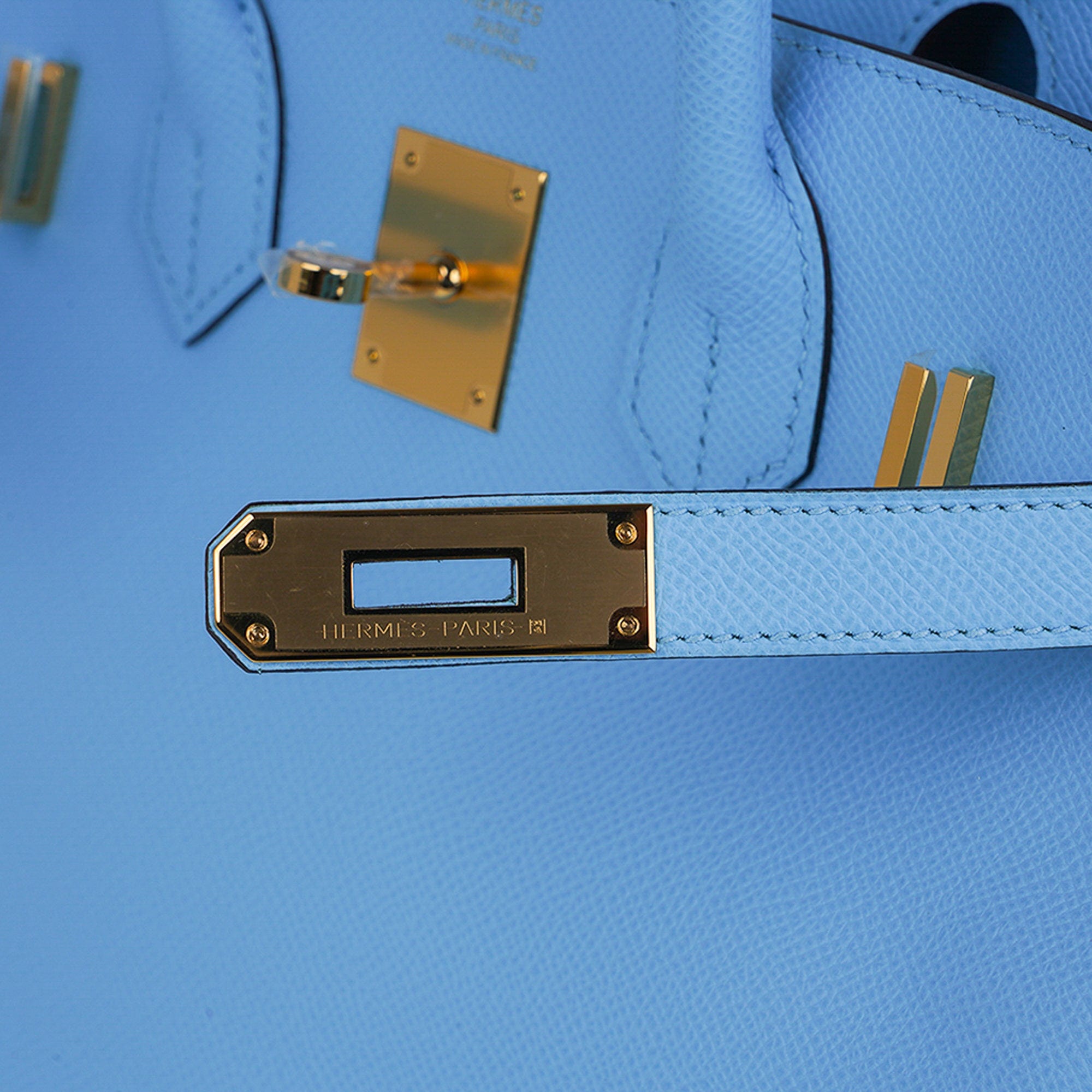 This beautiful sky blue Birkin bag is accentuated with Gold hardware.