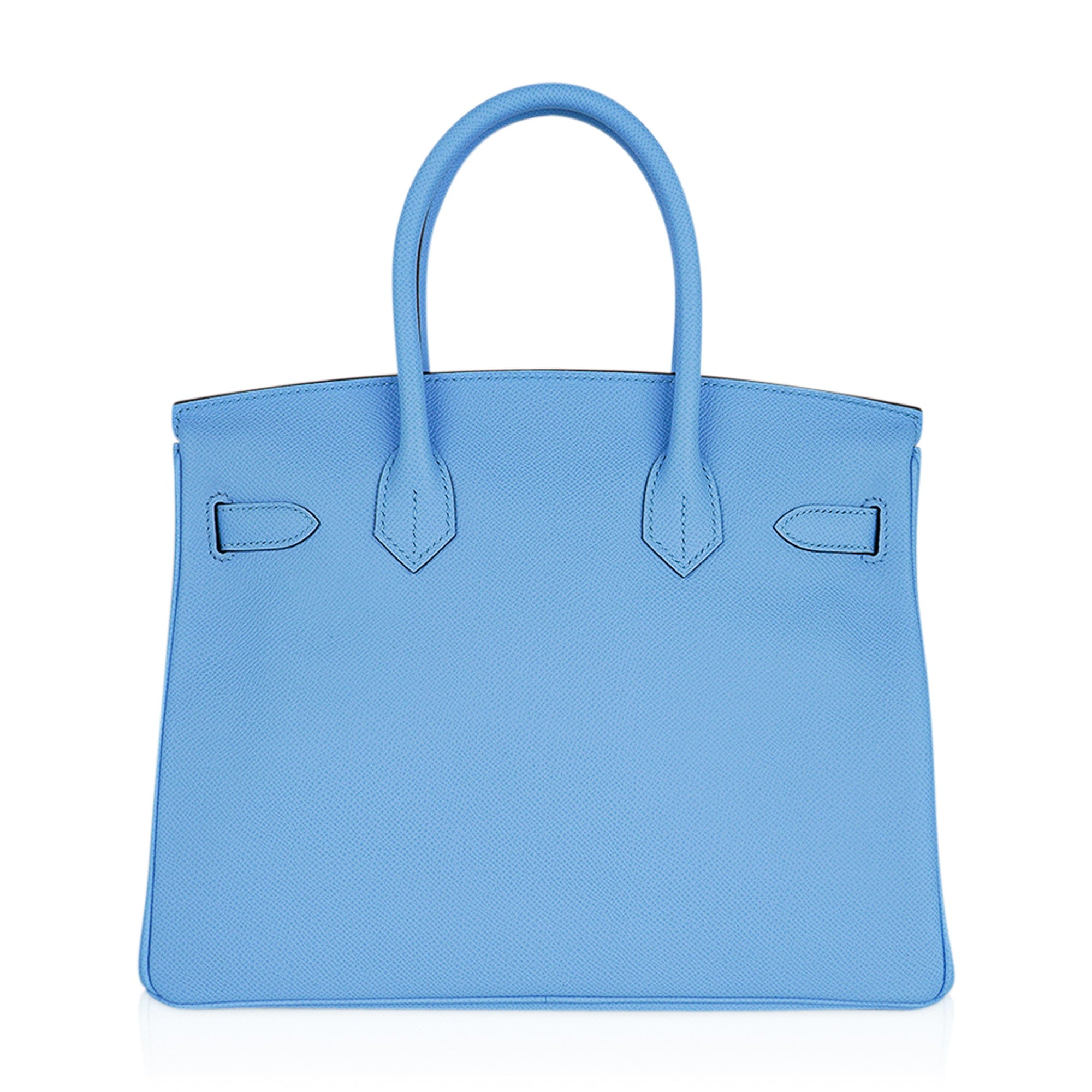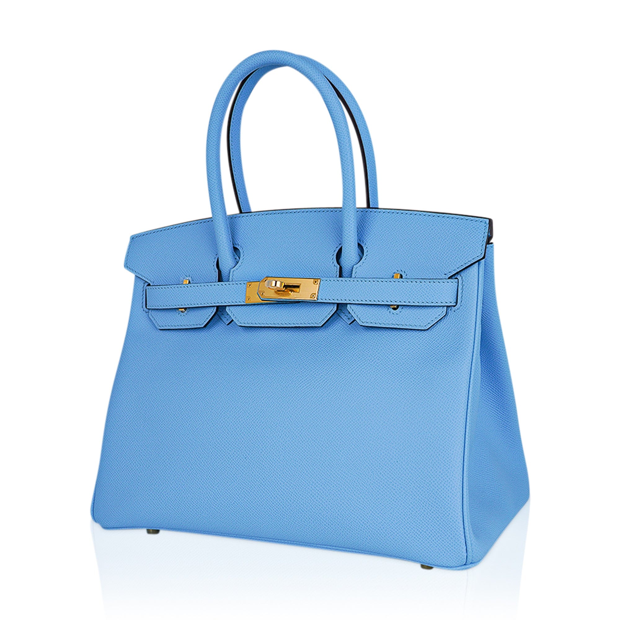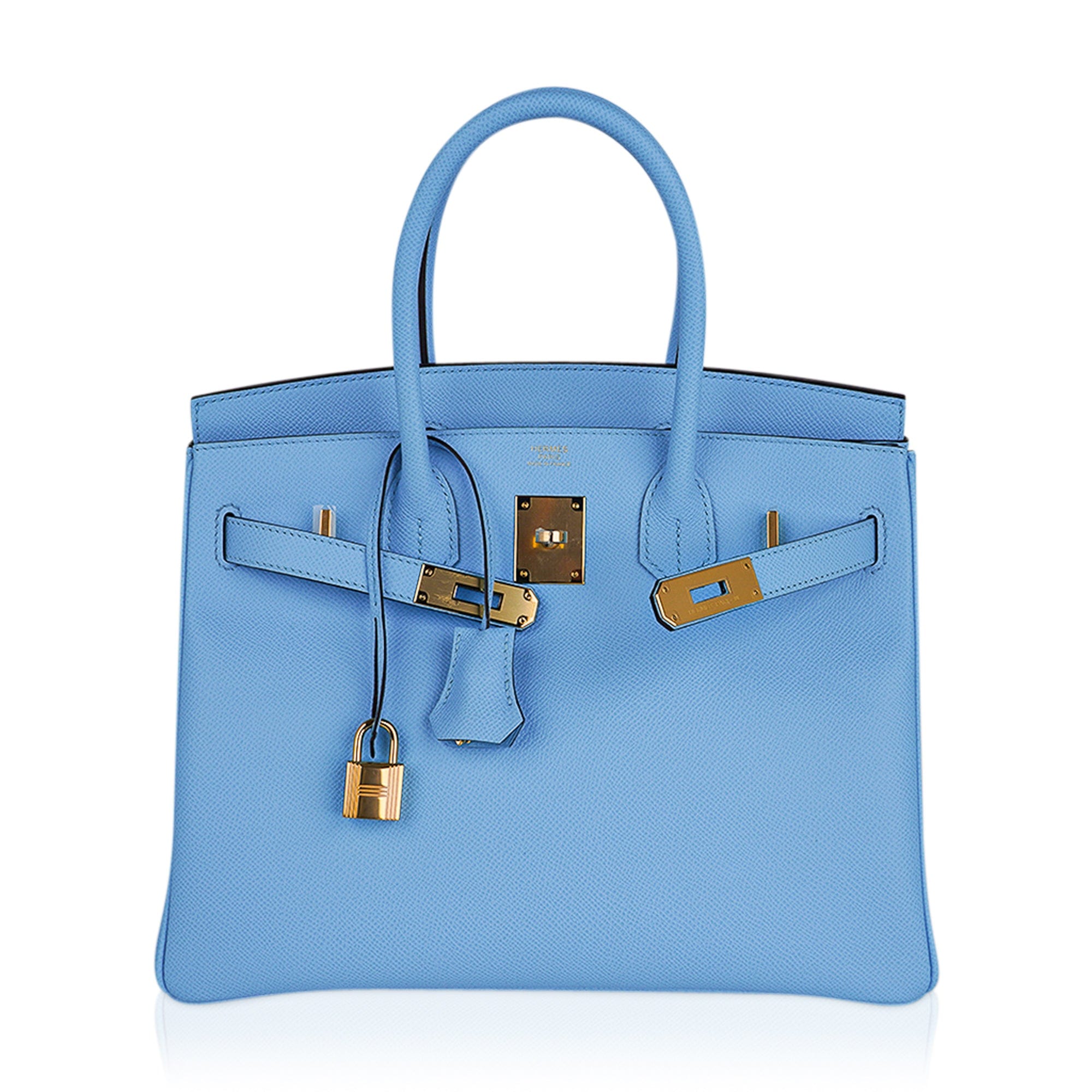Guaranteed authentic Hermes Birkin 30 bag featured in rare Blue Celeste.