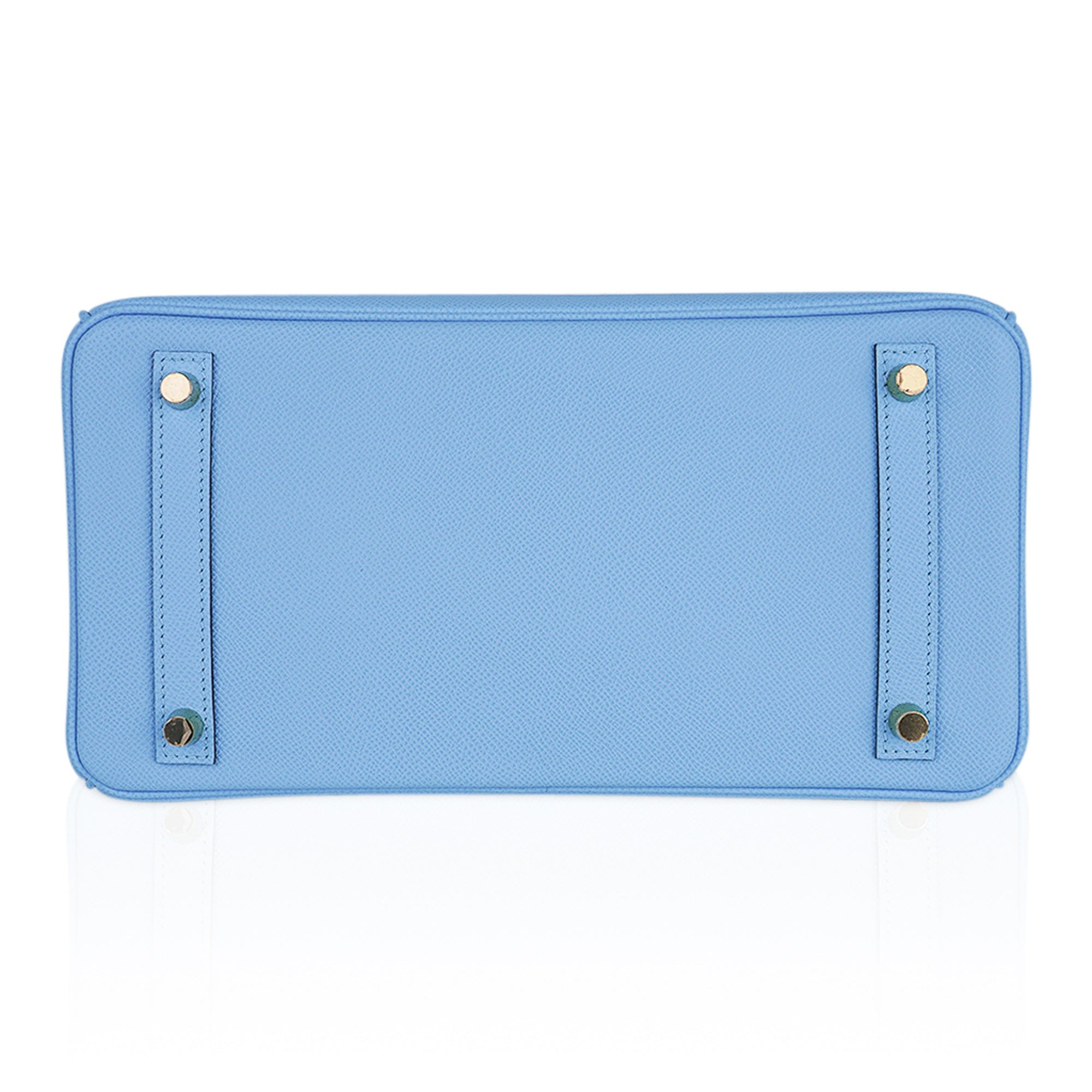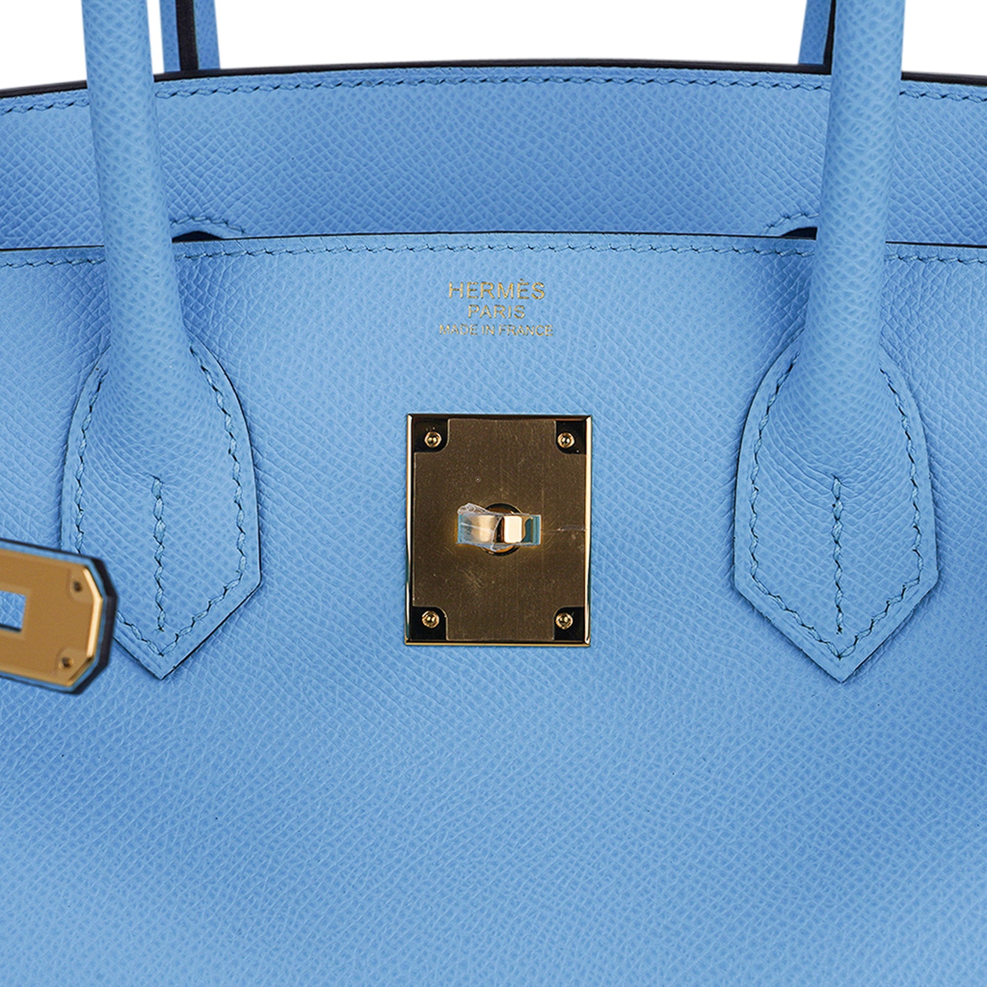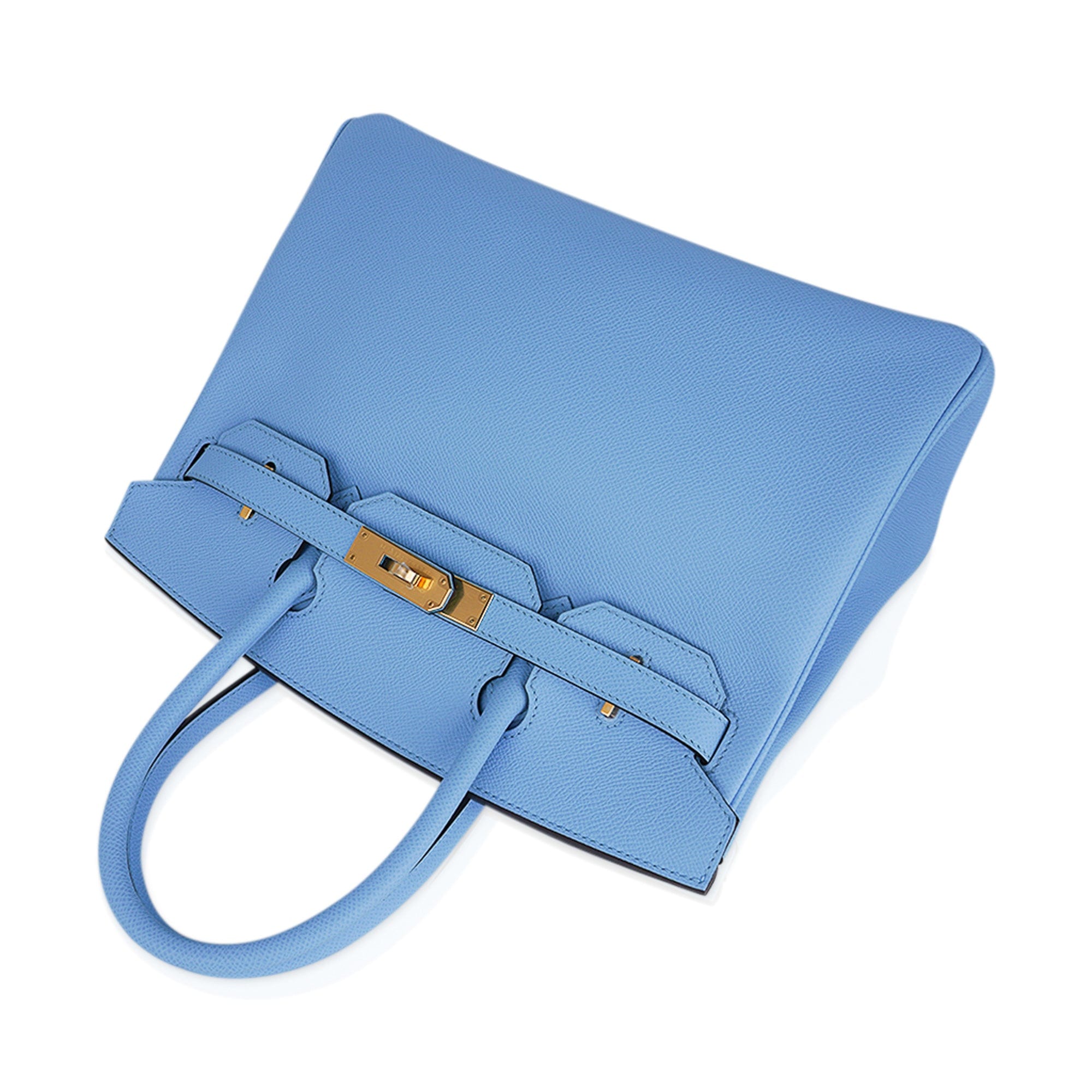 Guaranteed authentic Hermes Birkin 30 bag featured in rare Blue Celeste.