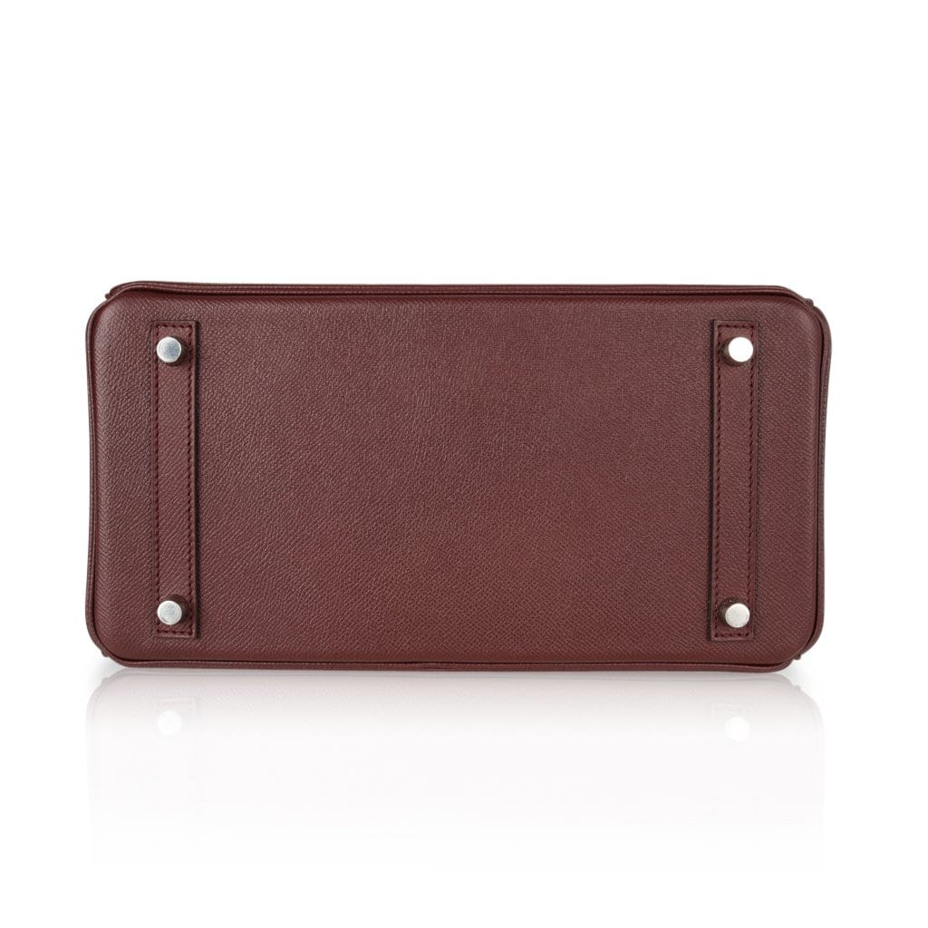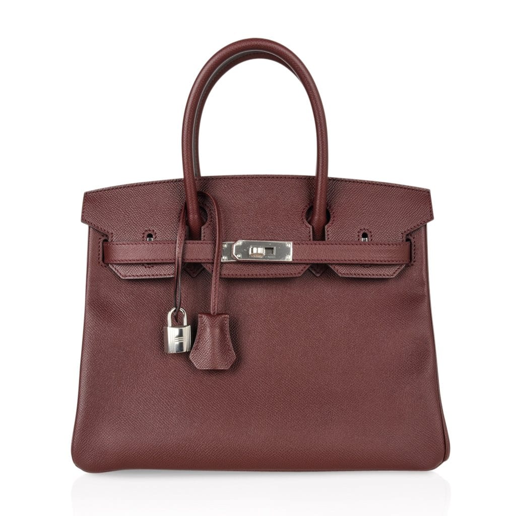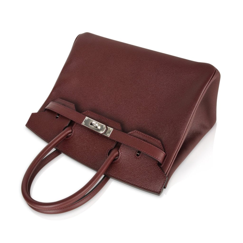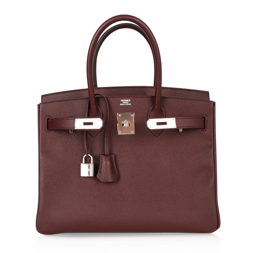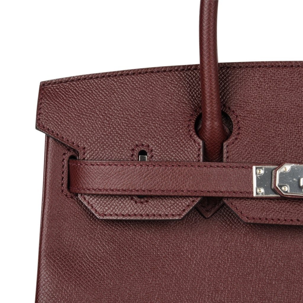 Guaranteed authentic Hermes Birkin 30 bag features rich Bordeaux in epsom leather.