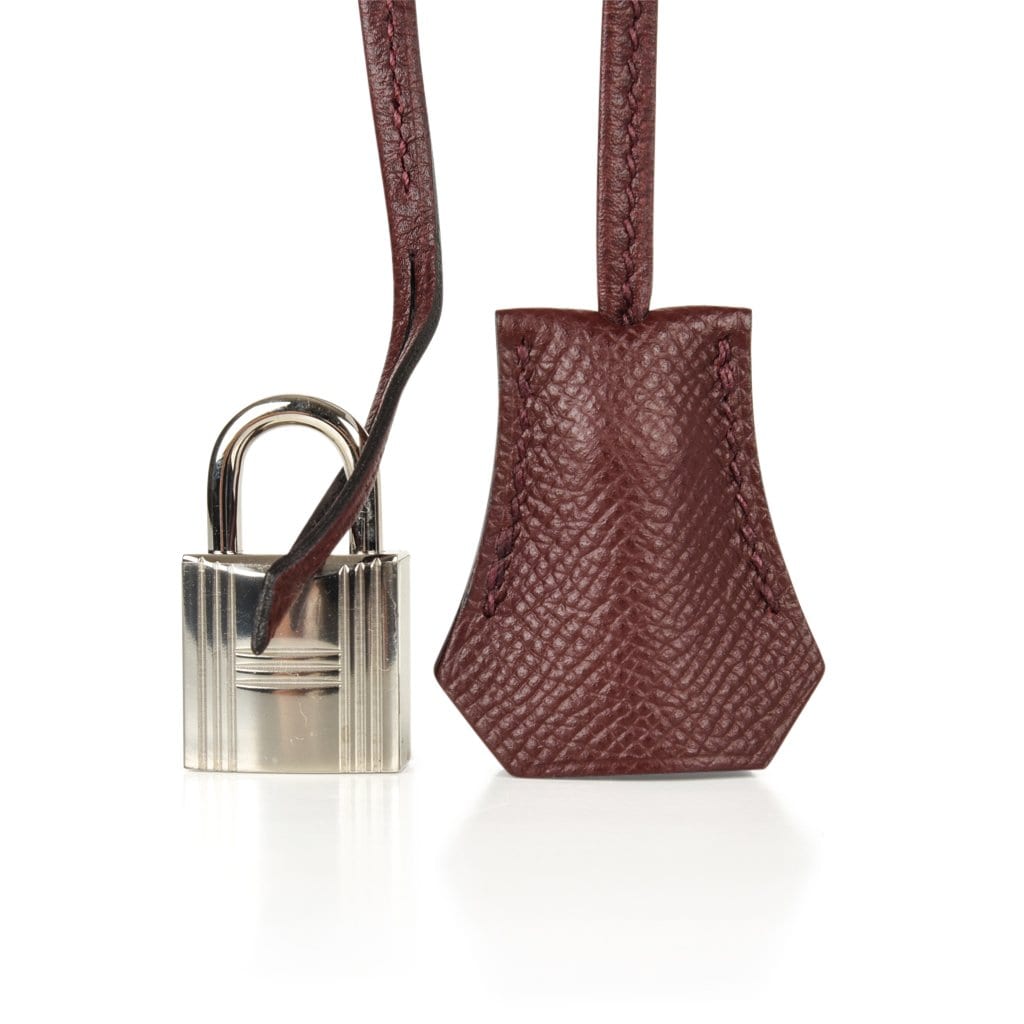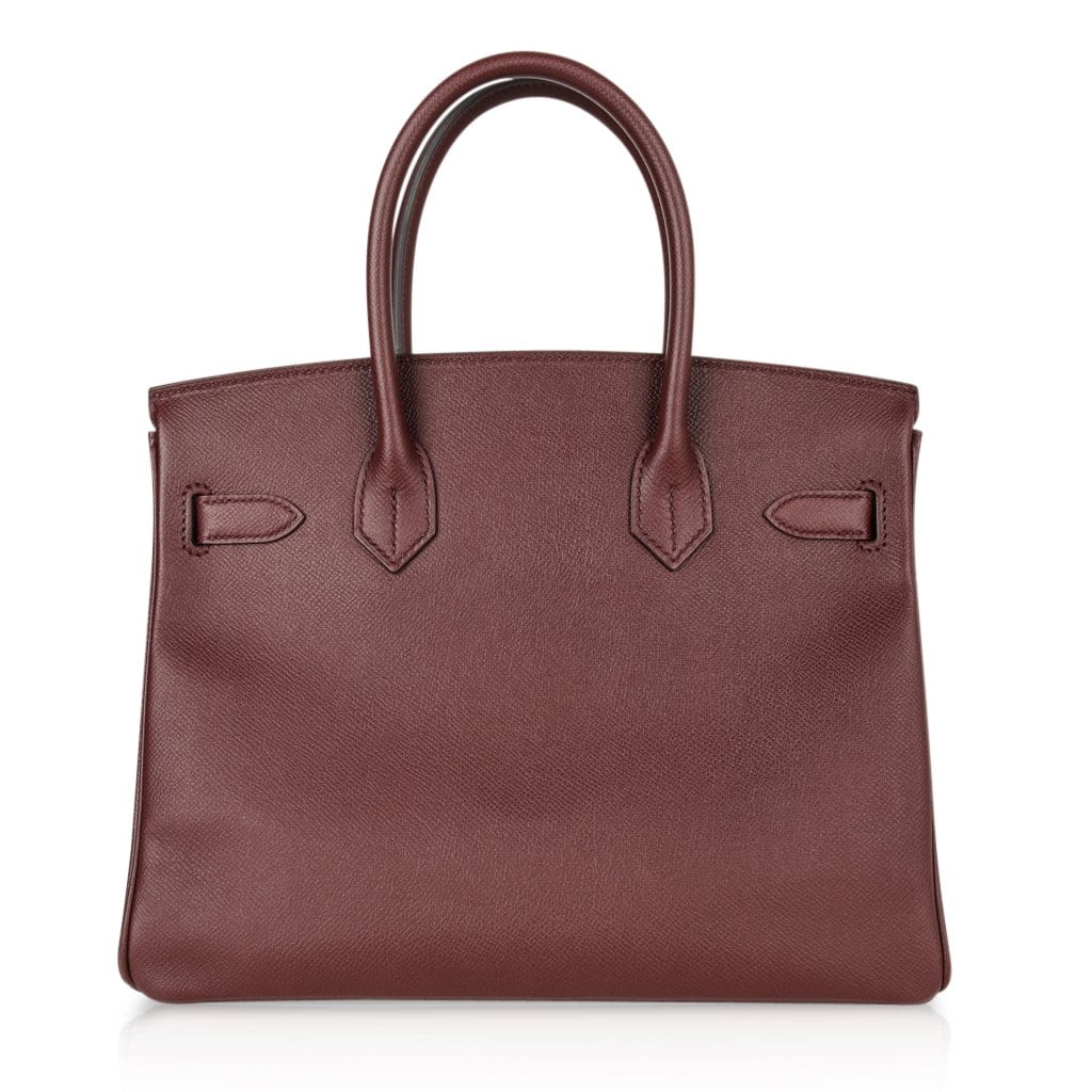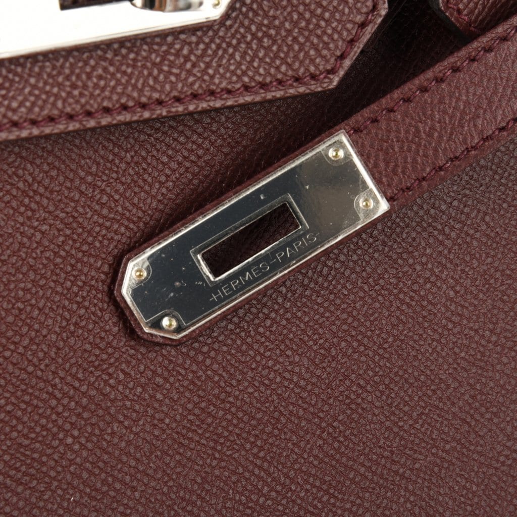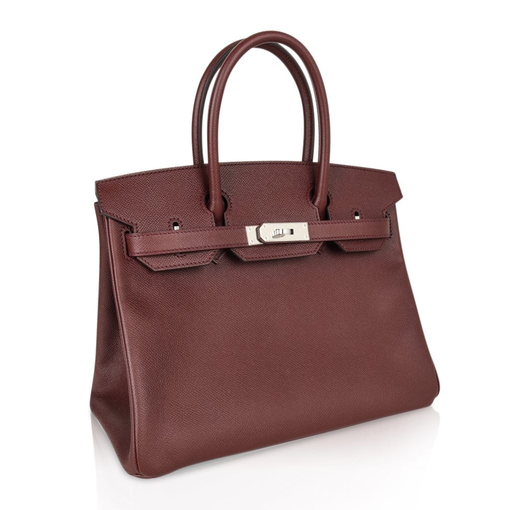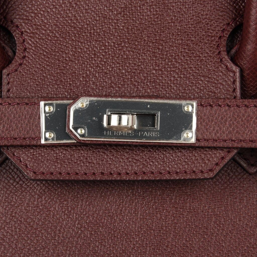 Guaranteed authentic Hermes Birkin 30 bag features rich Bordeaux in epsom leather.