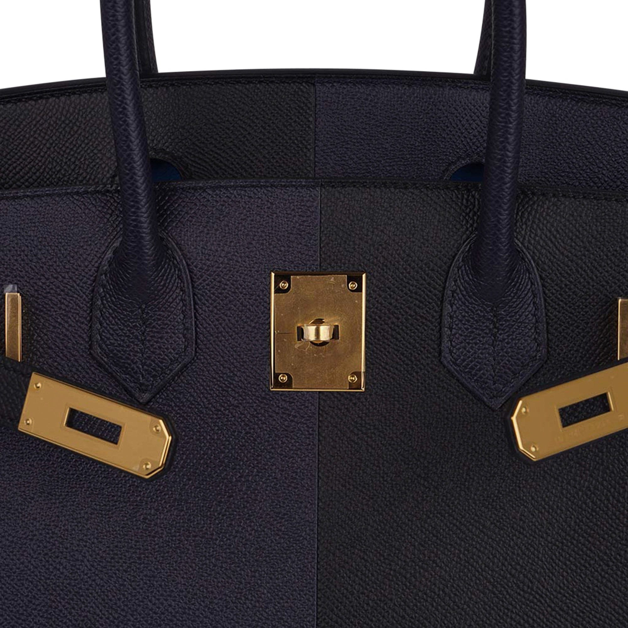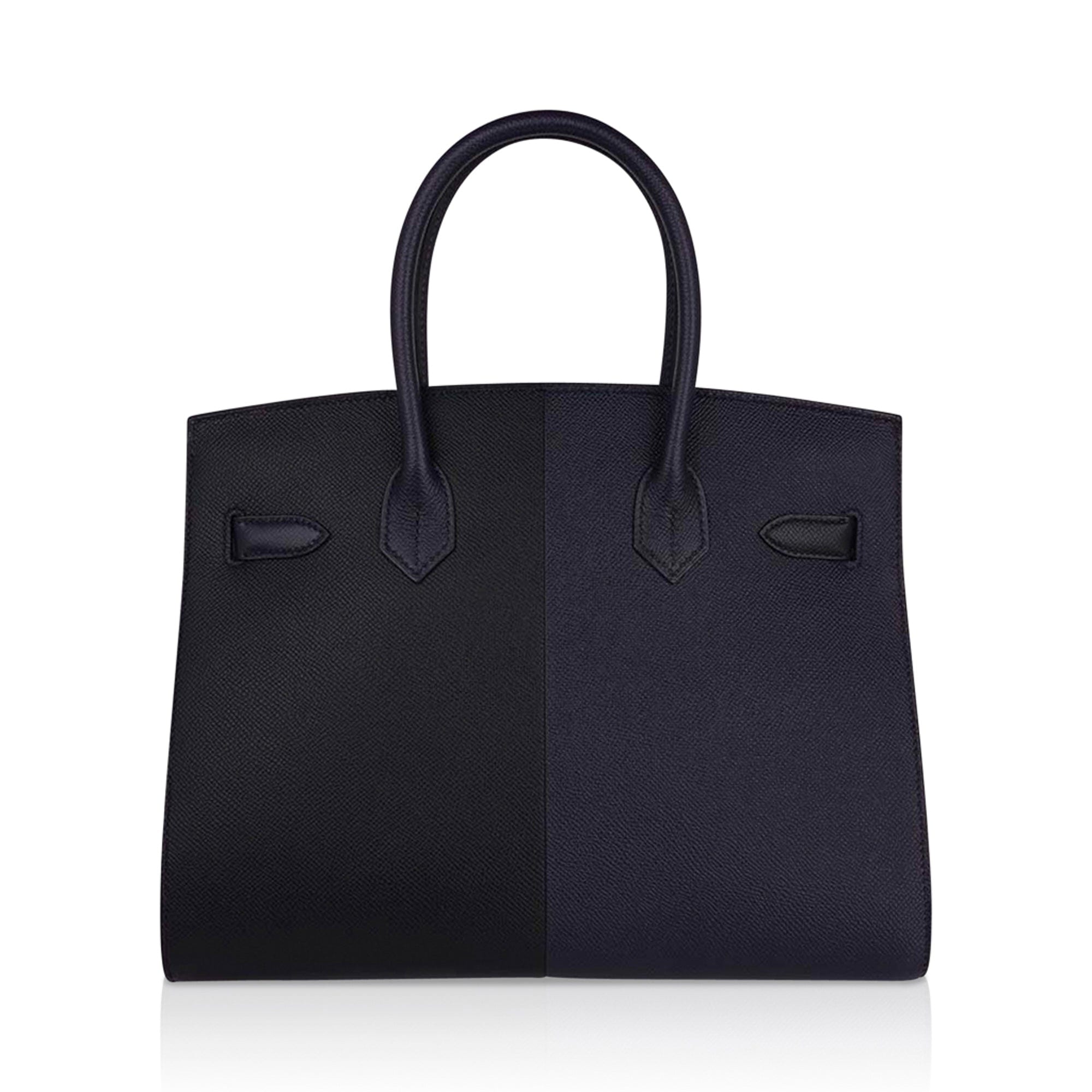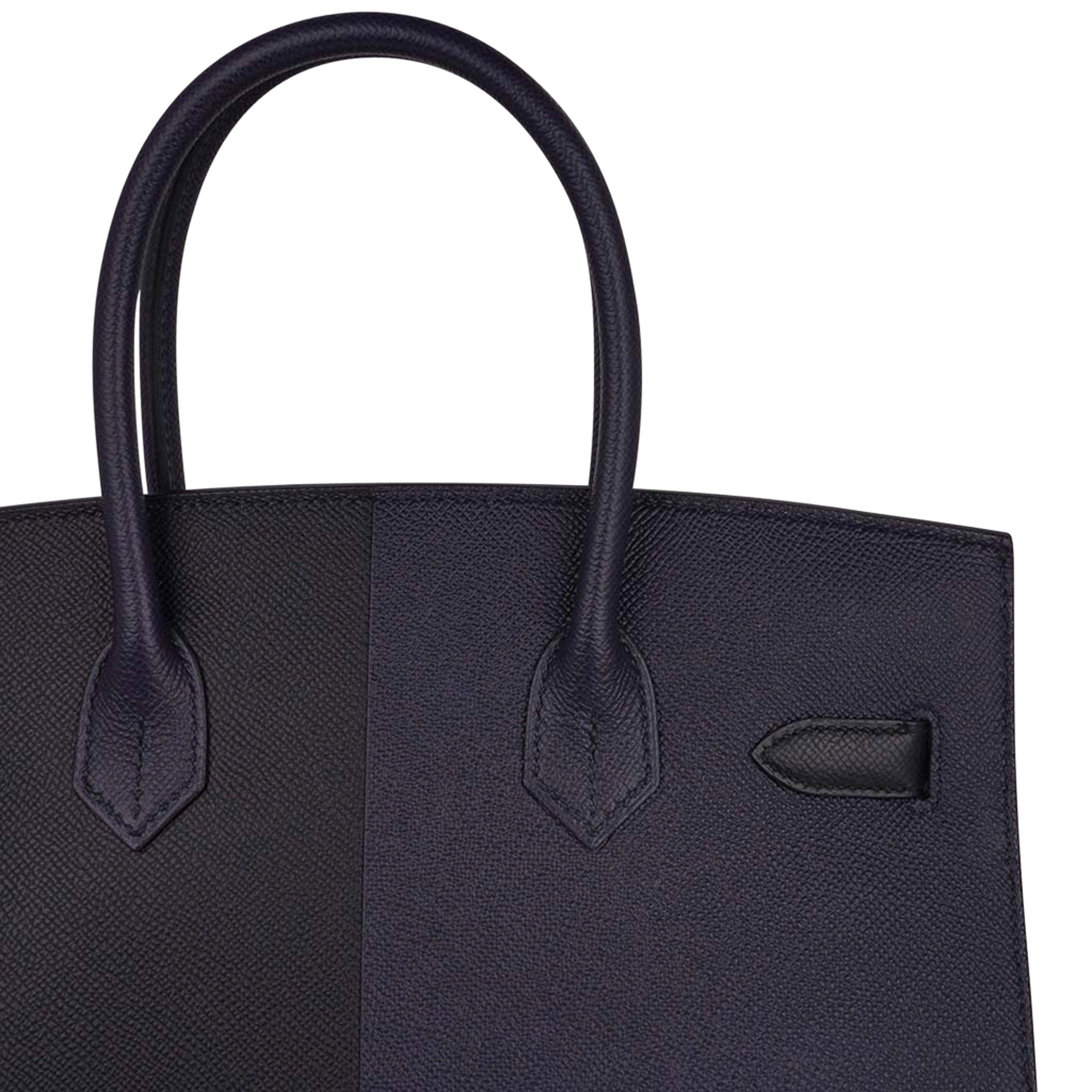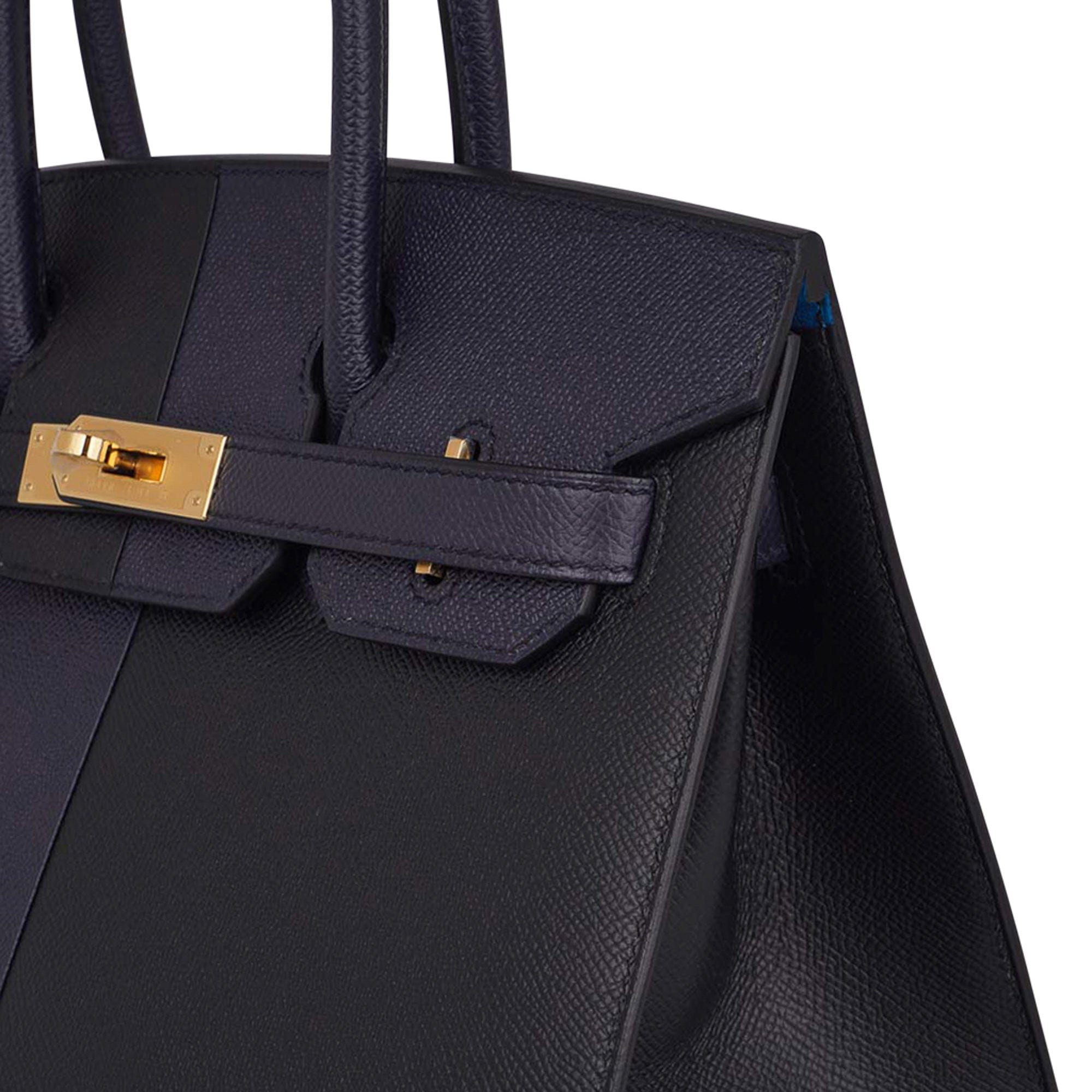 Guaranteed authentic limited edition Hermes Birkin Sellier Casaque 30 tri-colour bag featured in Black and Blue Indigo.