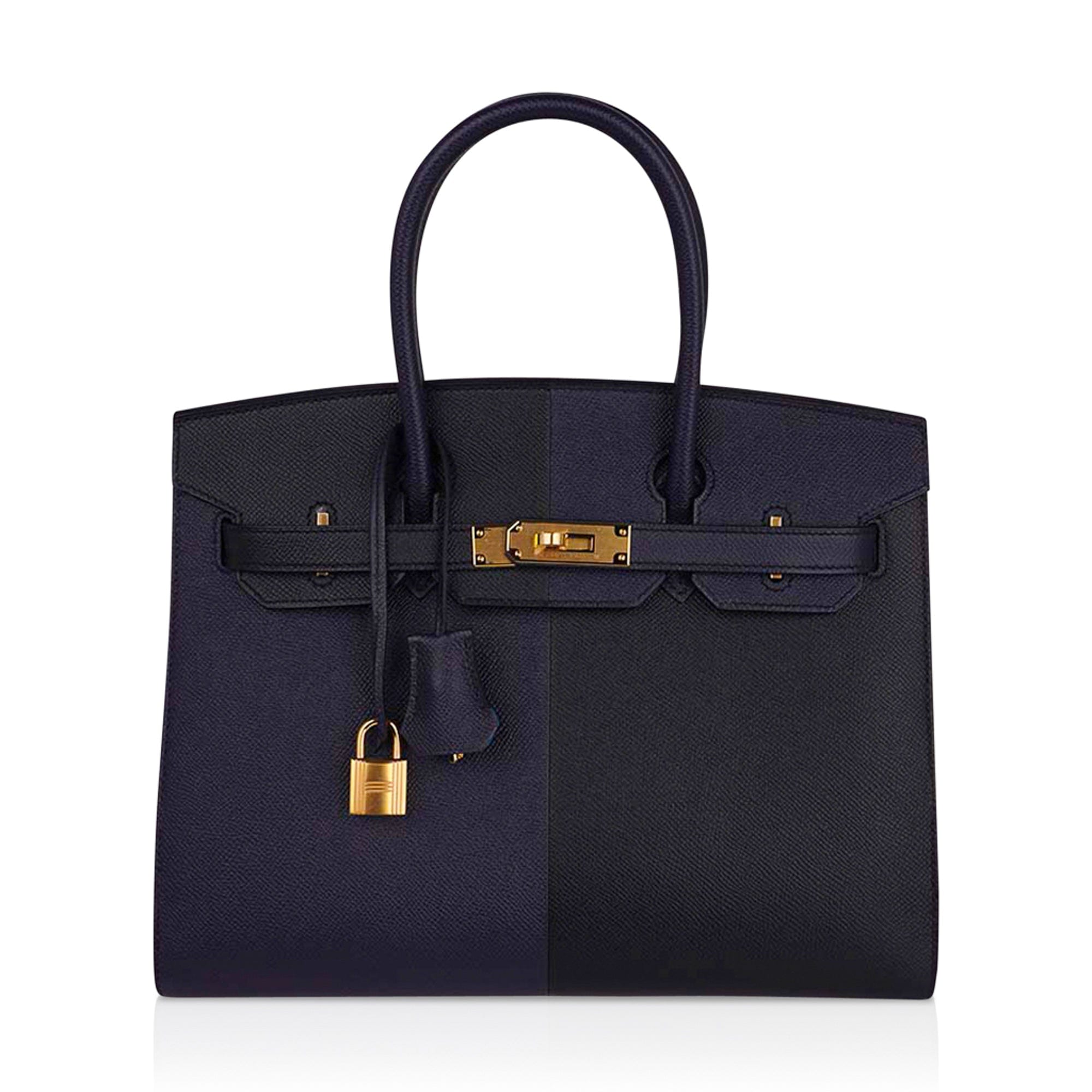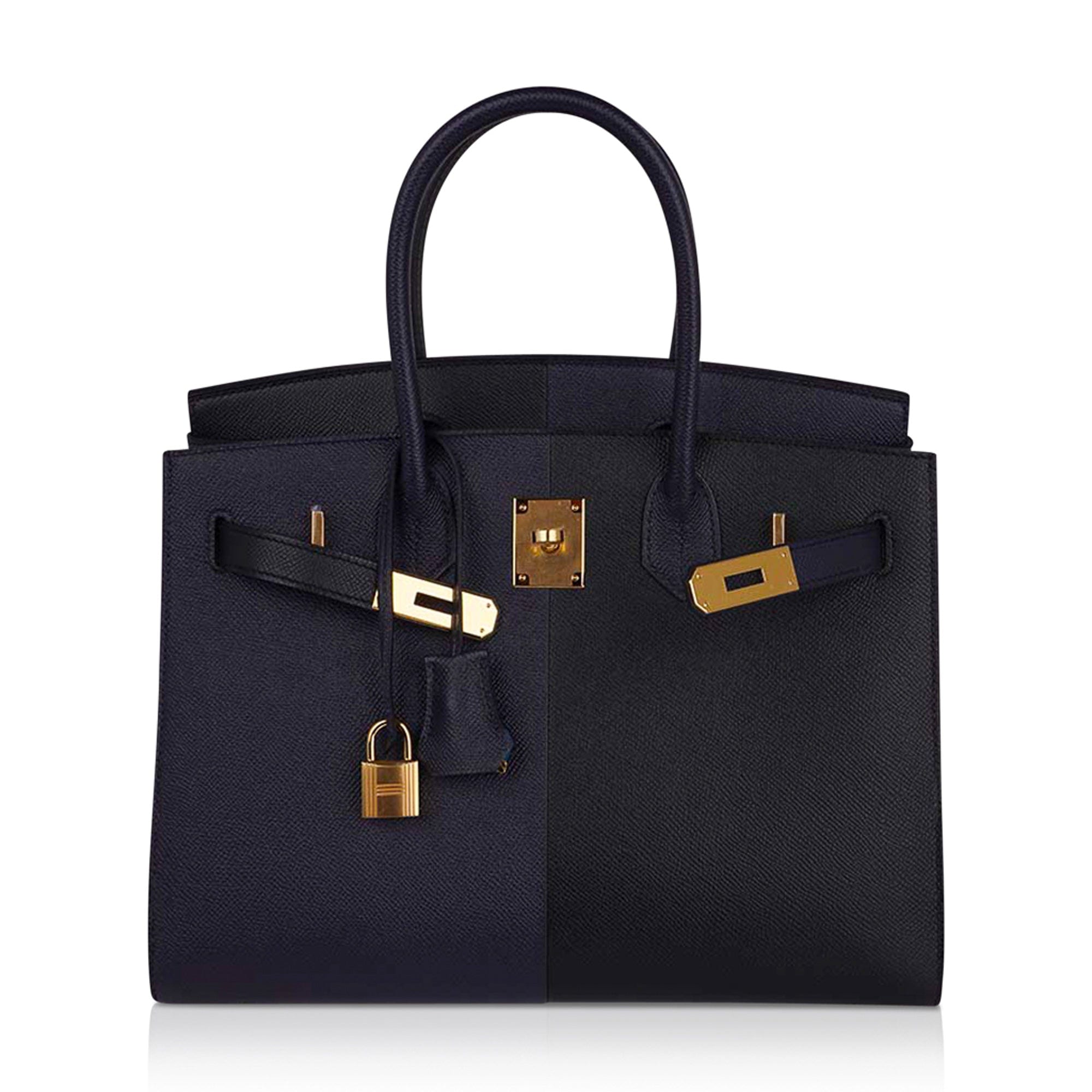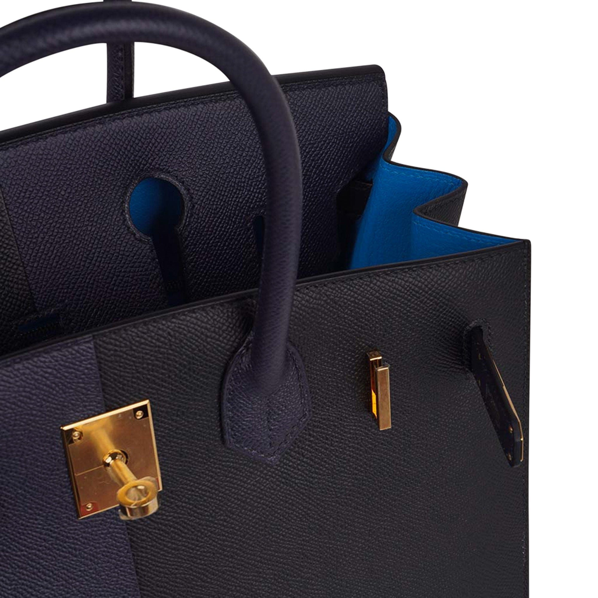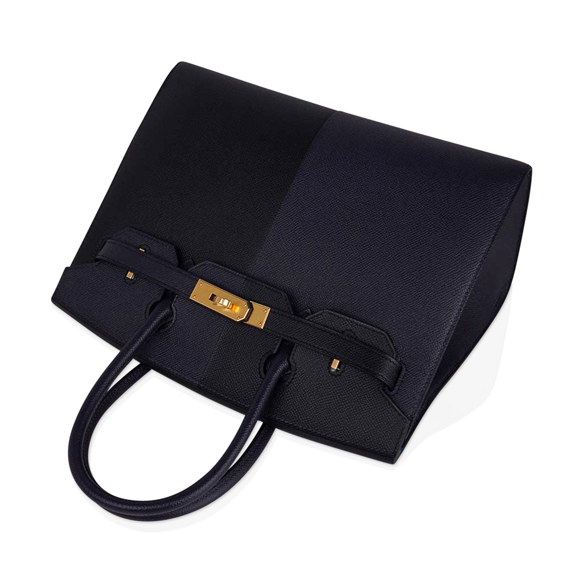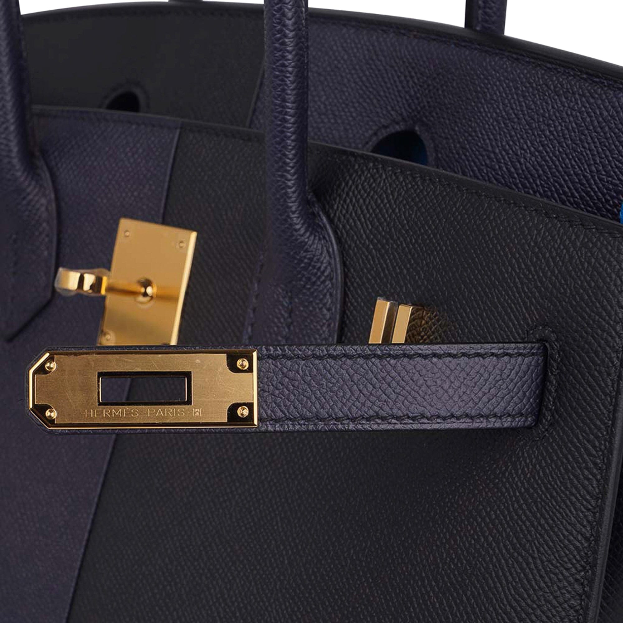 Guaranteed authentic limited edition Hermes Birkin Sellier Casaque 30 tri-colour bag featured in Black and Blue Indigo.
