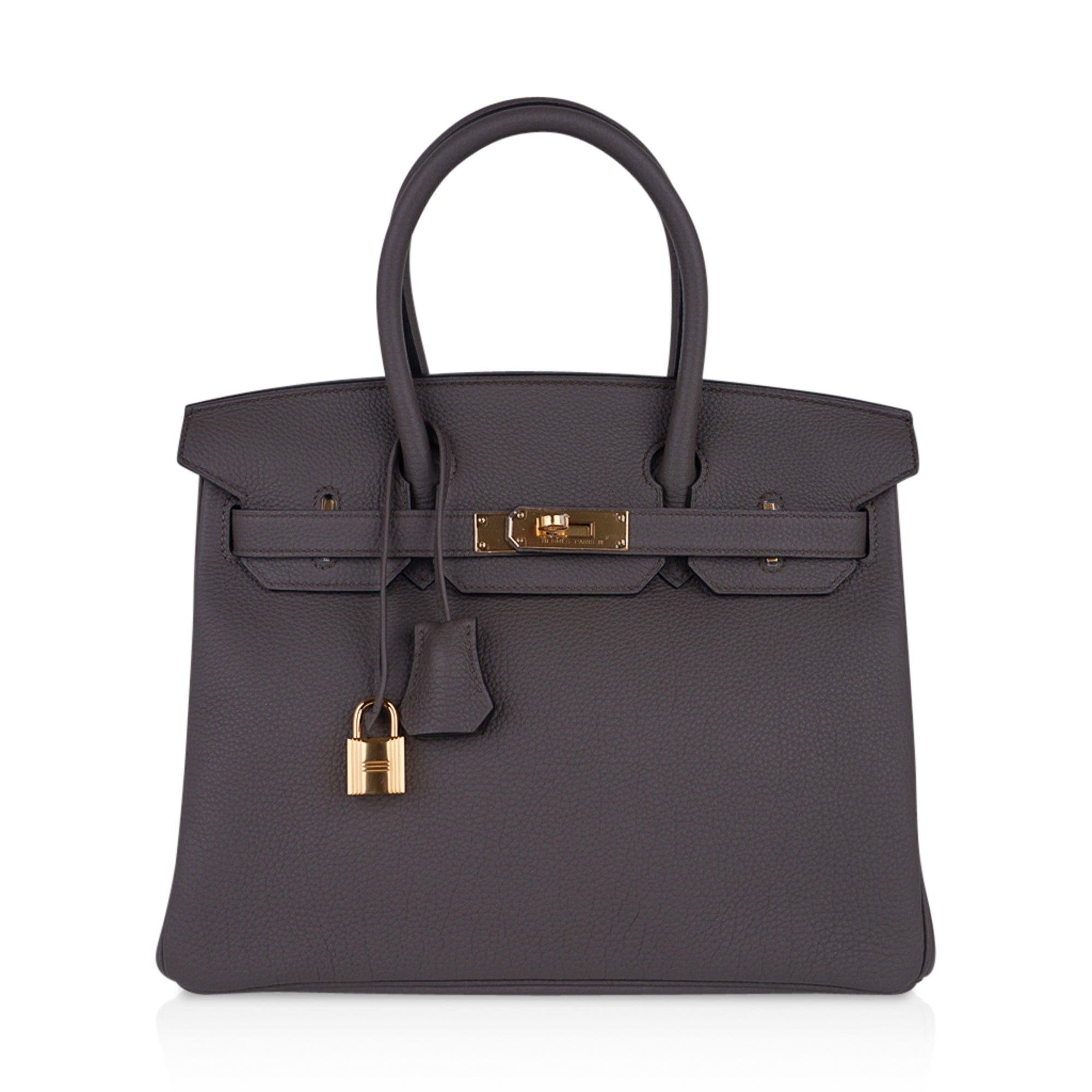 This collectible gray Birkin bag in soft supple Togo leather is exquisite with gold hardware.