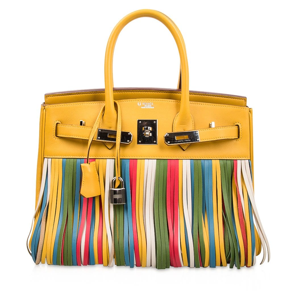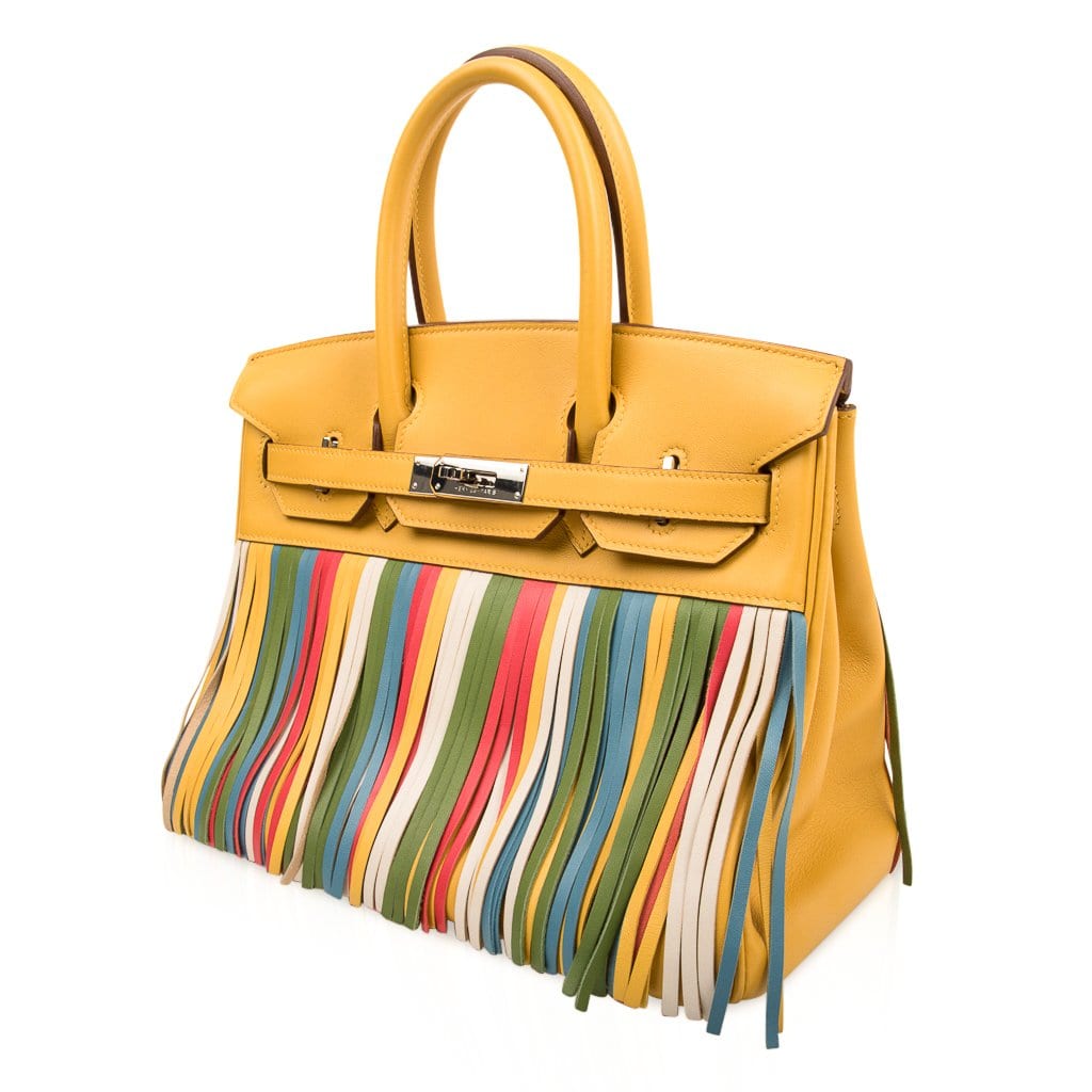 White, blue, yellow, green and red fringe creates this stunning limited edition special order Hermes birkin bag collectors treasure.