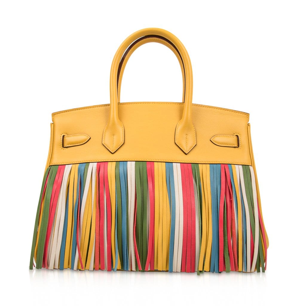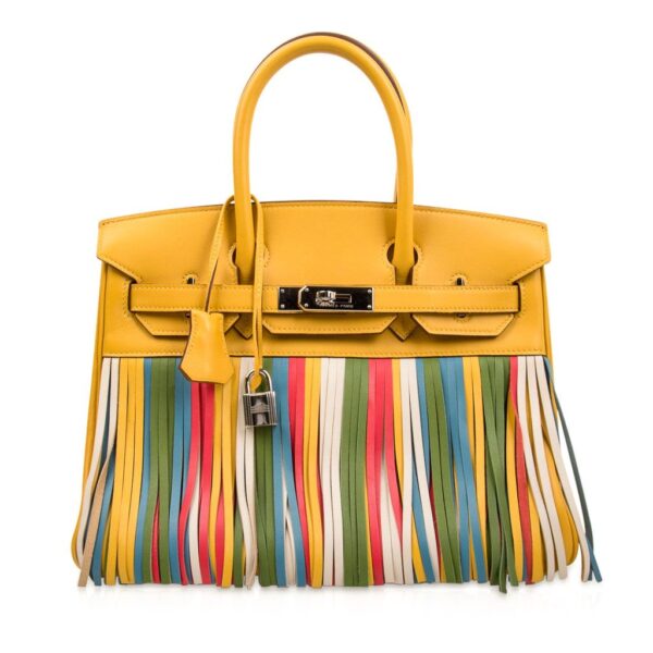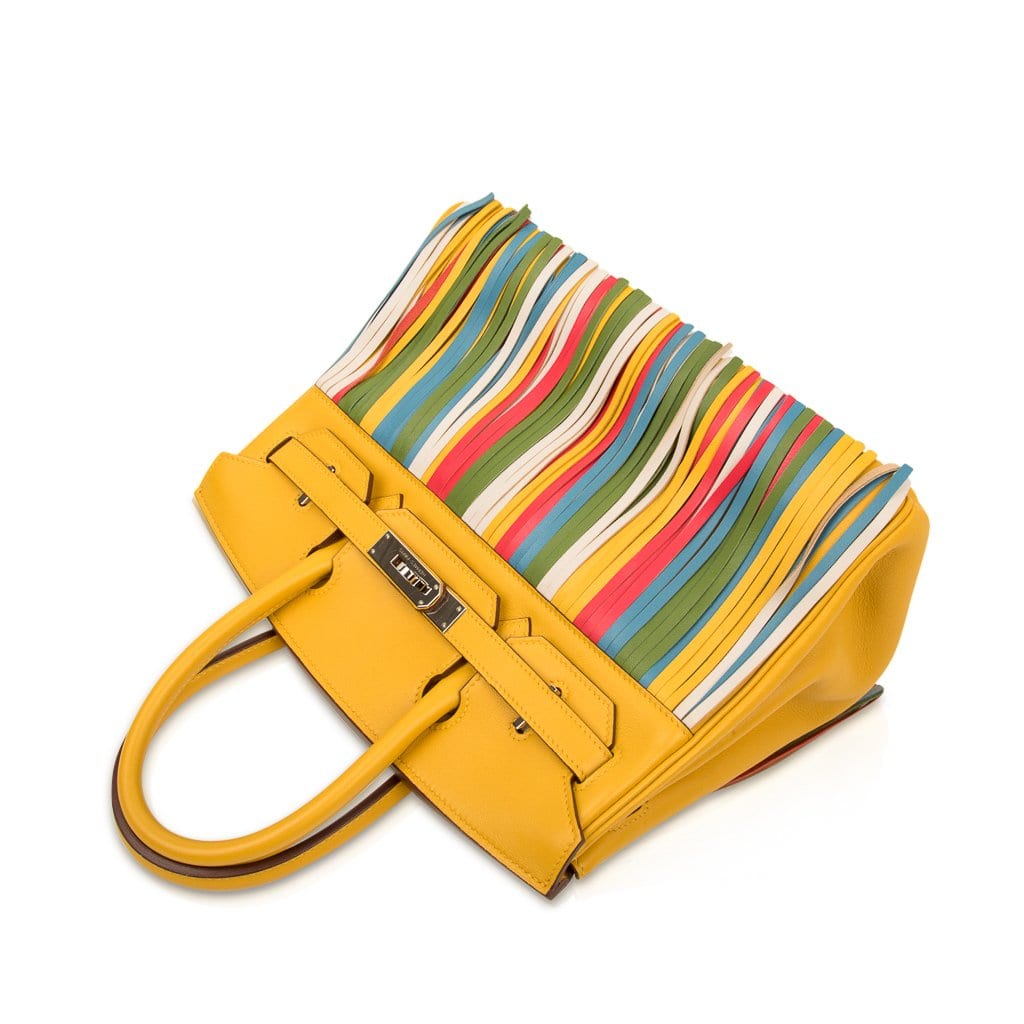 Guaranteed authentic Hermes Birkin 30 HSS bag features rare Soleil yellow with the very rare multi colour fringe.