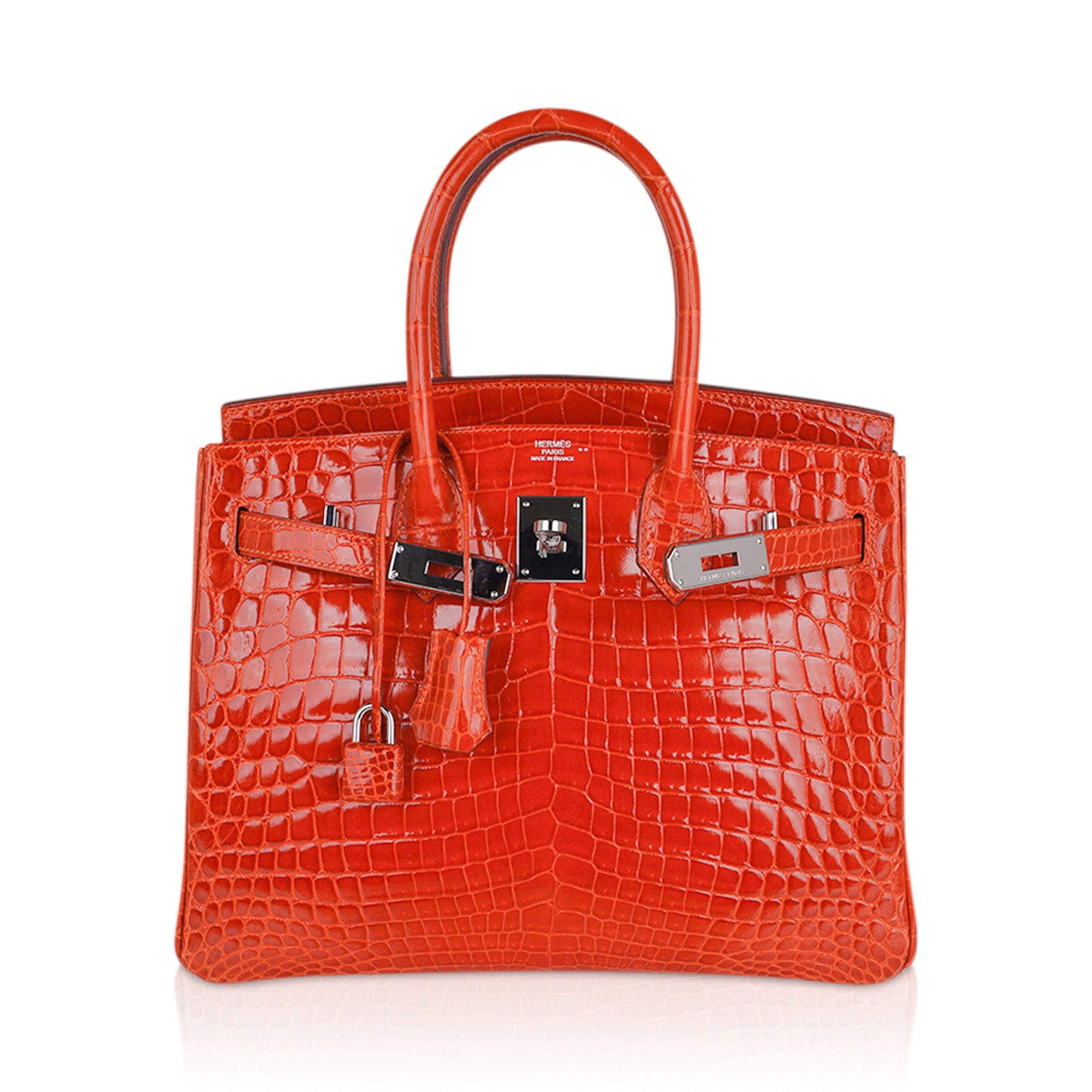 Guaranteed authentic Niloticus Crocodile Hermes Birkin 30 bag featured in Orange.