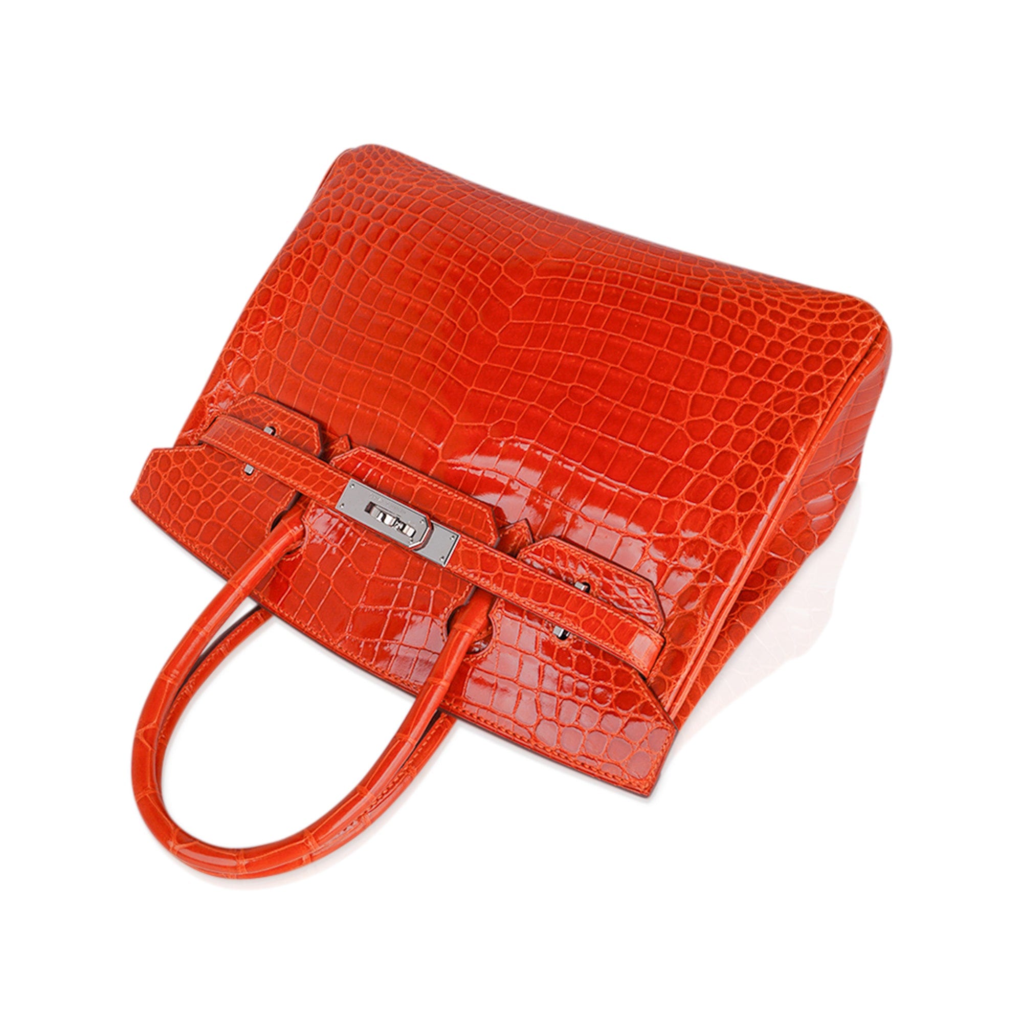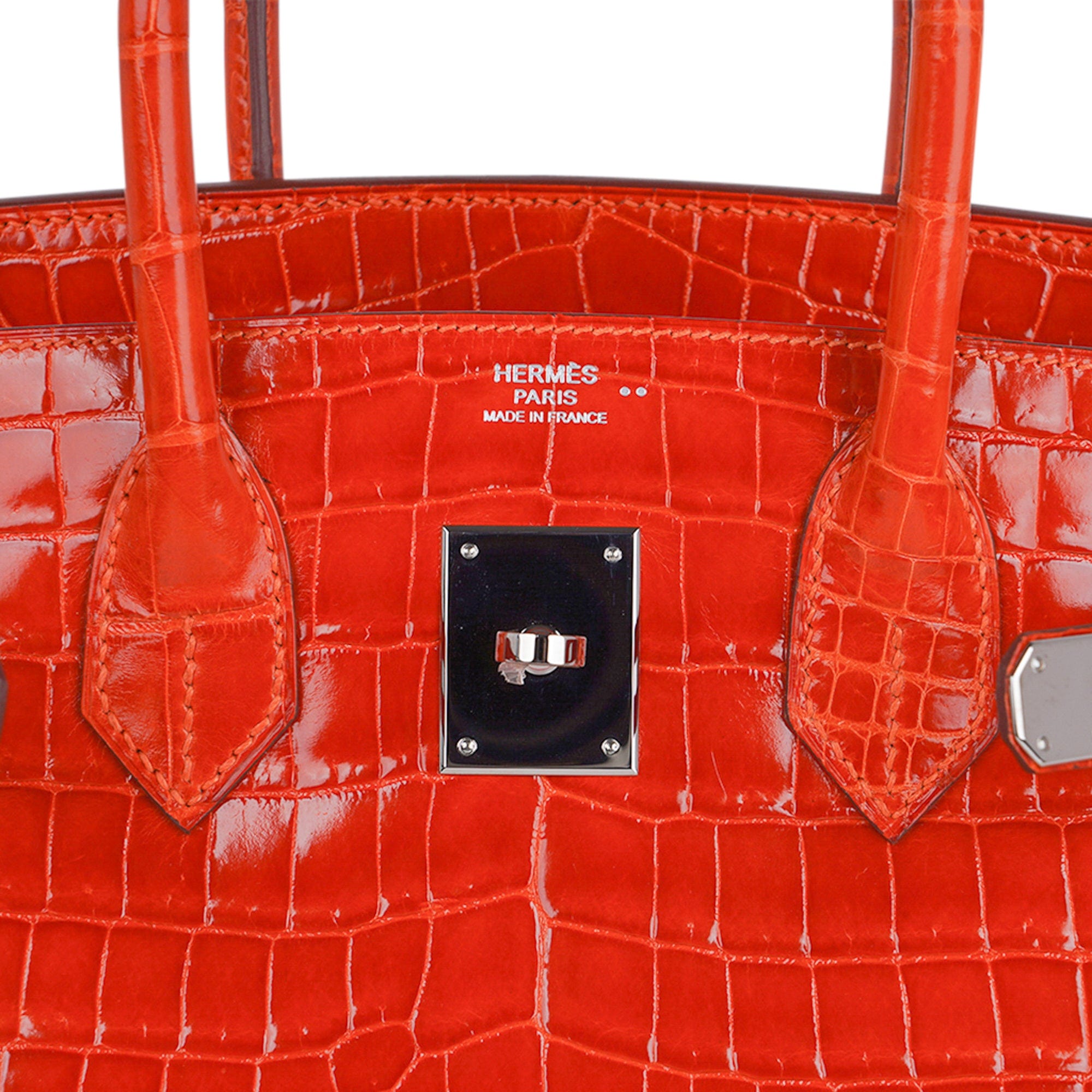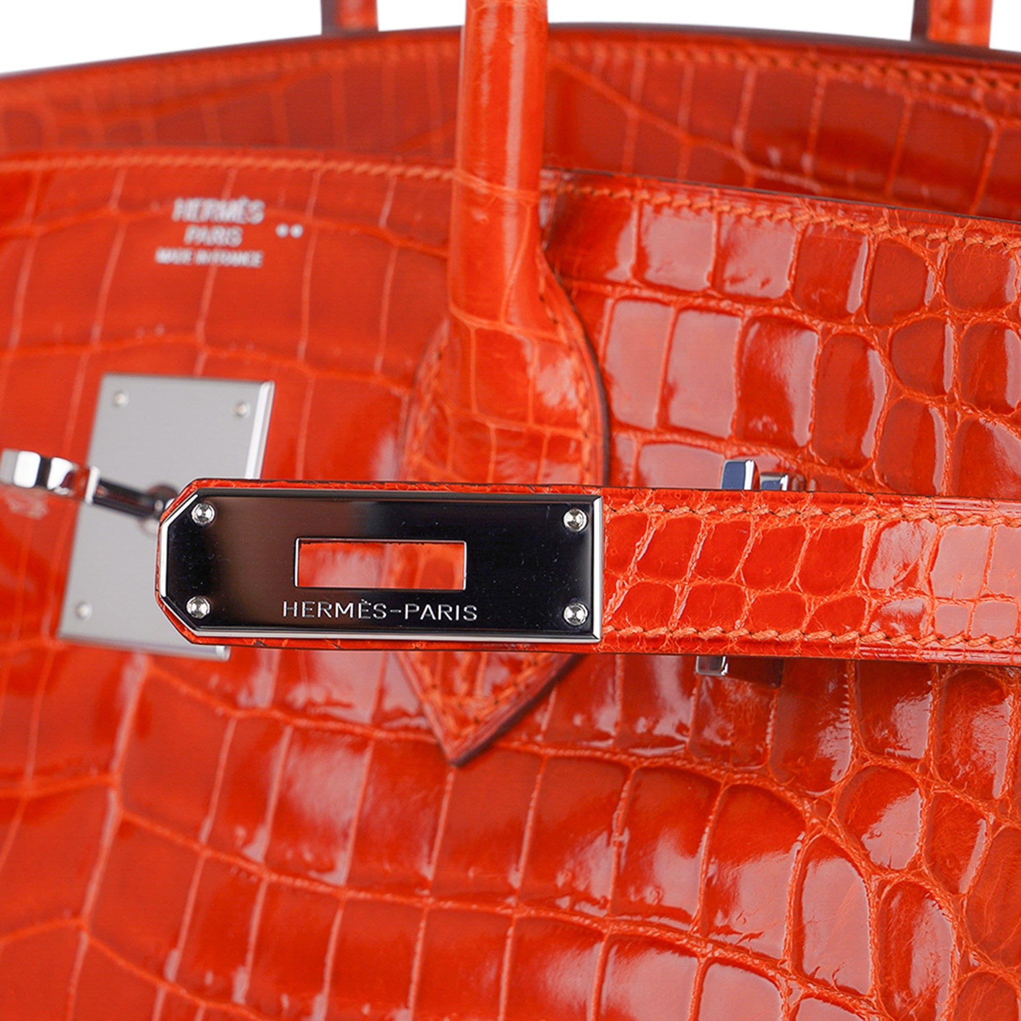 Fresh palladium hardware accentuates this gorgeous orange crocodile Hermes bag.