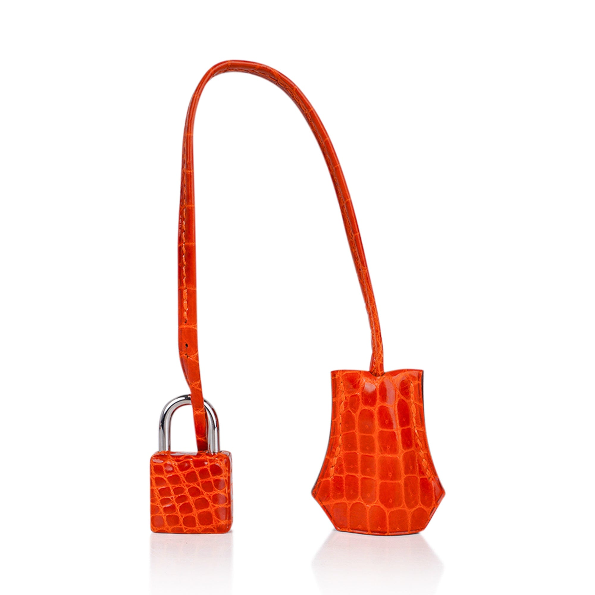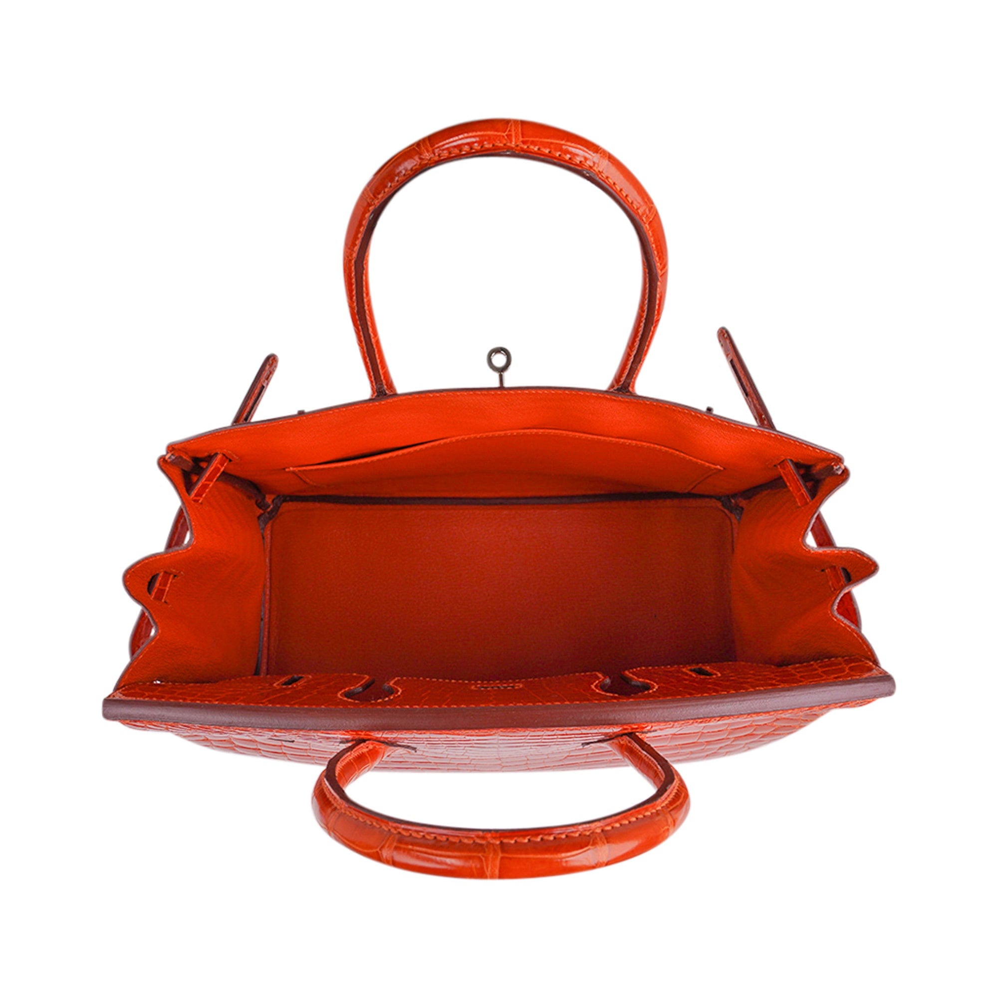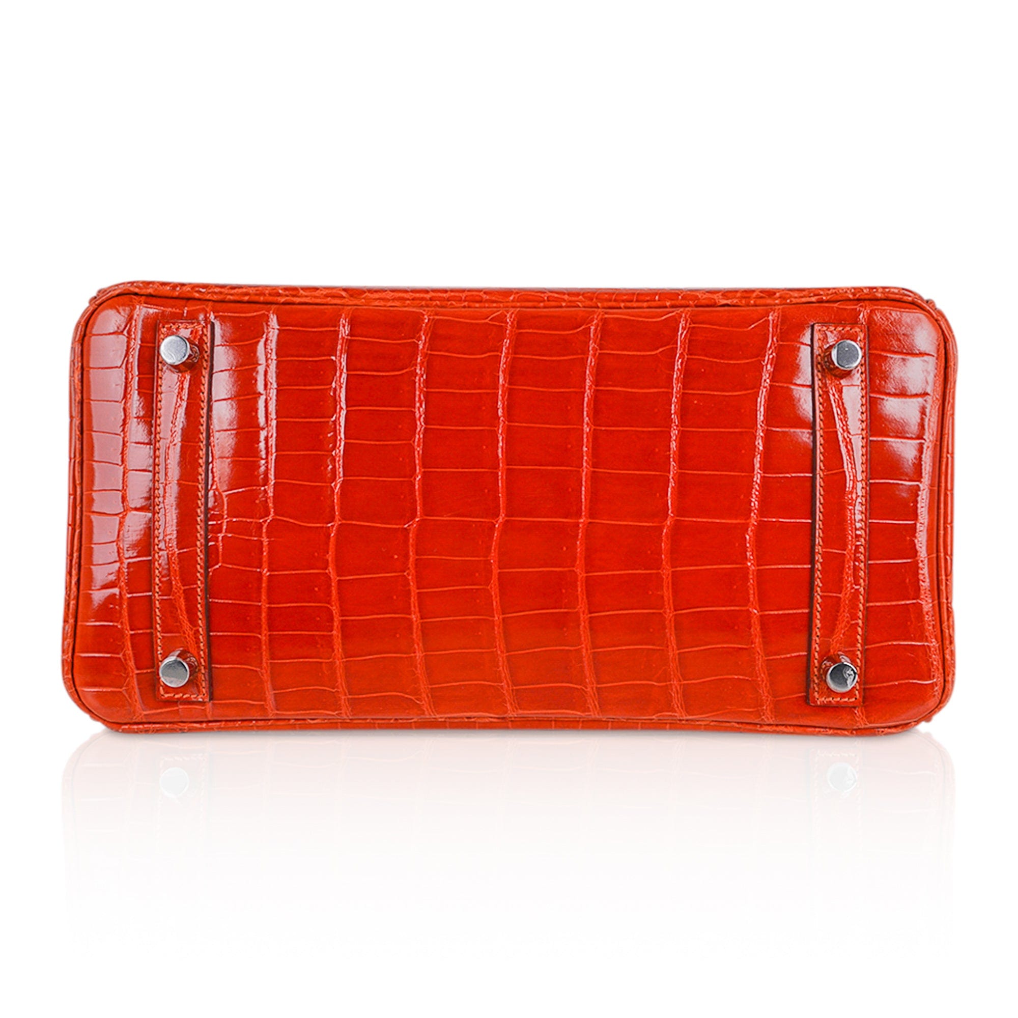 Fresh palladium hardware accentuates this gorgeous orange crocodile Hermes bag.