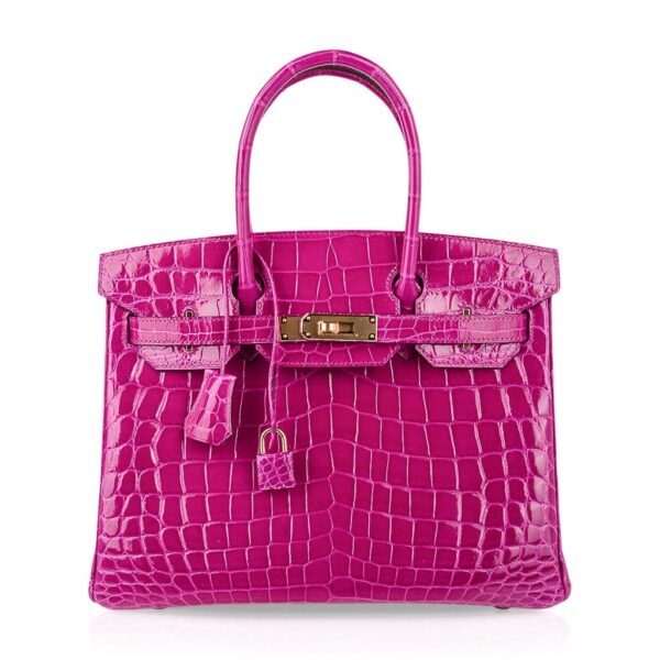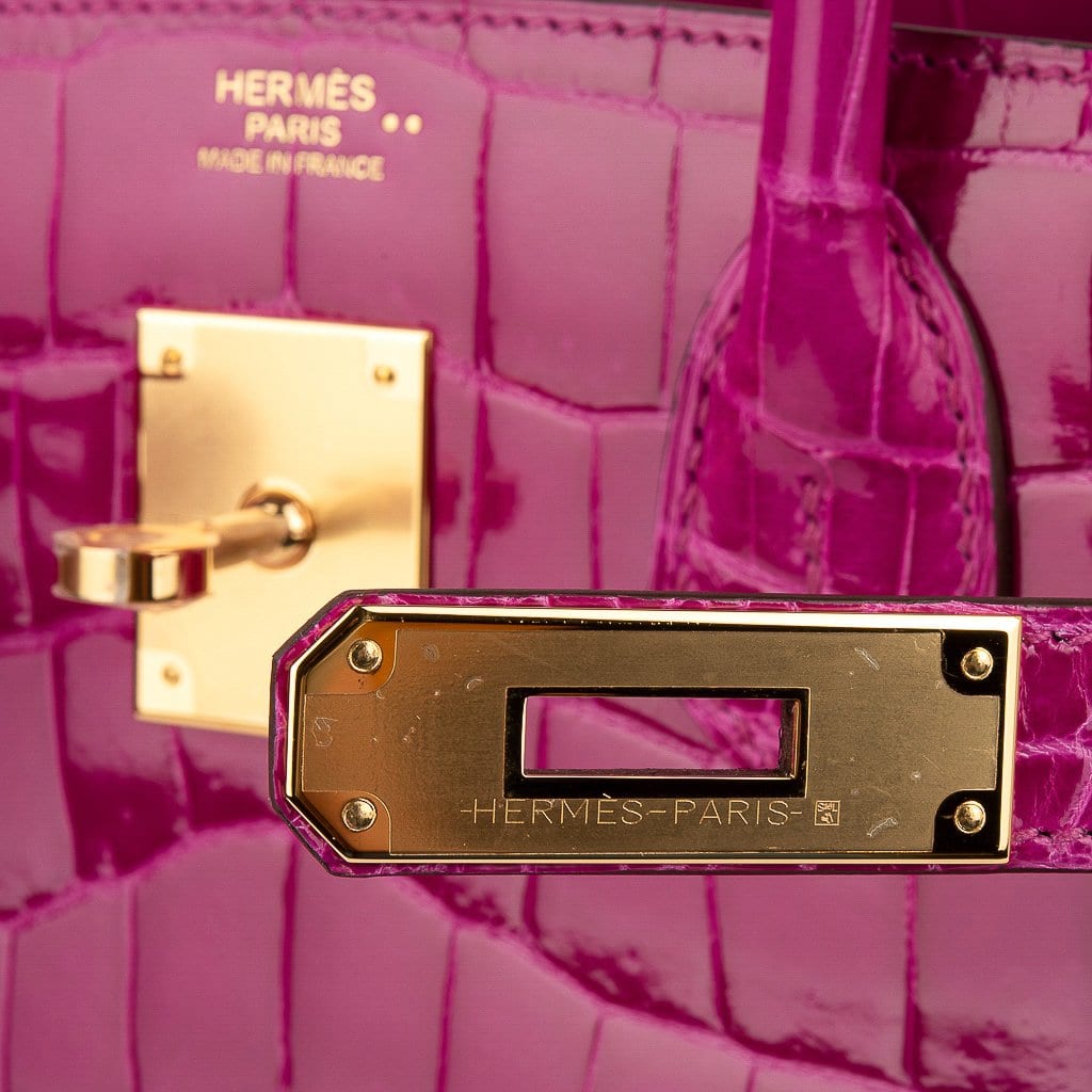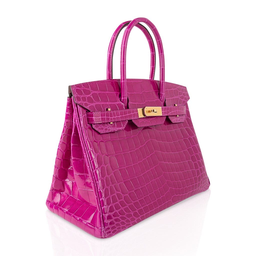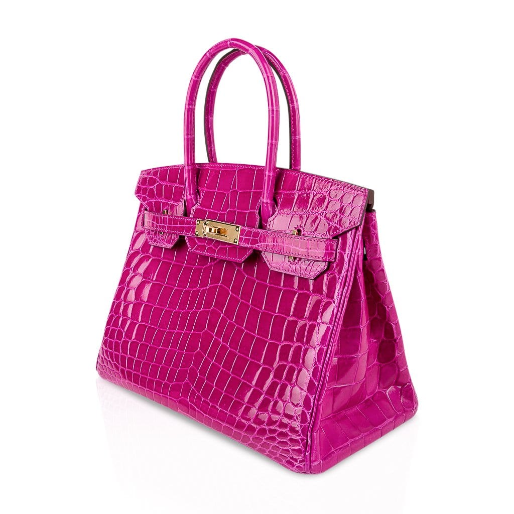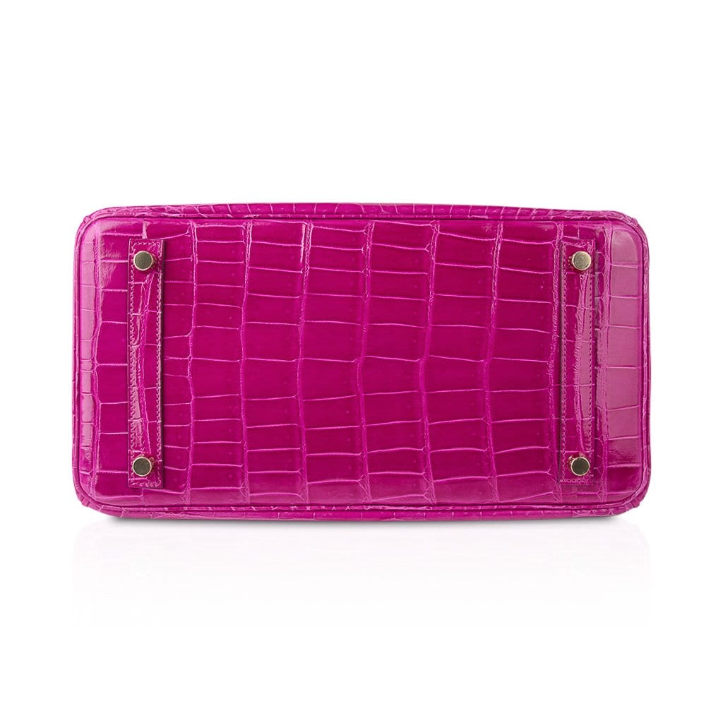 Guaranteed authentic Hermes Birkin 30 bag features vivid Rose Scheherazade Crocodile Lisse.