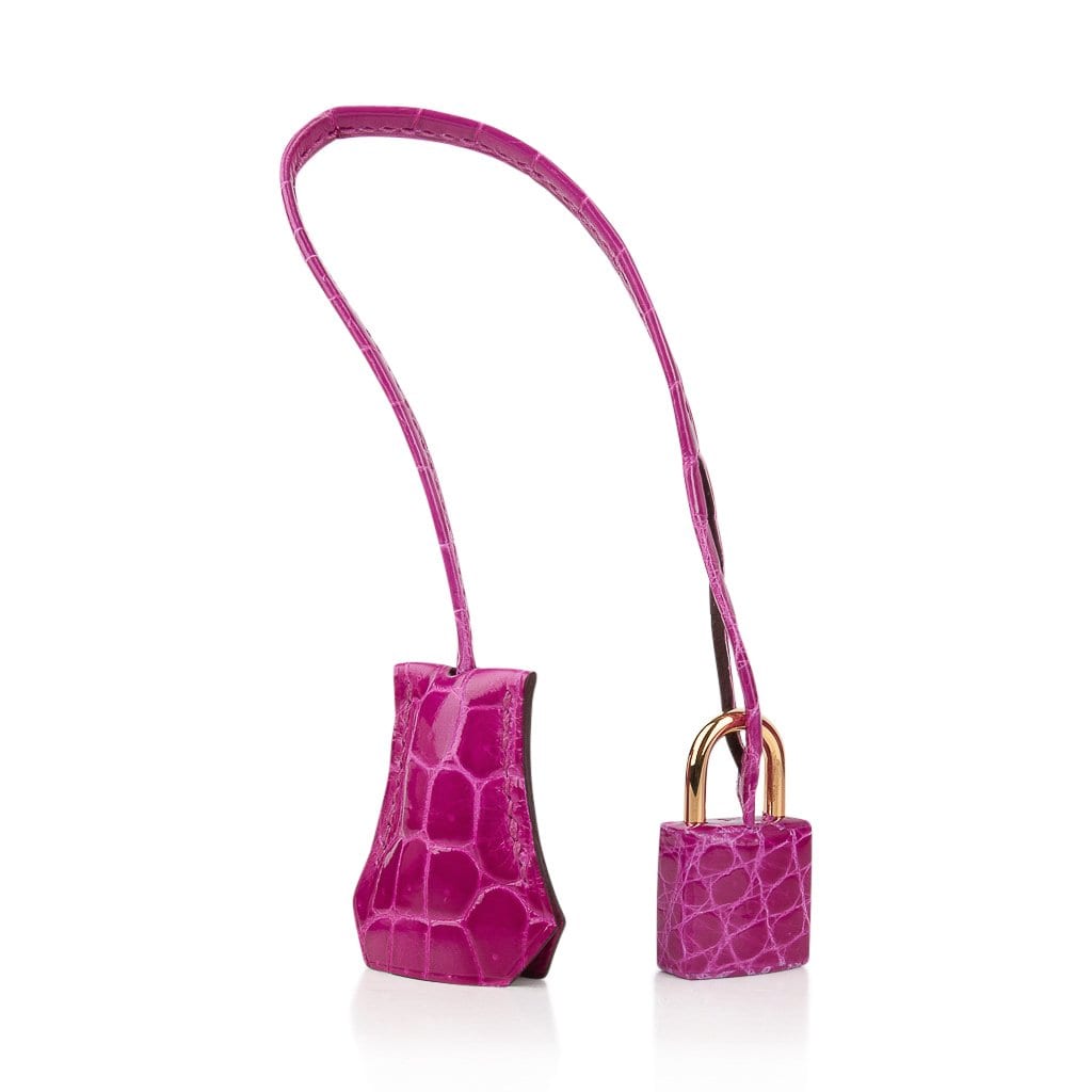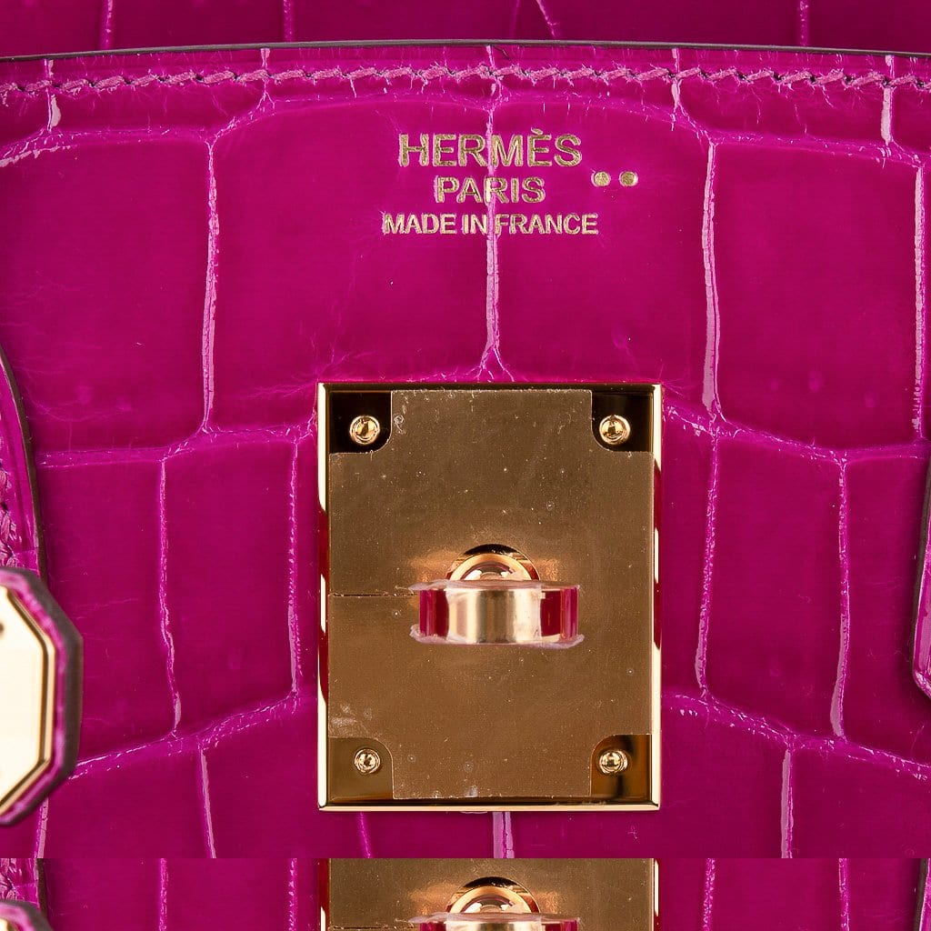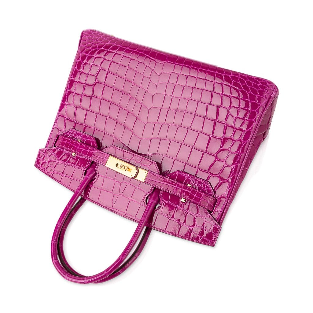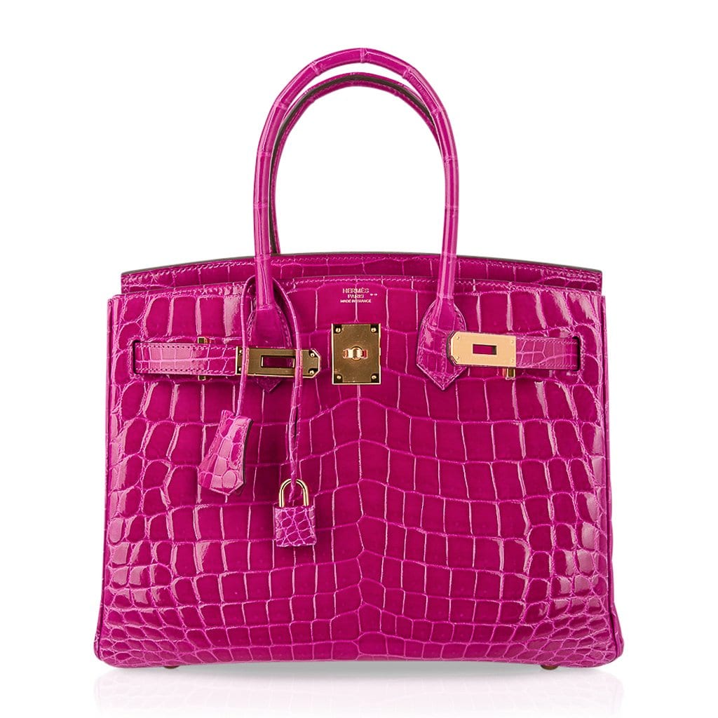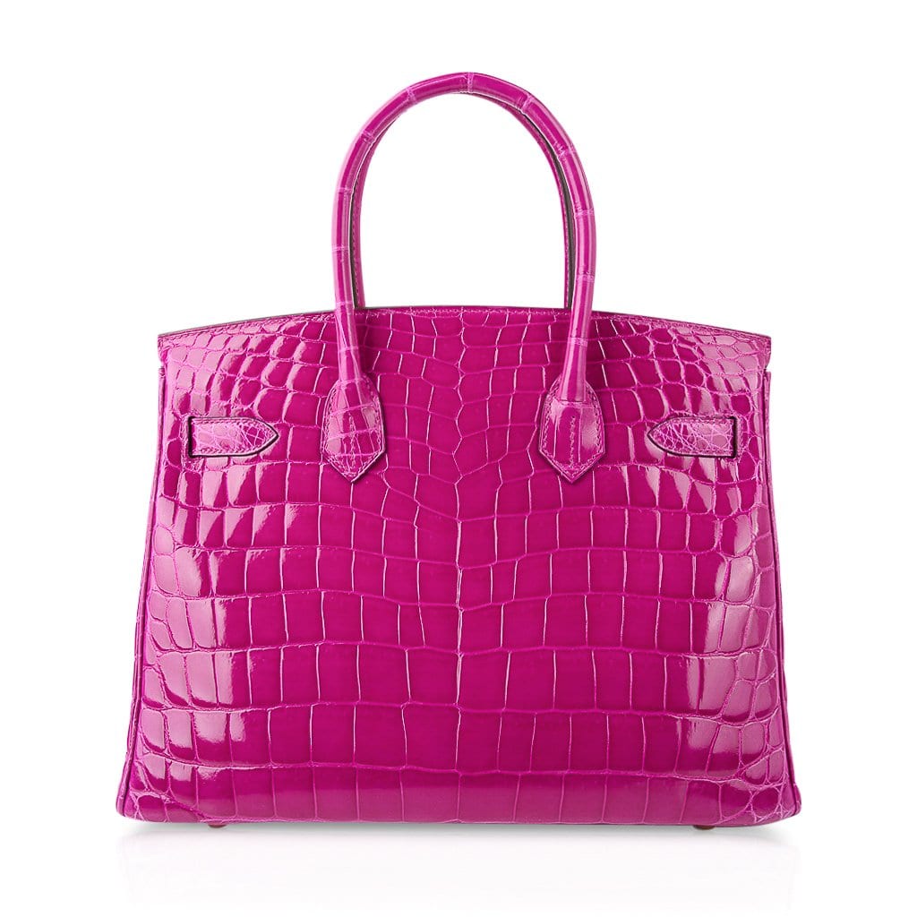 Guaranteed authentic Hermes Birkin 30 bag features vivid Rose Scheherazade Crocodile Lisse.