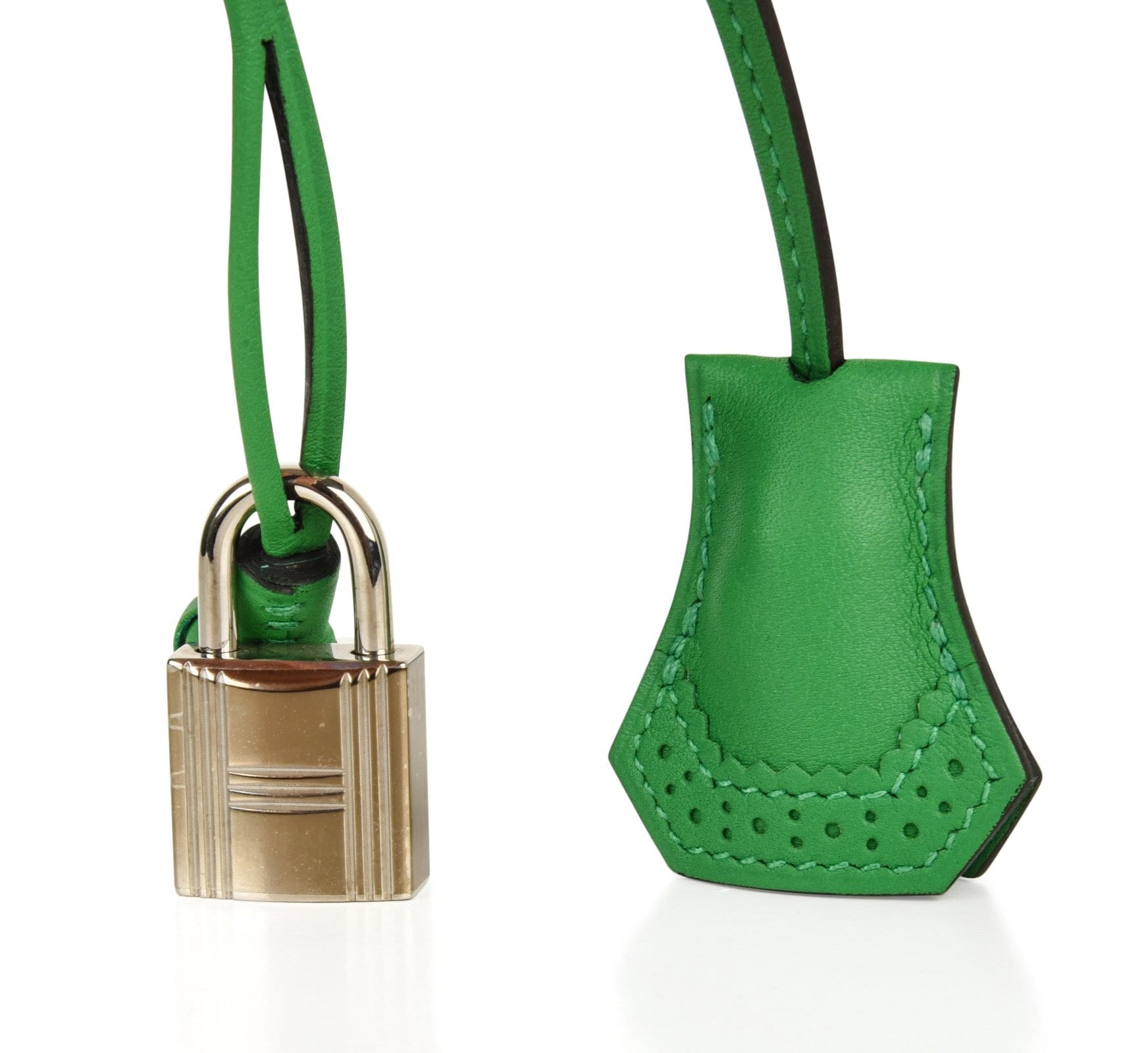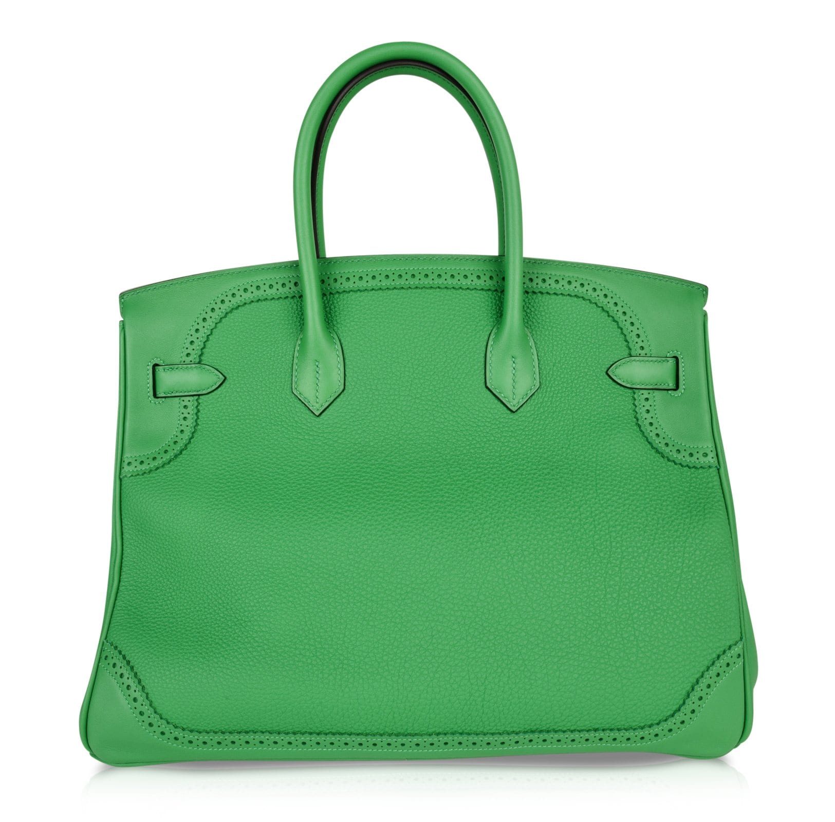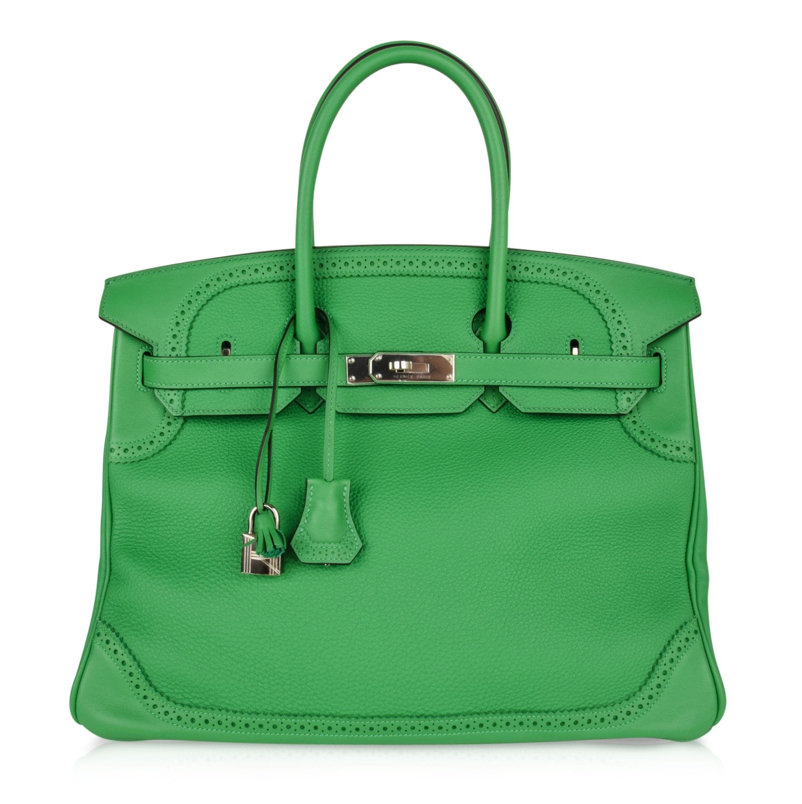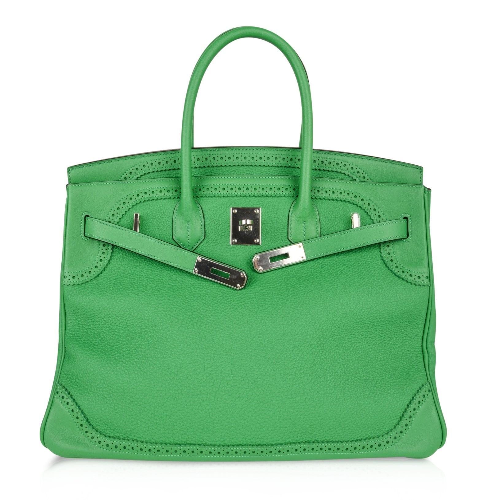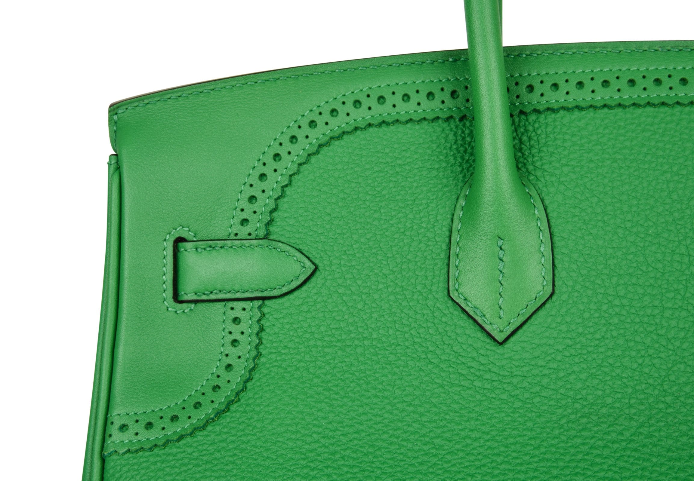 Guaranteed authentic Limited Edition Hermes Birkin 35 Ghillies bag in rare Bamboo Green.