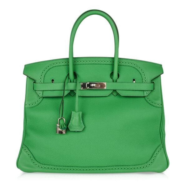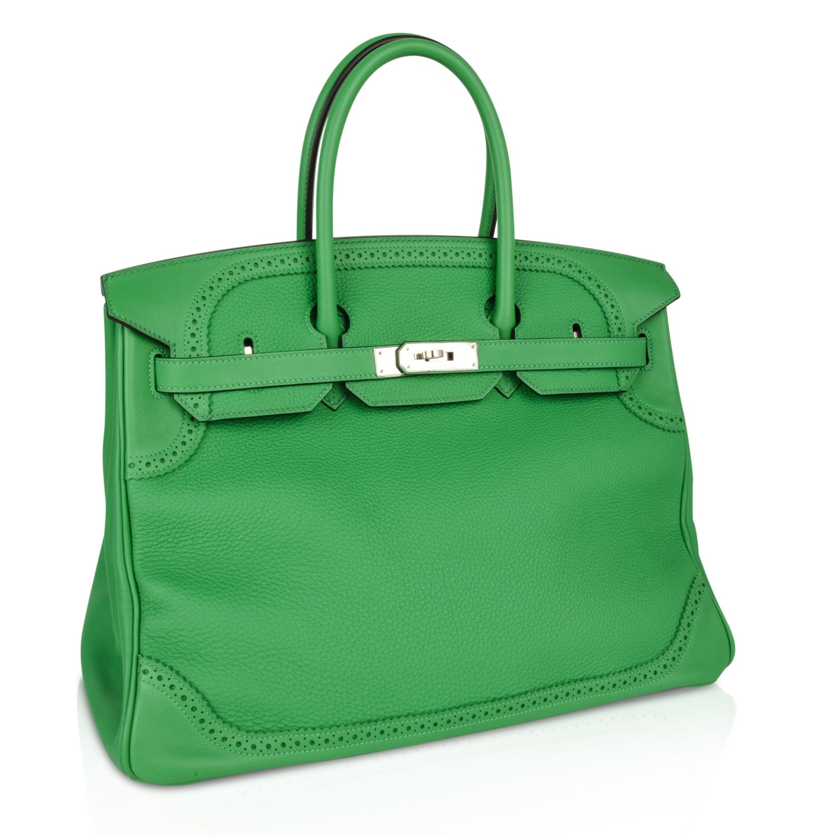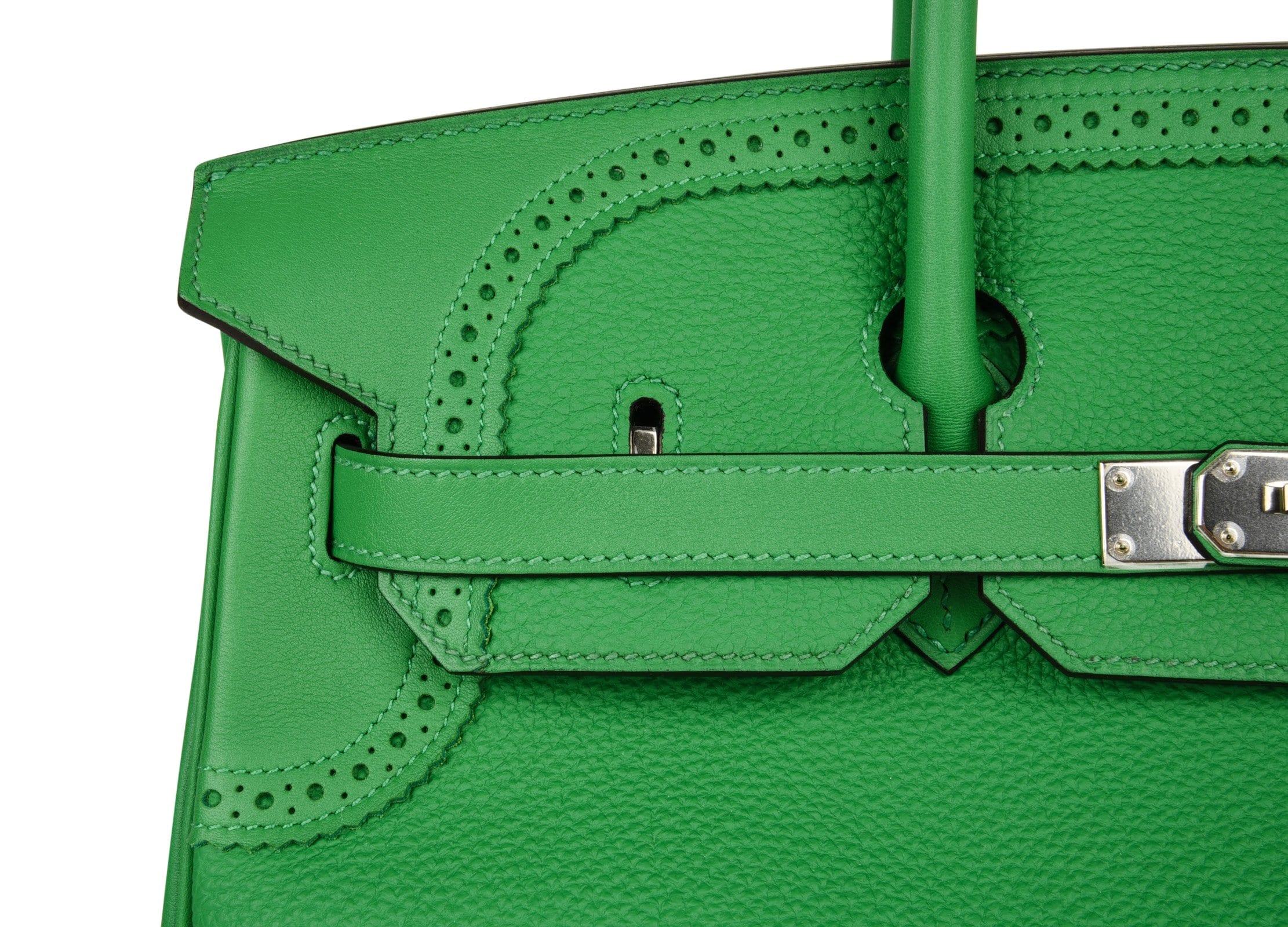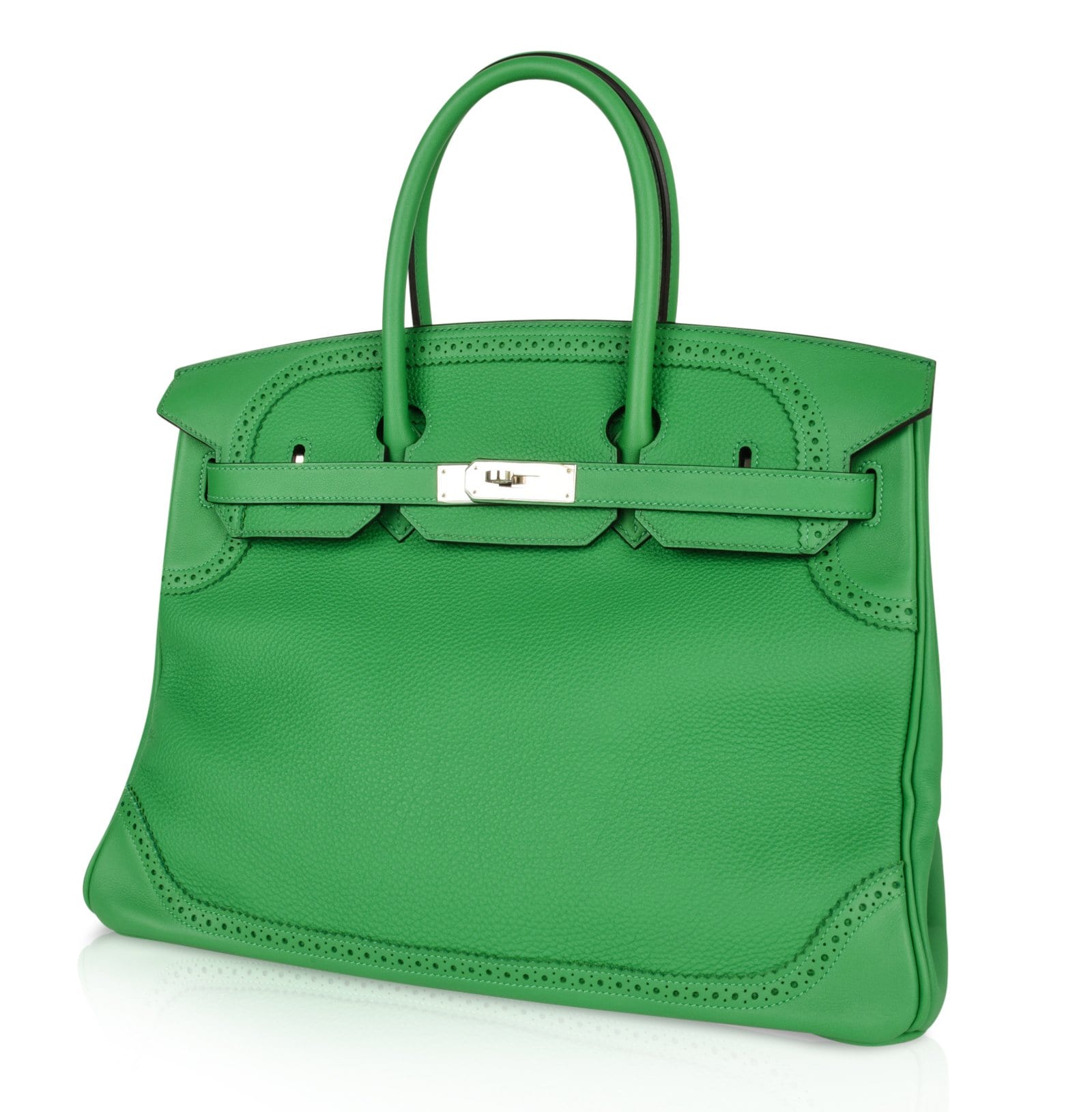 Guaranteed authentic Limited Edition Hermes Birkin 35 Ghillies bag in rare Bamboo Green.
