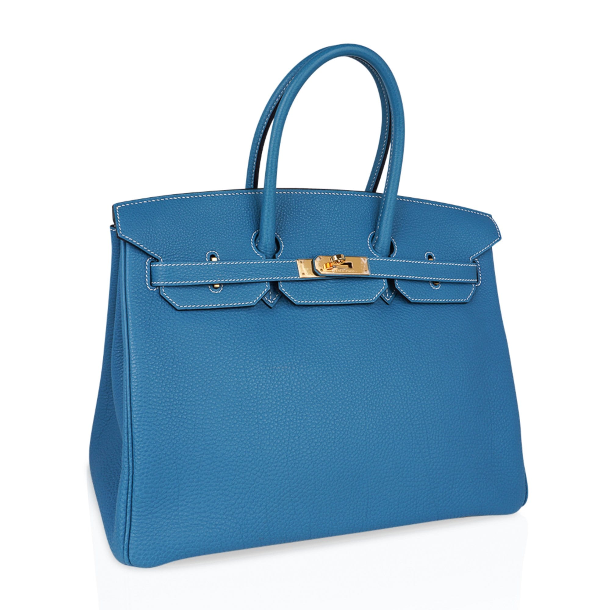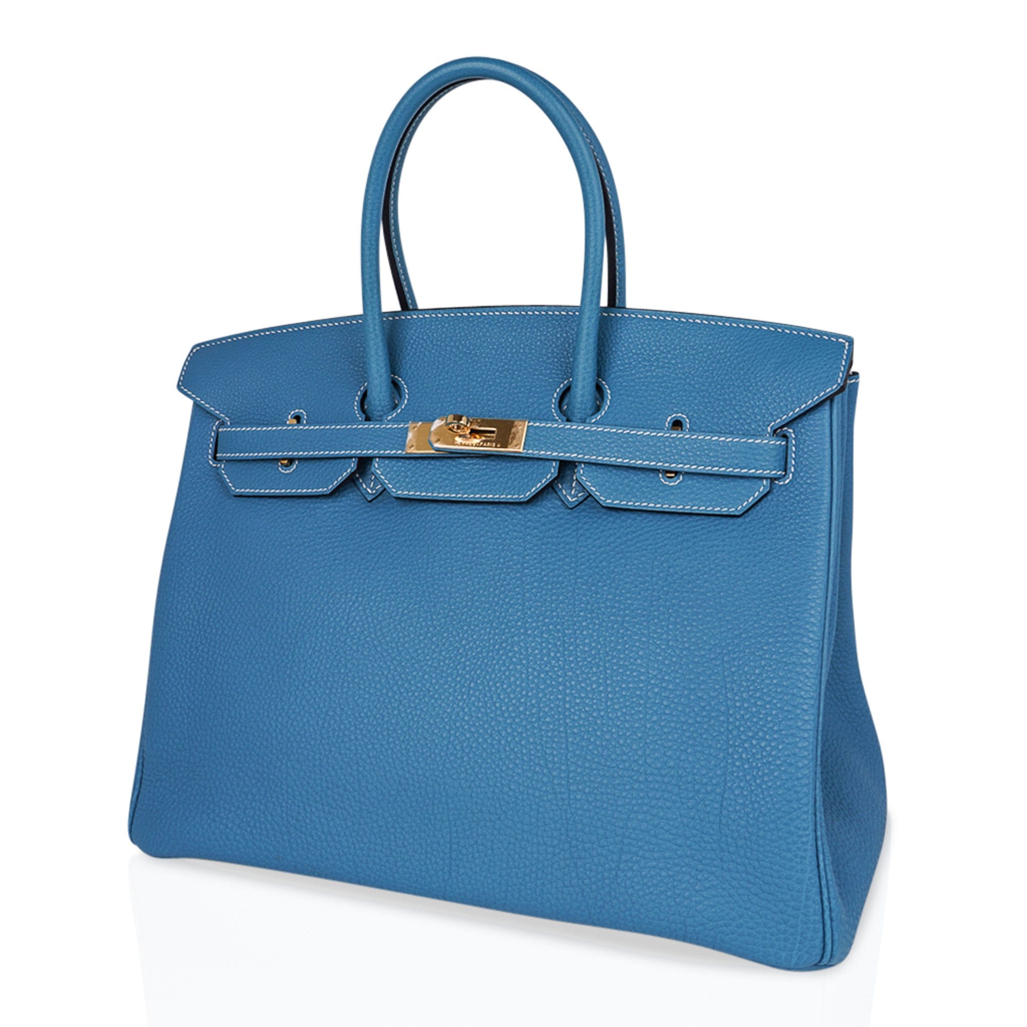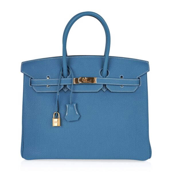 Genuine Hermes Birkin 35cm bag featured in iconic Blue Jean bag with coveted gold hardware.