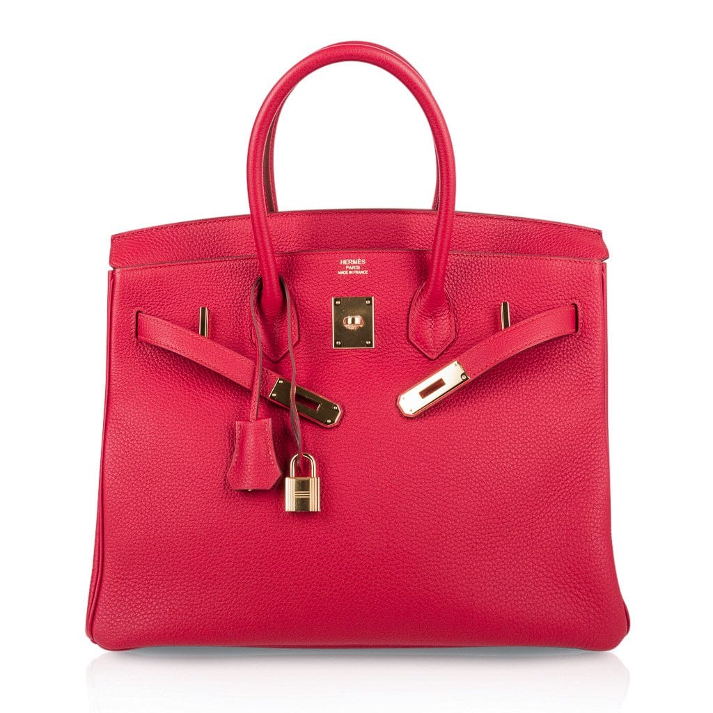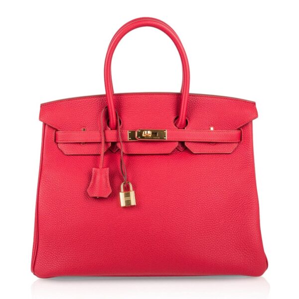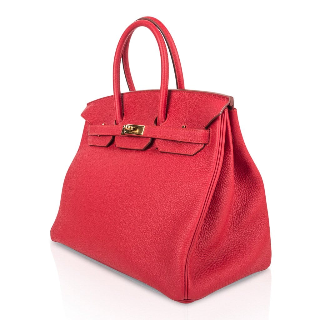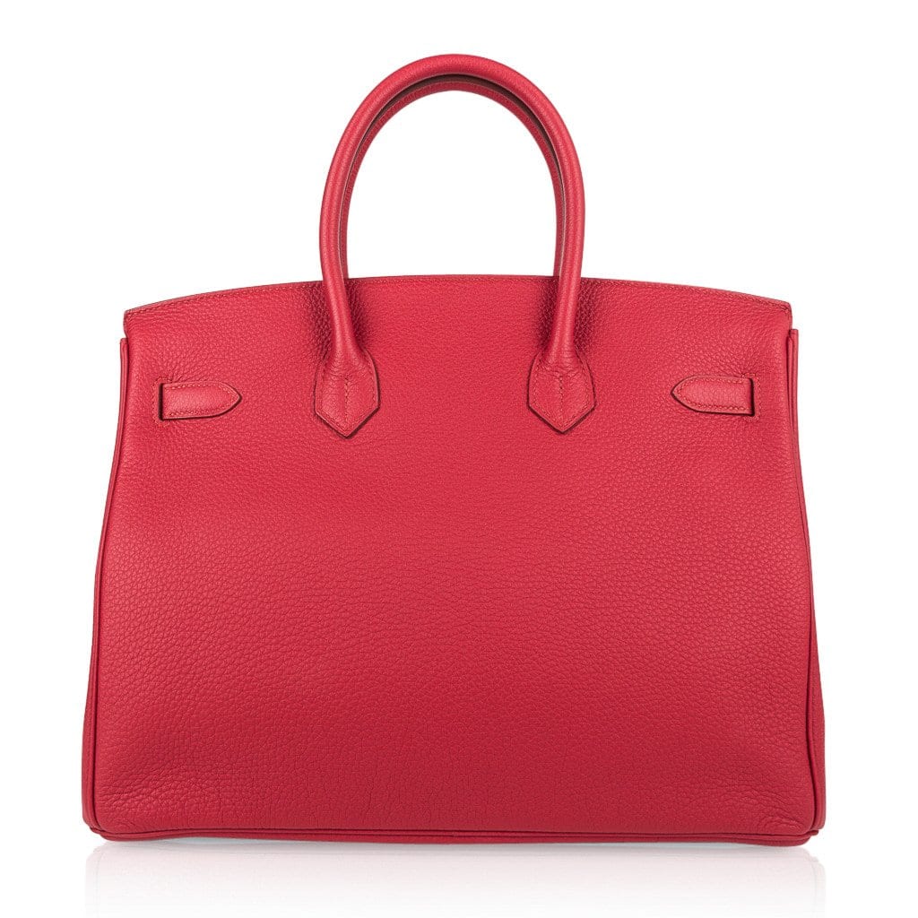 Guaranteed authentic Hermes Birkin 35 bag features Vermillion Red in togo leather.