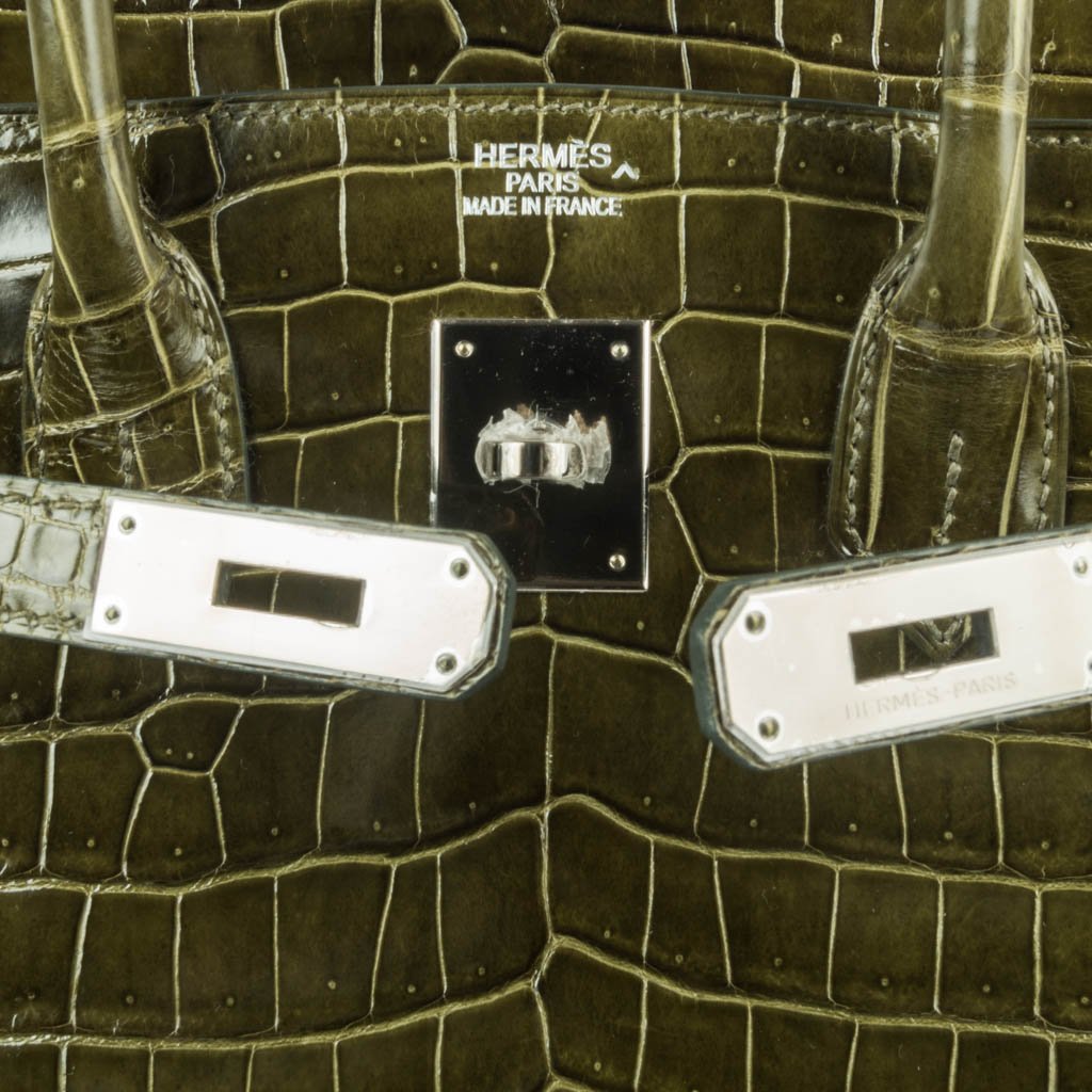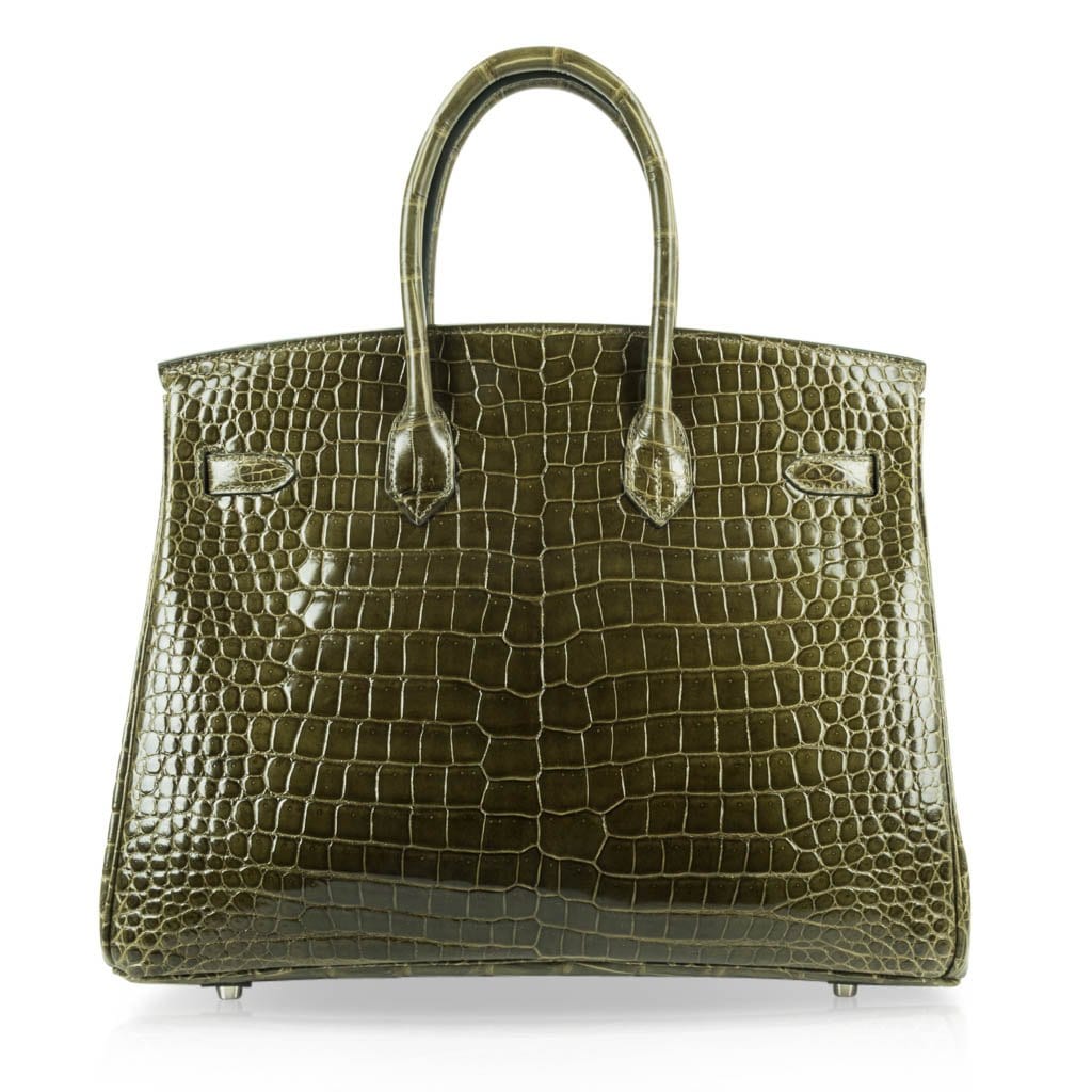 Guaranteed authentic Porosus Crocodile Hermes Birkin 35cm bag features rare Vert Veronese with palladium hardware.