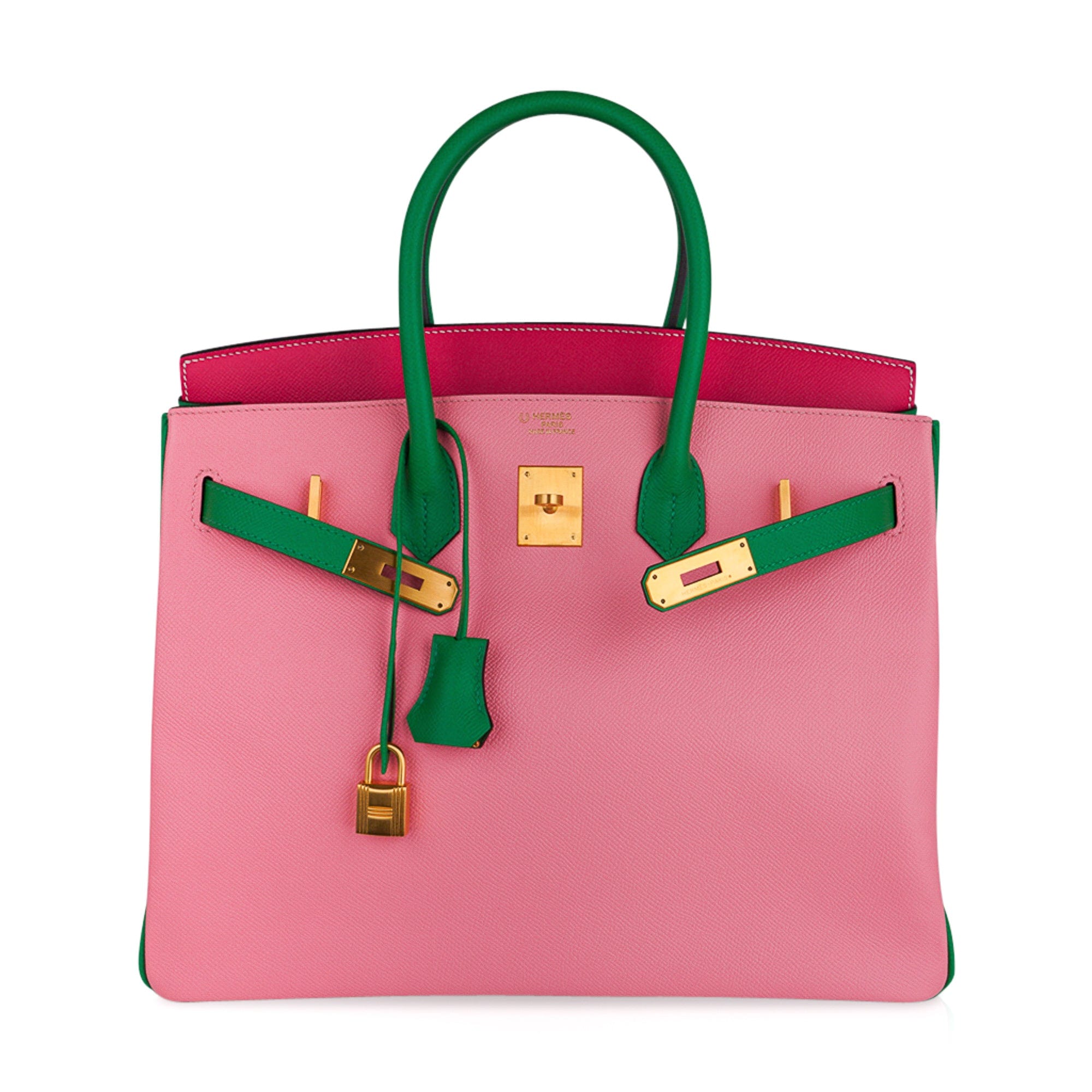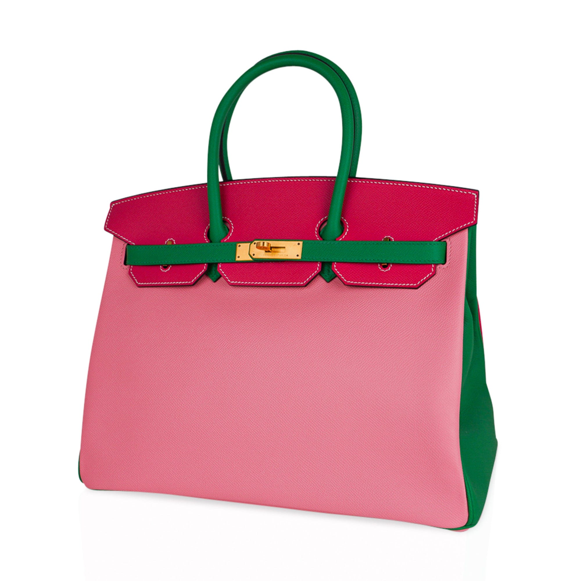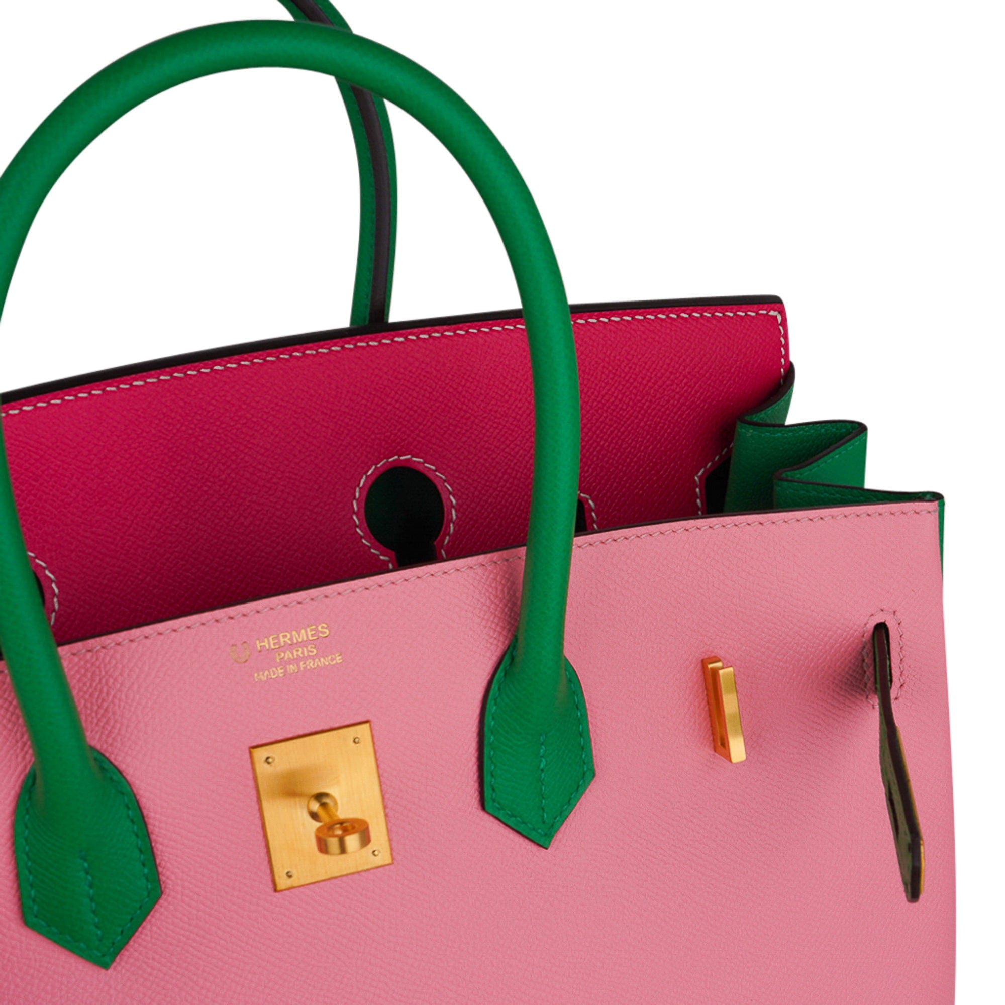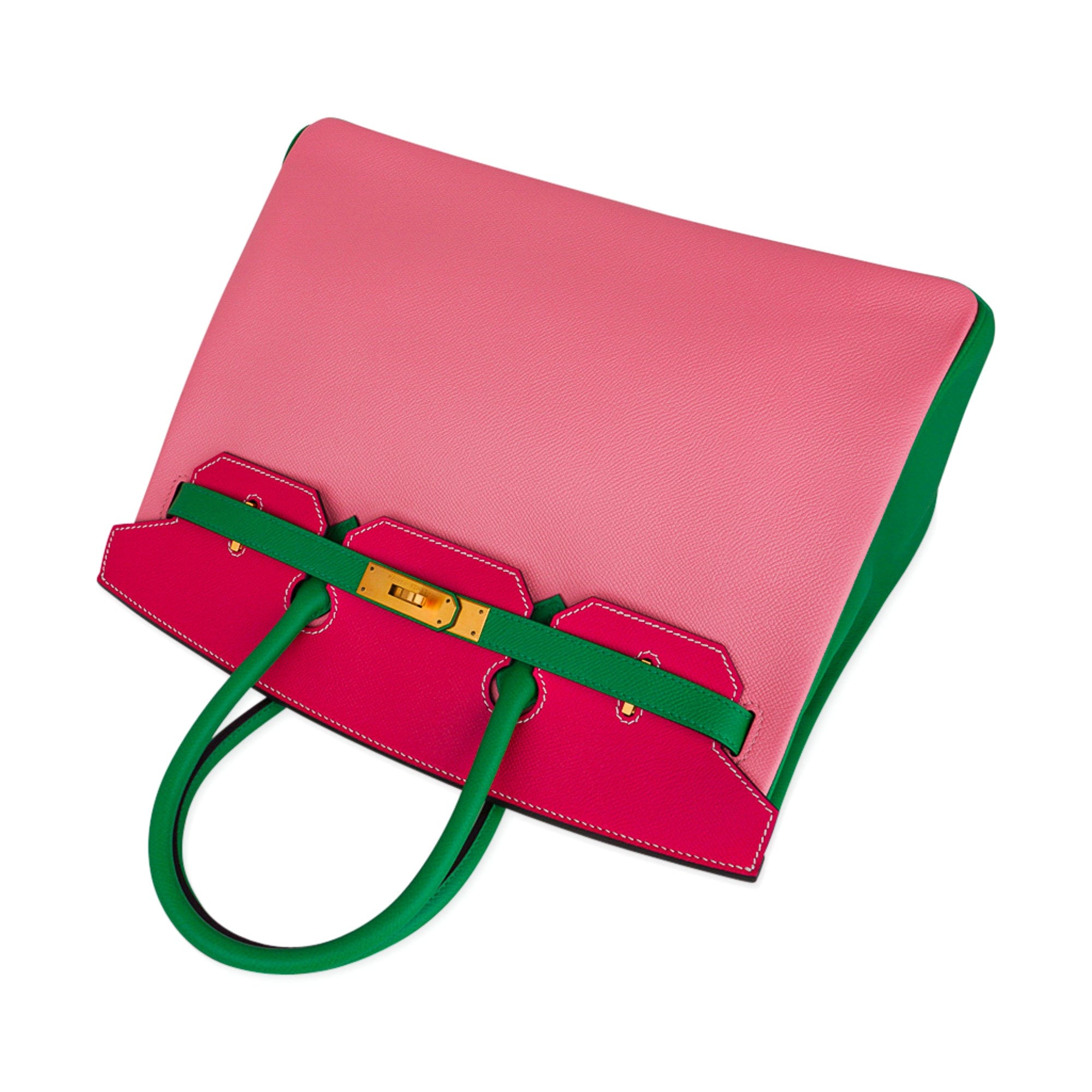 This special order Birkin bag is a beautiful combination of Rose Confetti, Rose Tyrien and Bamboo in Epsom leather.