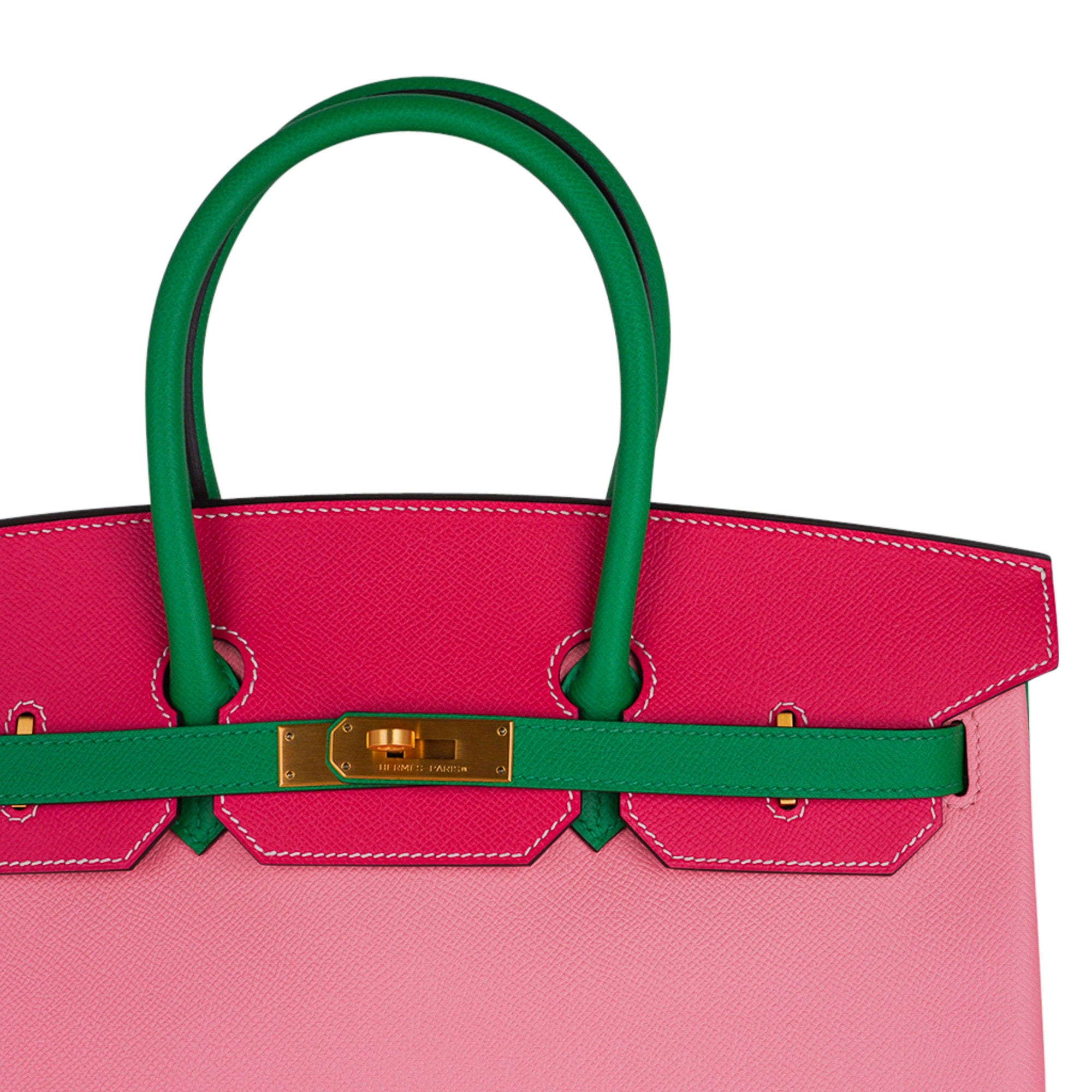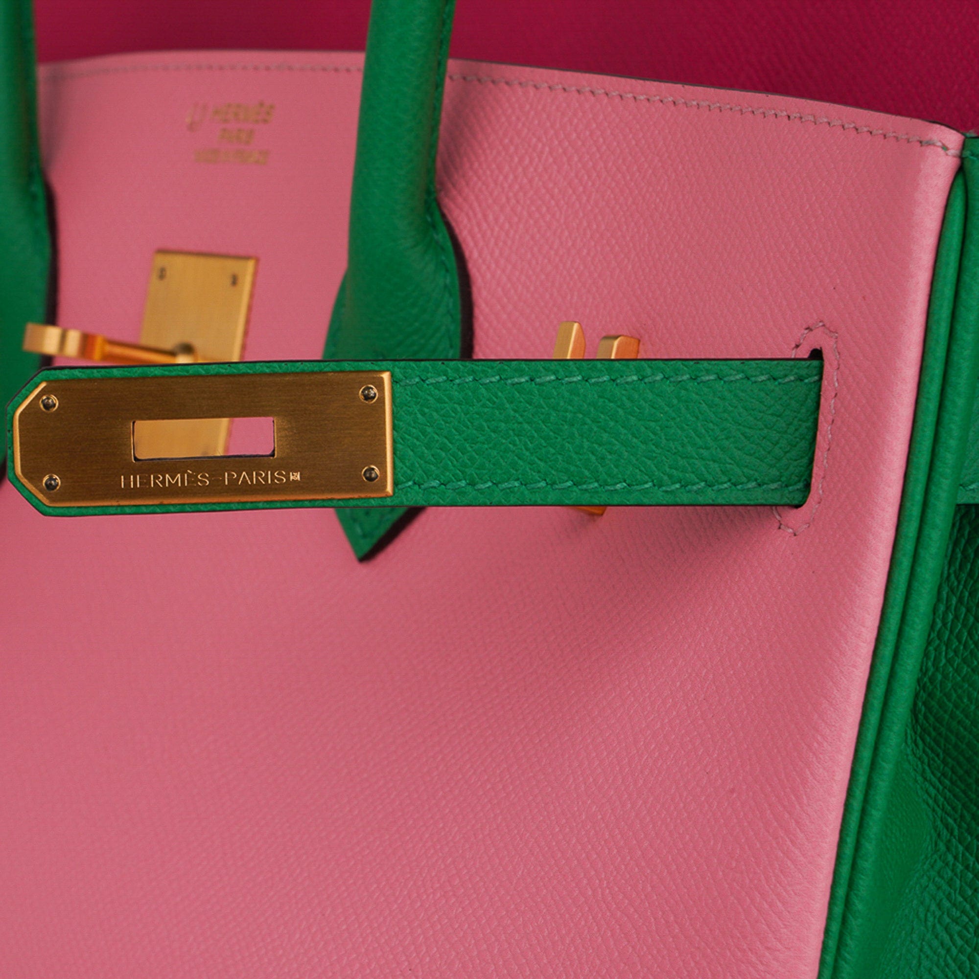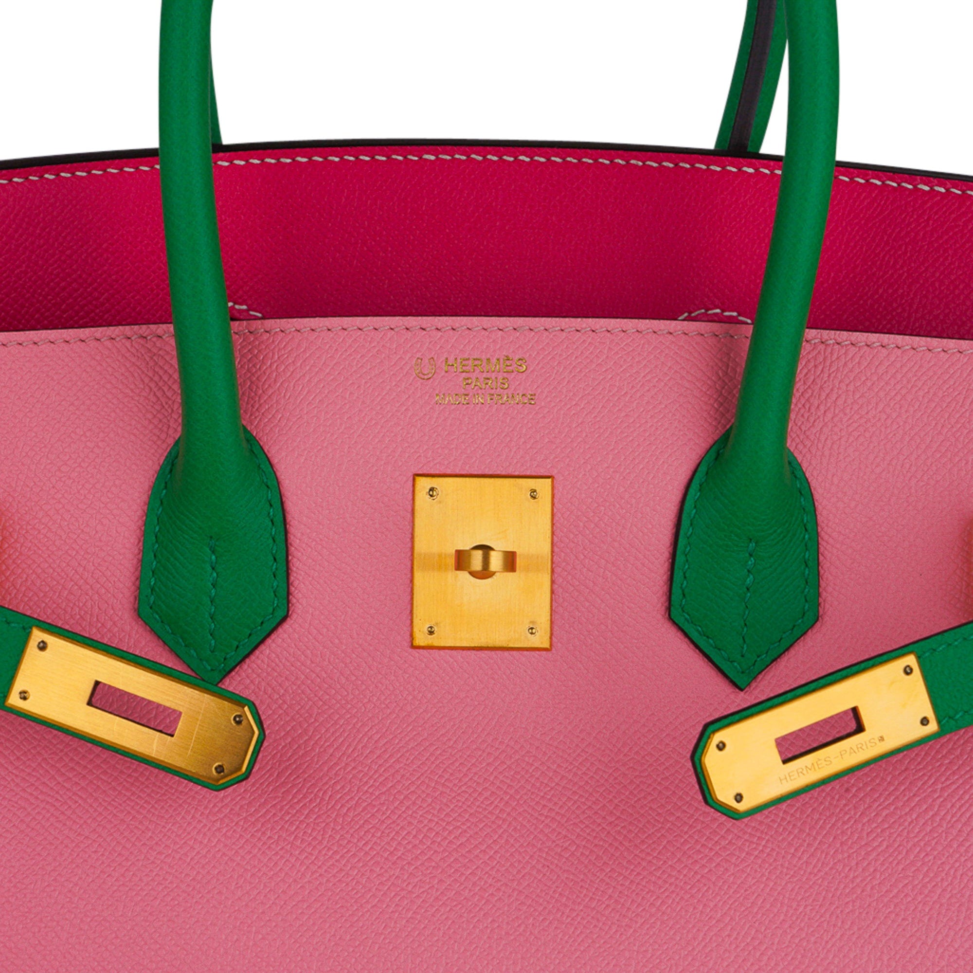 This special order Birkin bag is a beautiful combination of Rose Confetti, Rose Tyrien and Bamboo in Epsom leather.