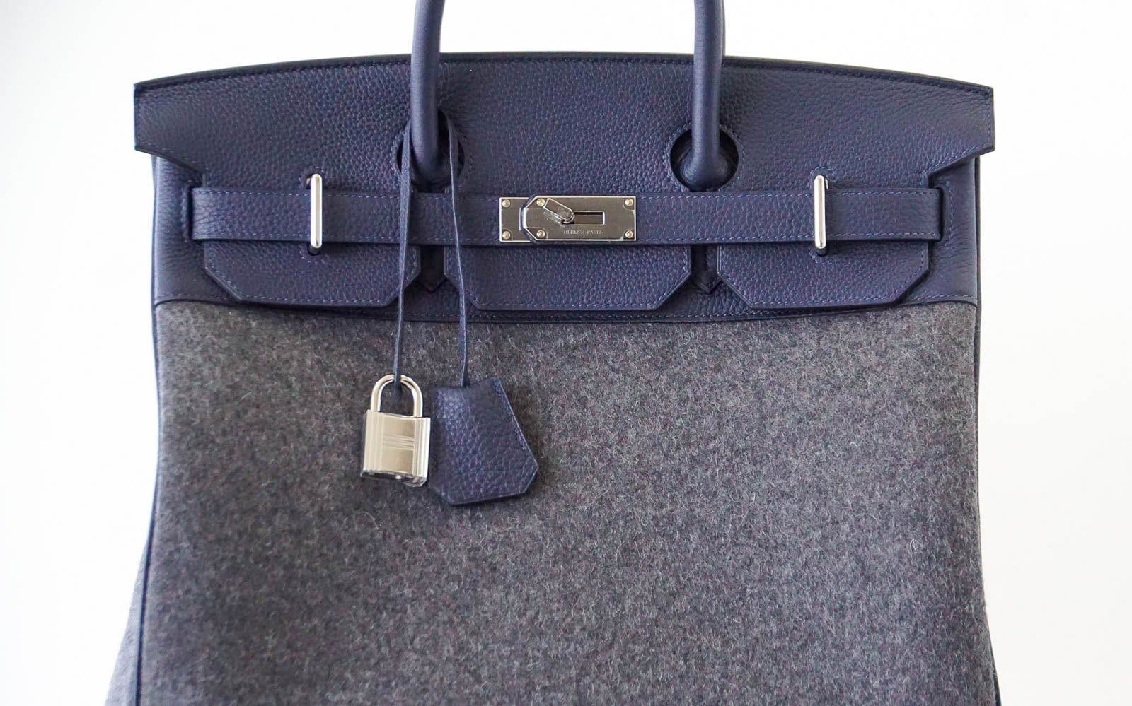 Guaranteed authentic rare Birkin bag Hermes HAC 40 in Gris Moyen (Medium Grey) Todoo Feutre (Wool) and Bleu Nuit Togo Hermes leather.