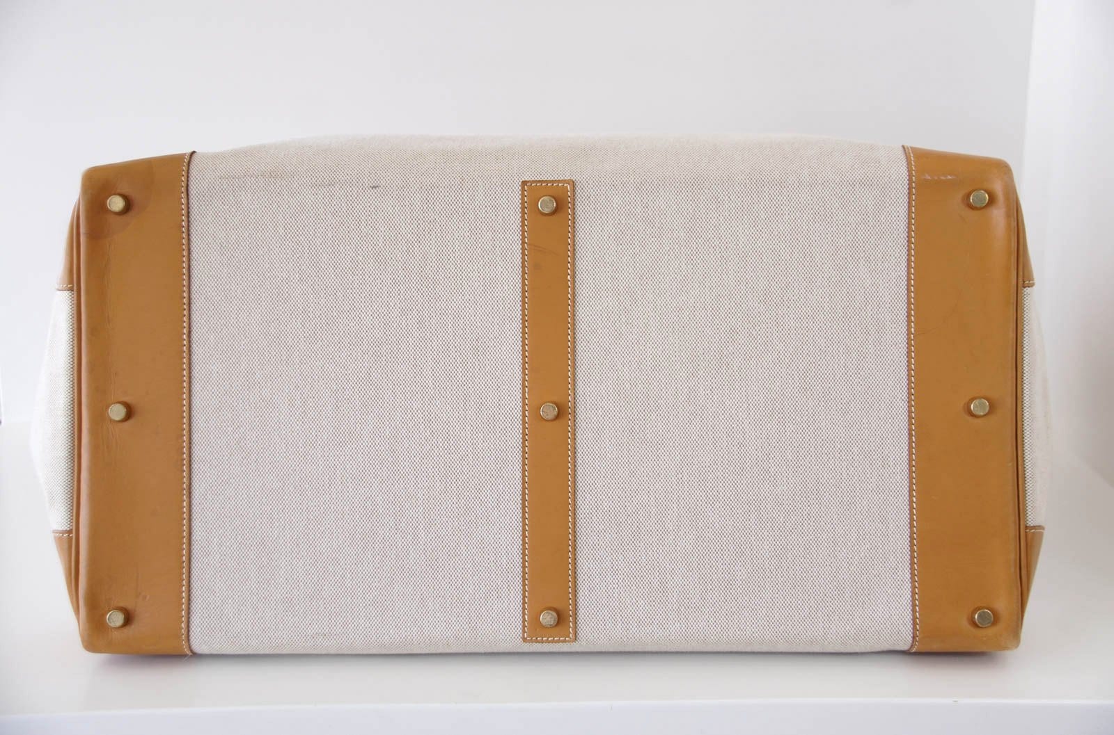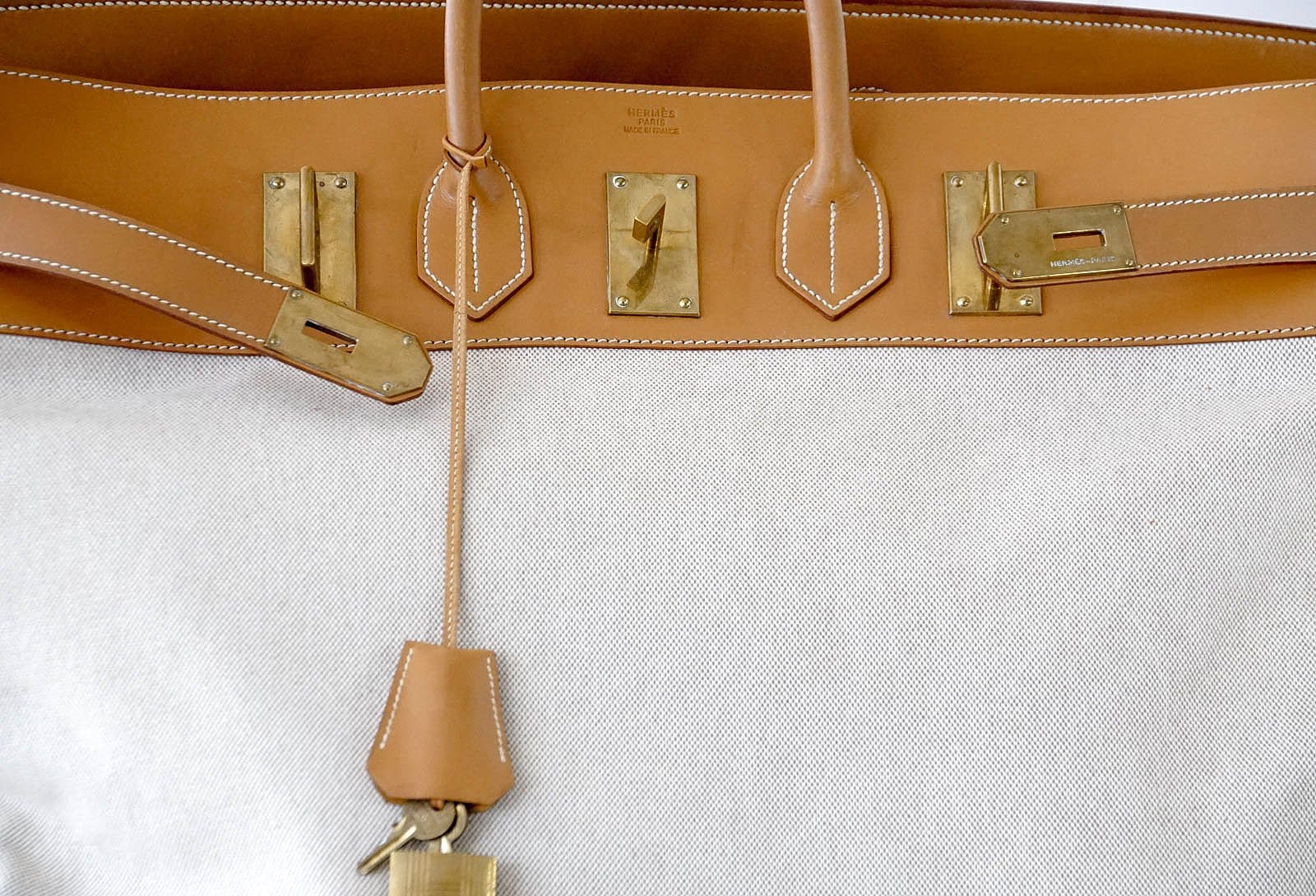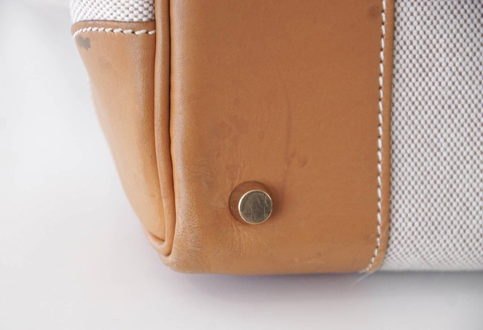 Guaranteed authentic rare vintage Hermes HAC 55 in Toile with Vache Naturelle Hermes leather.