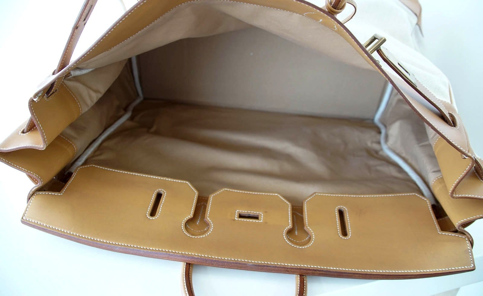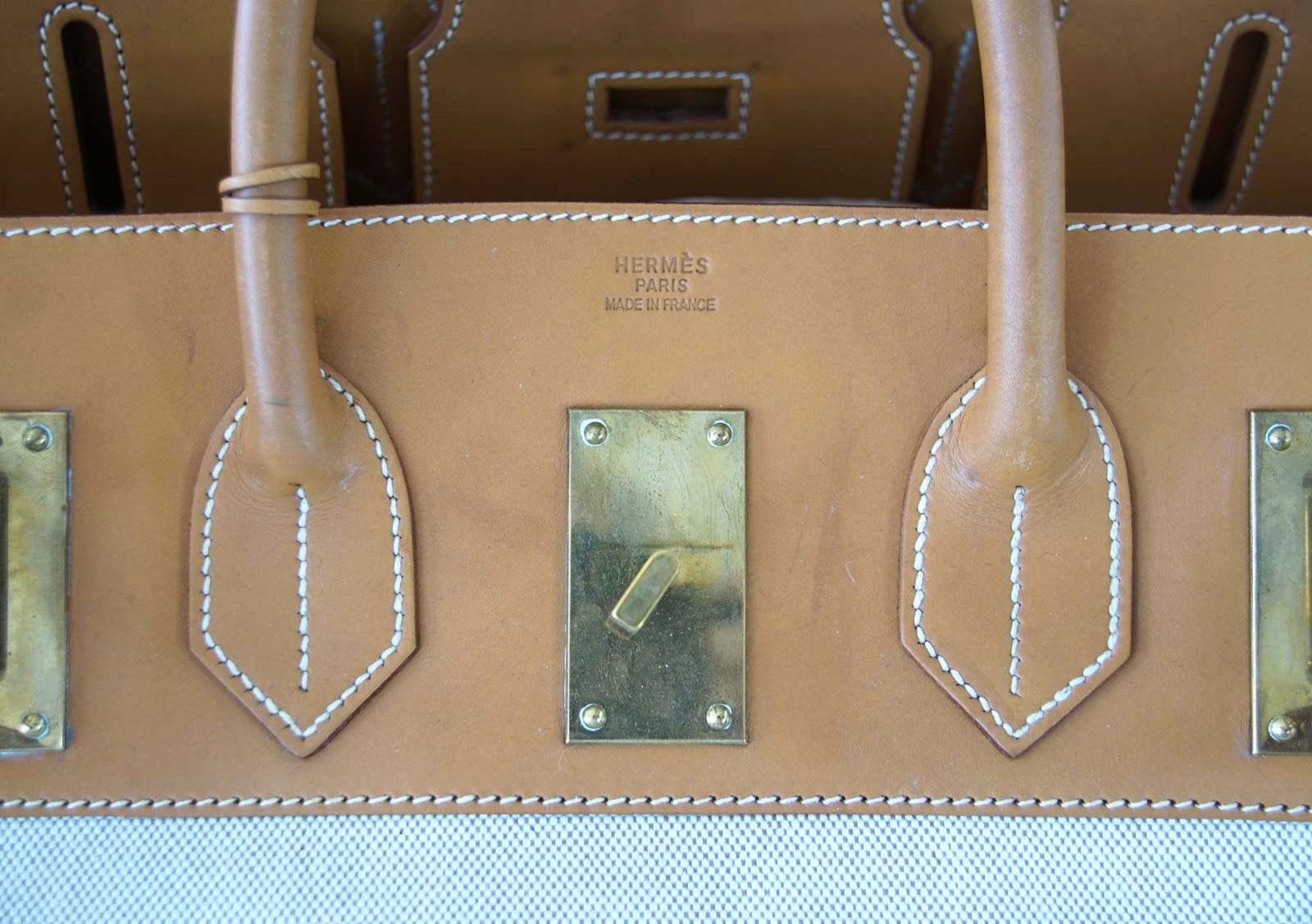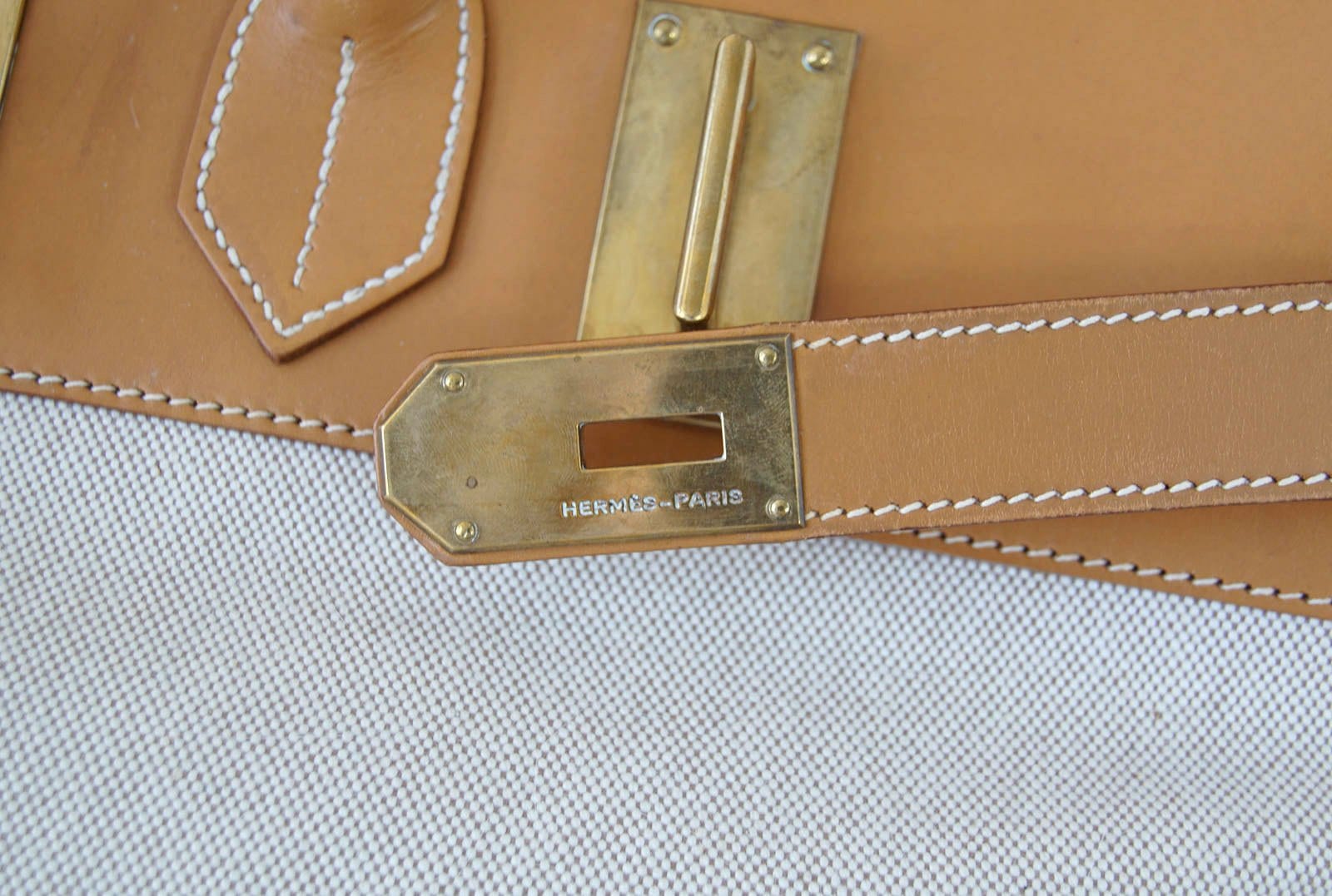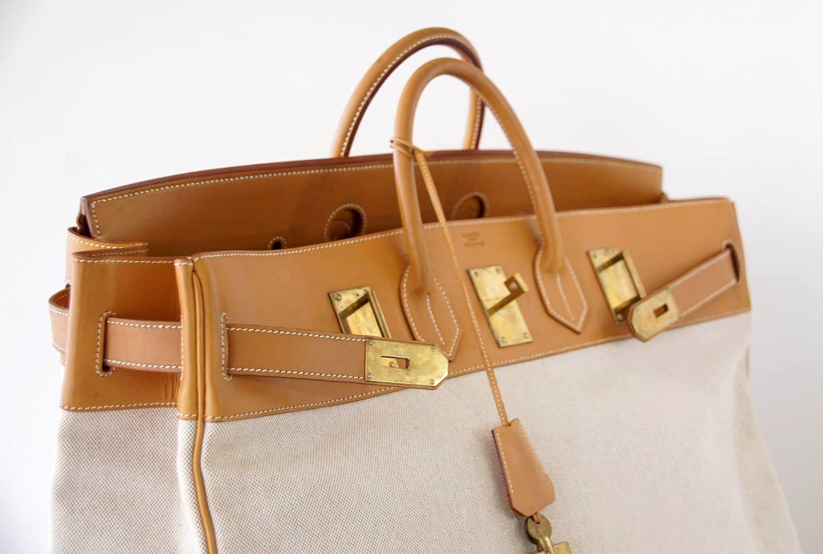 Guaranteed authentic rare vintage Hermes HAC 55 in Toile with Vache Naturelle Hermes leather.