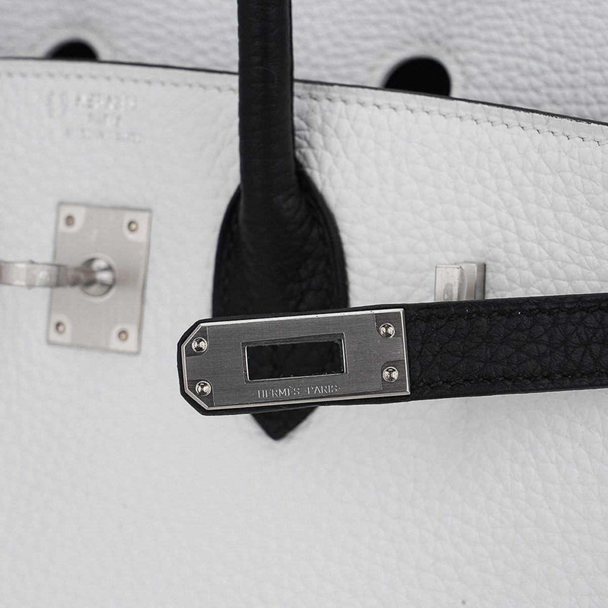 This special order clemence leather Hermes Birkin is black along sides, straps and handles.