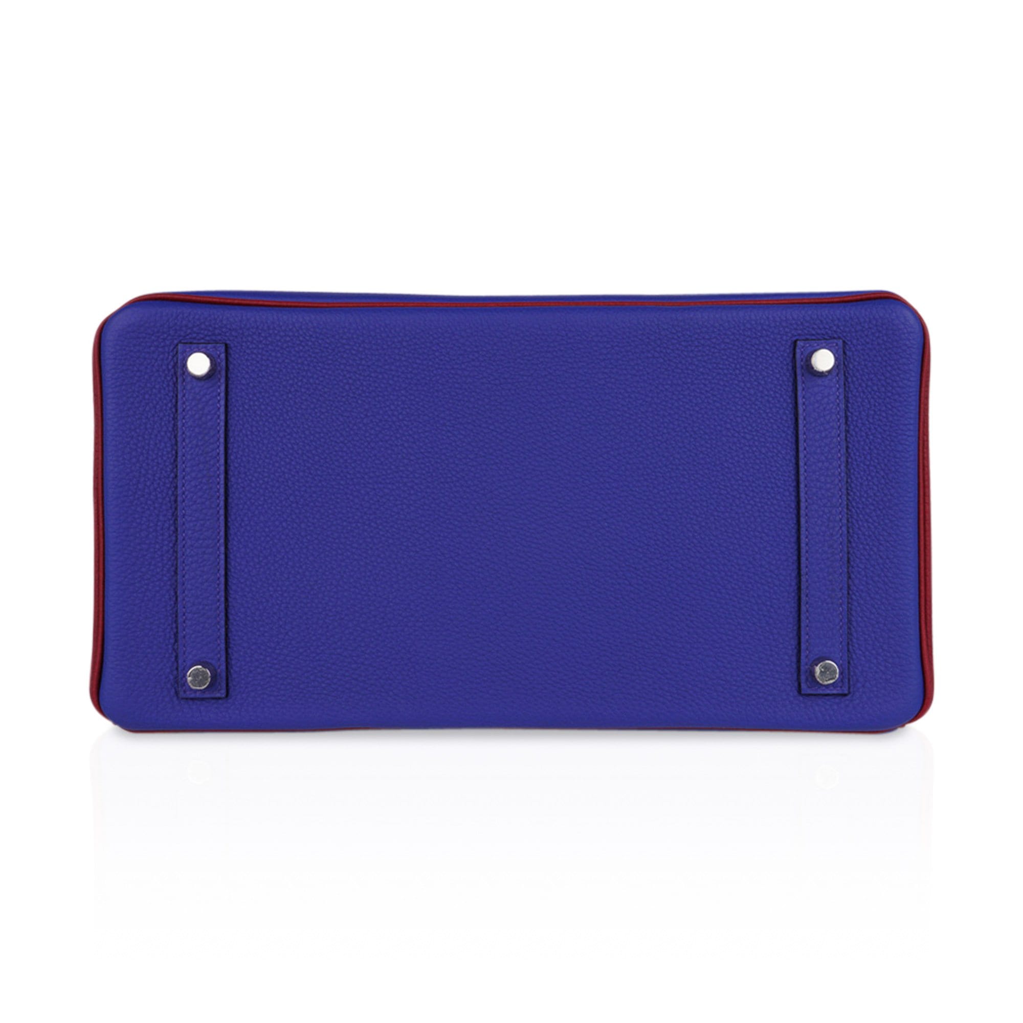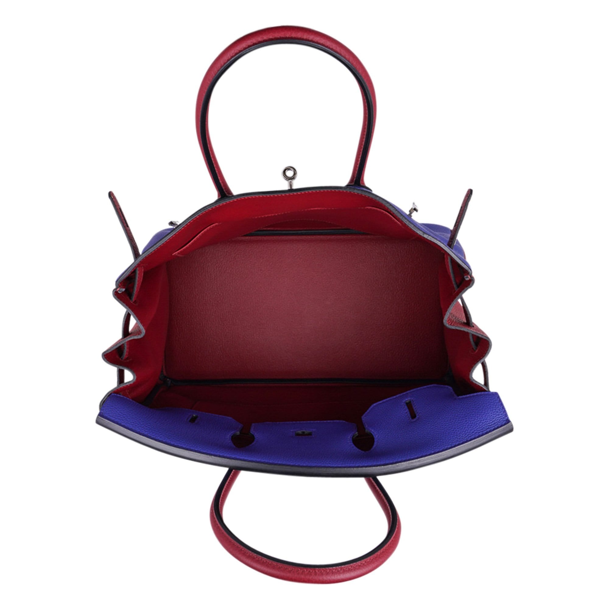 Guaranteed authentic Hermes Birkin HSS 35 bag featured in an exotic creation of vivid Blue Electric and rich Rouge Grenat.