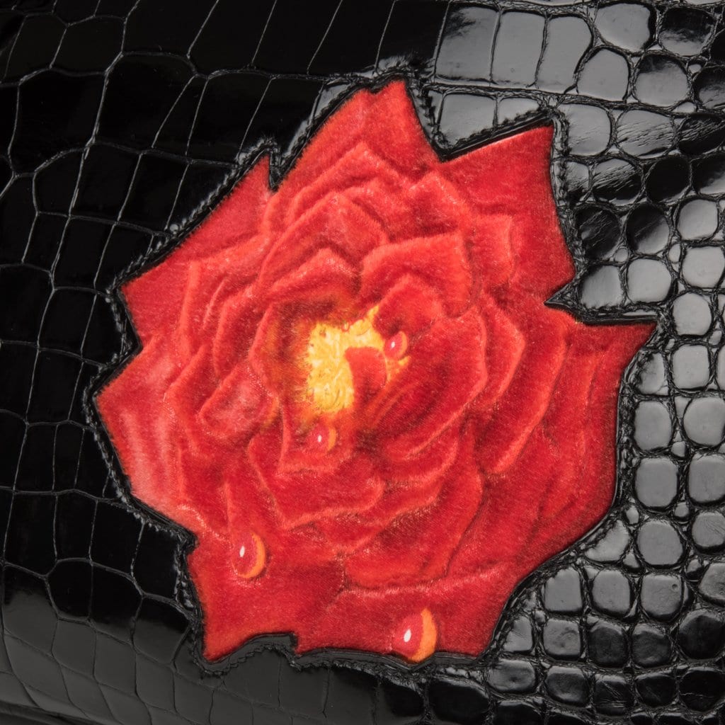 Black porosus crocodile with the dewdrop detailed La Rosee red velvet rose on front. Showstopping!