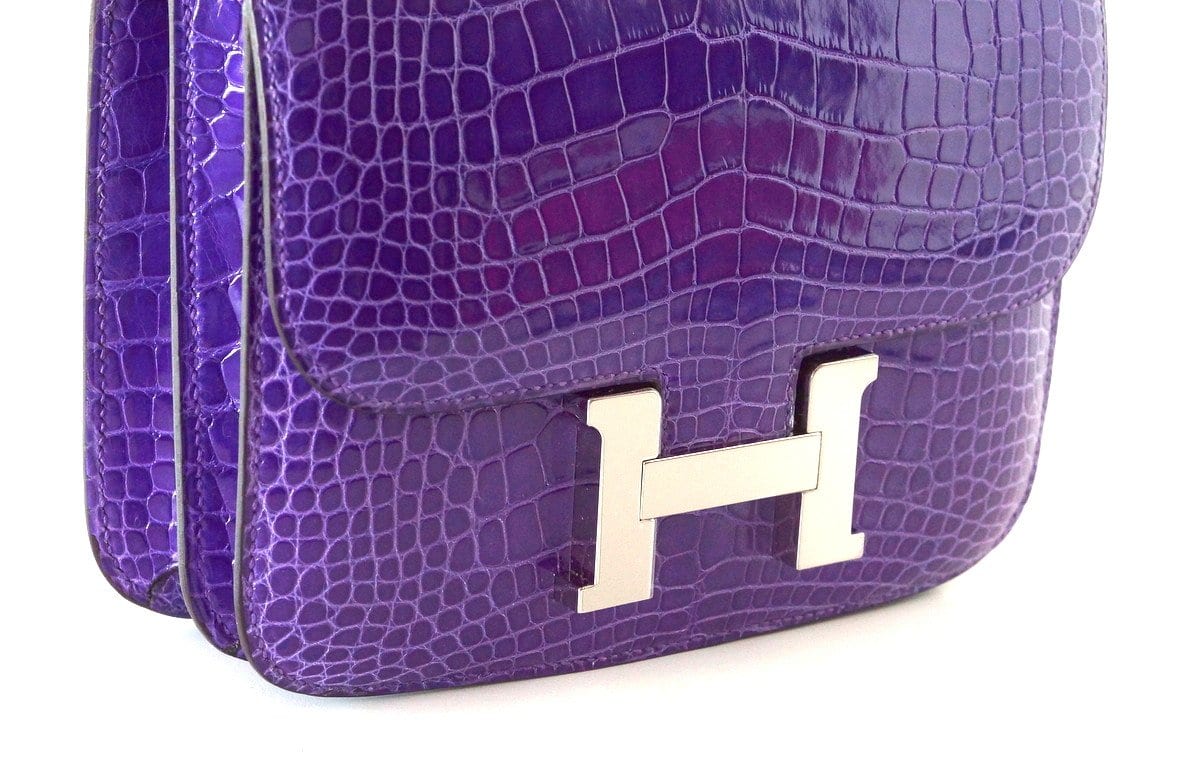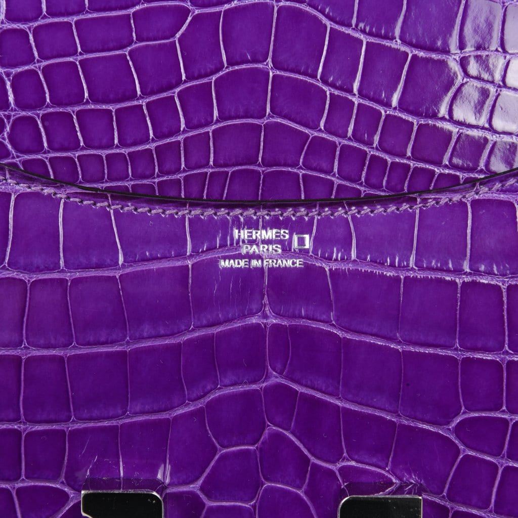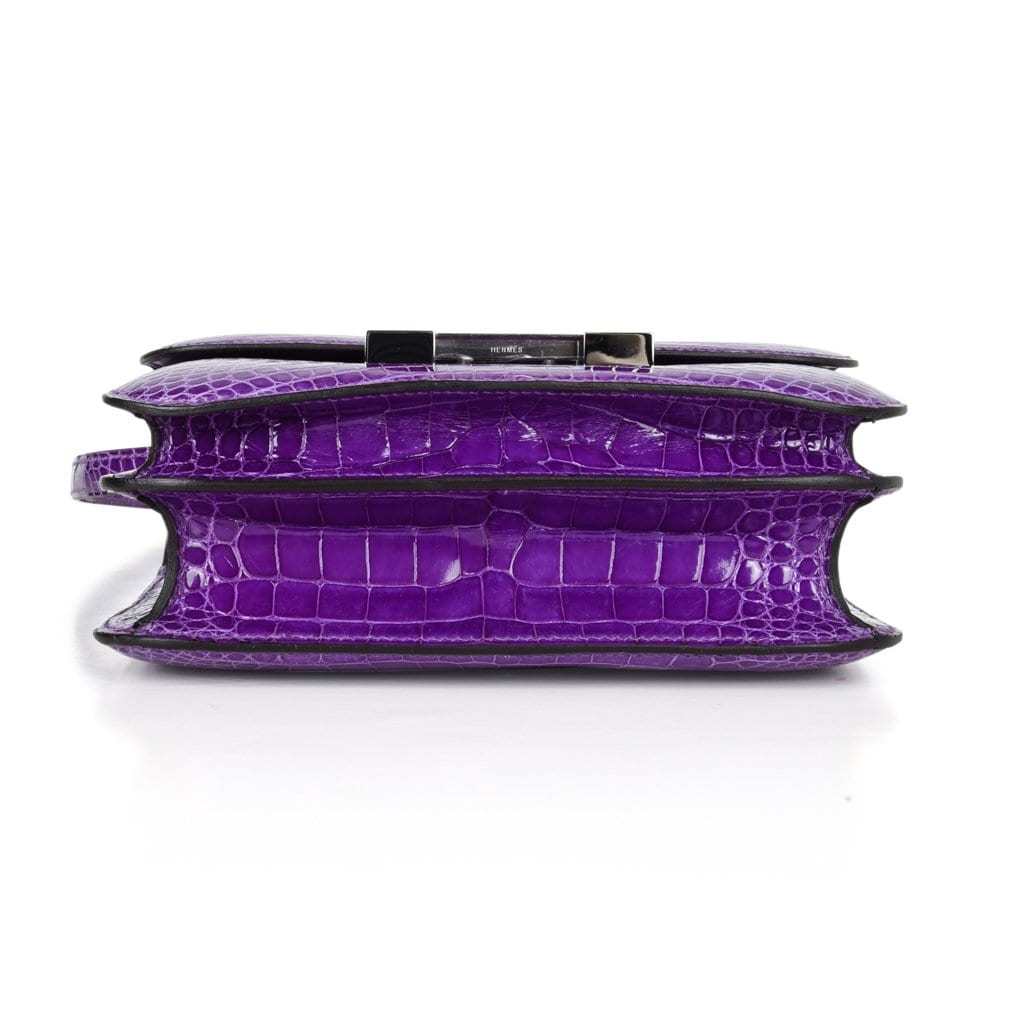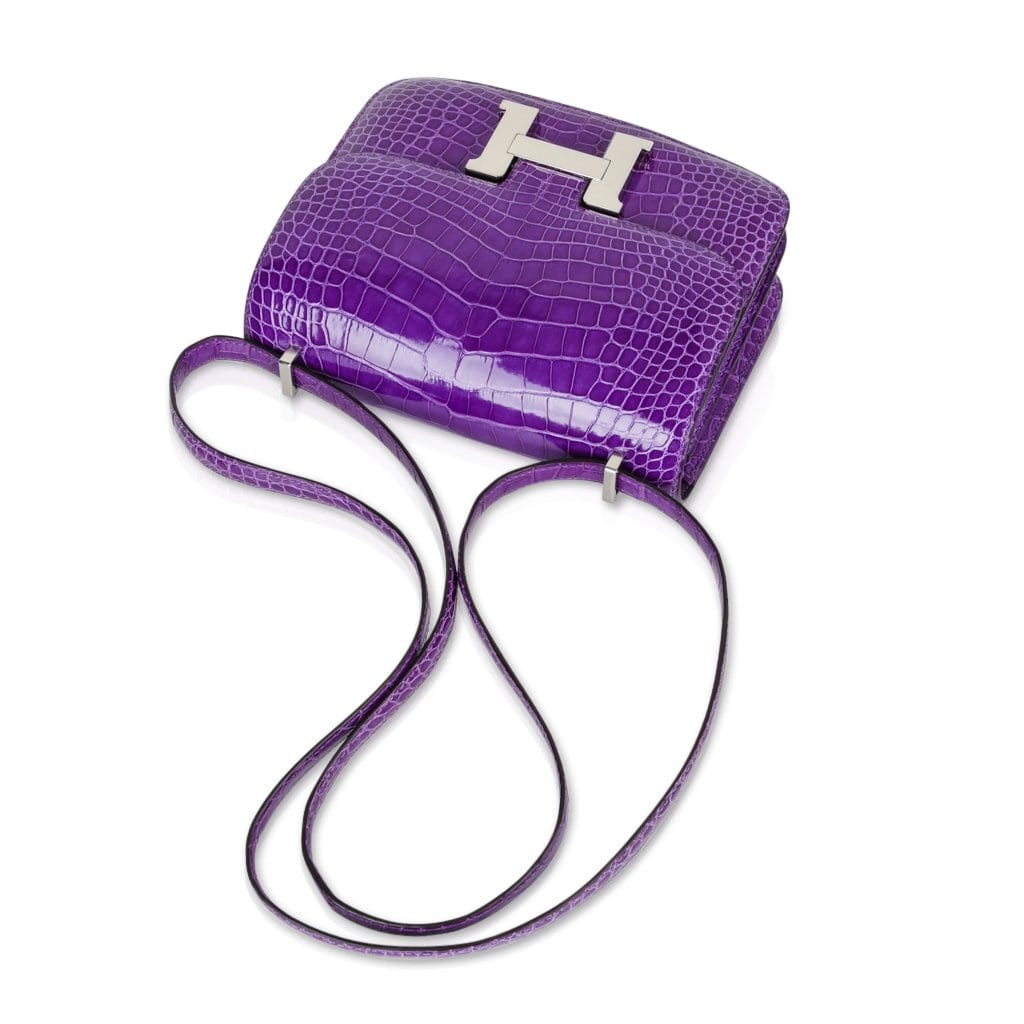 Guaranteed authentic Hermes Constance Mini 18 cm bag features rare Violet Alligator.