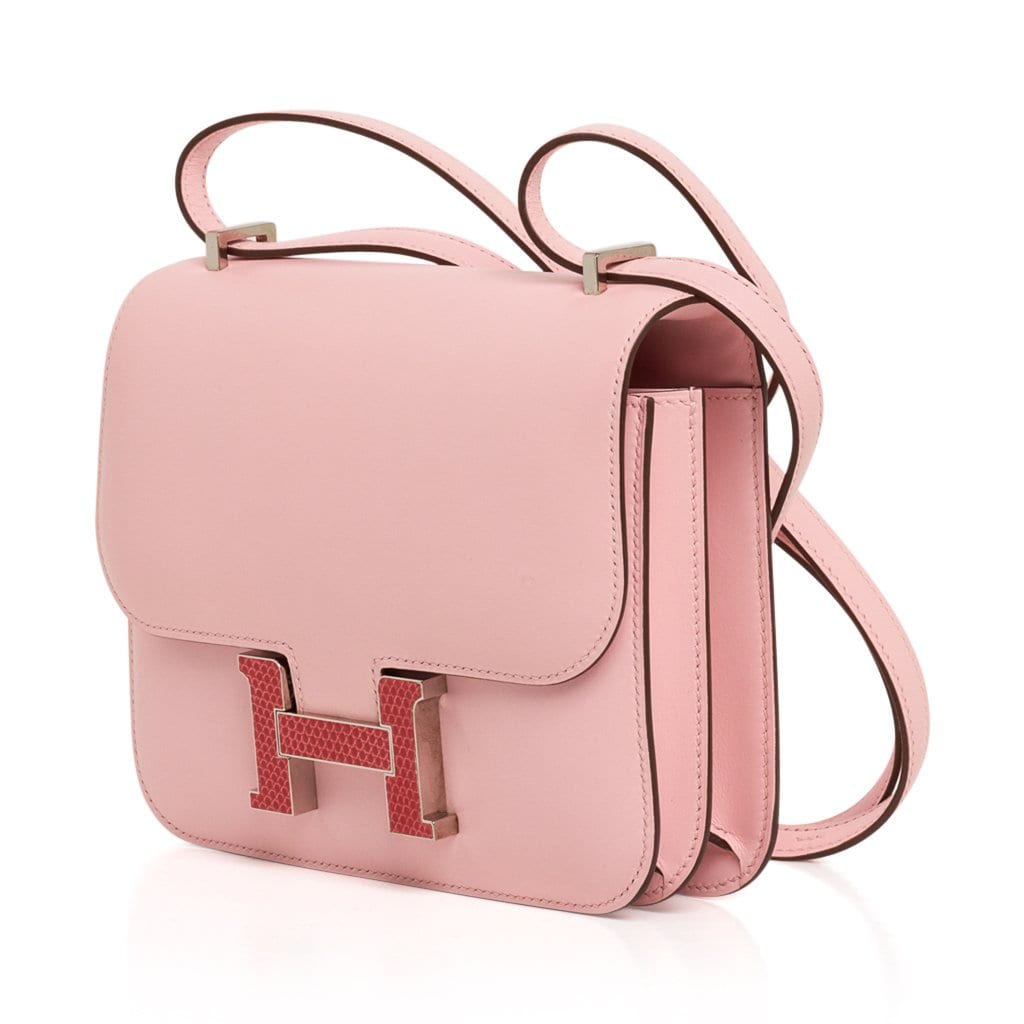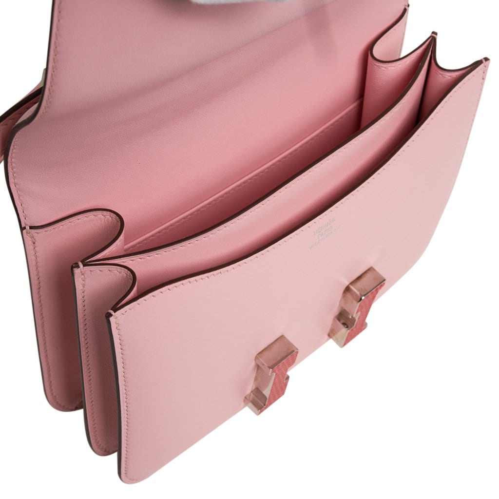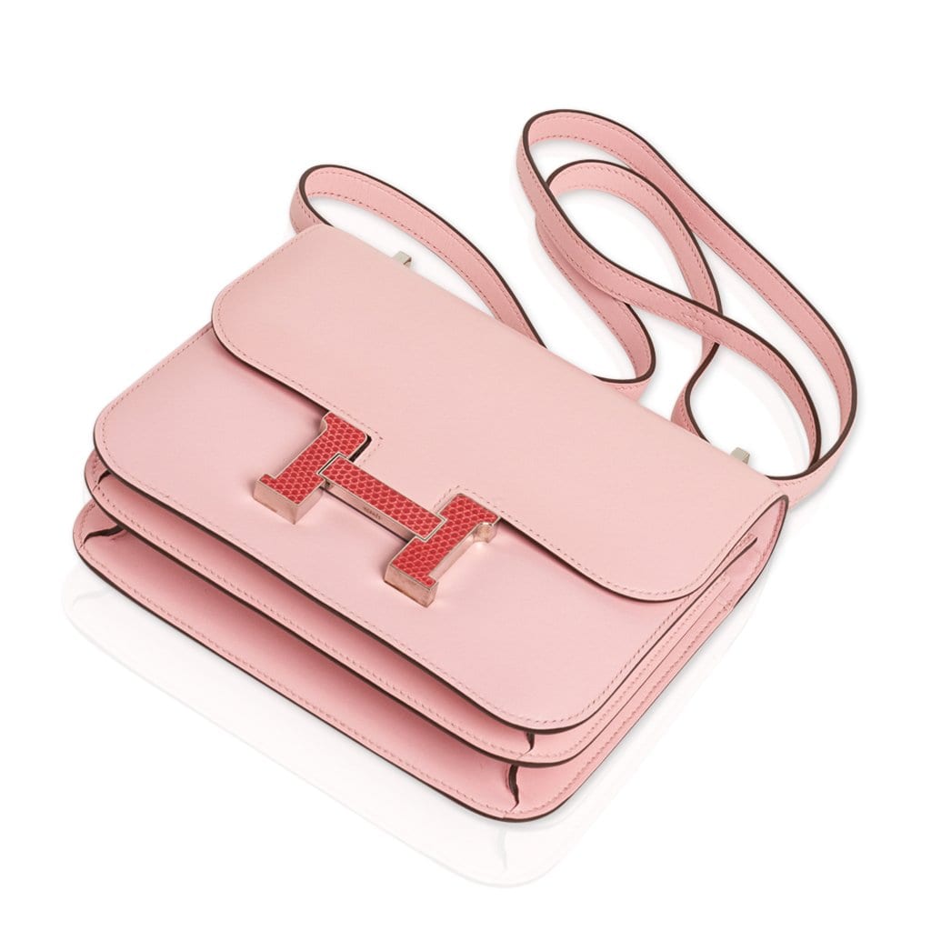 Guaranteed authentic Hermes Constance 18 bag featured in Rose Sakura with Bougainvillea Lizard buckle Kawaii Collection.