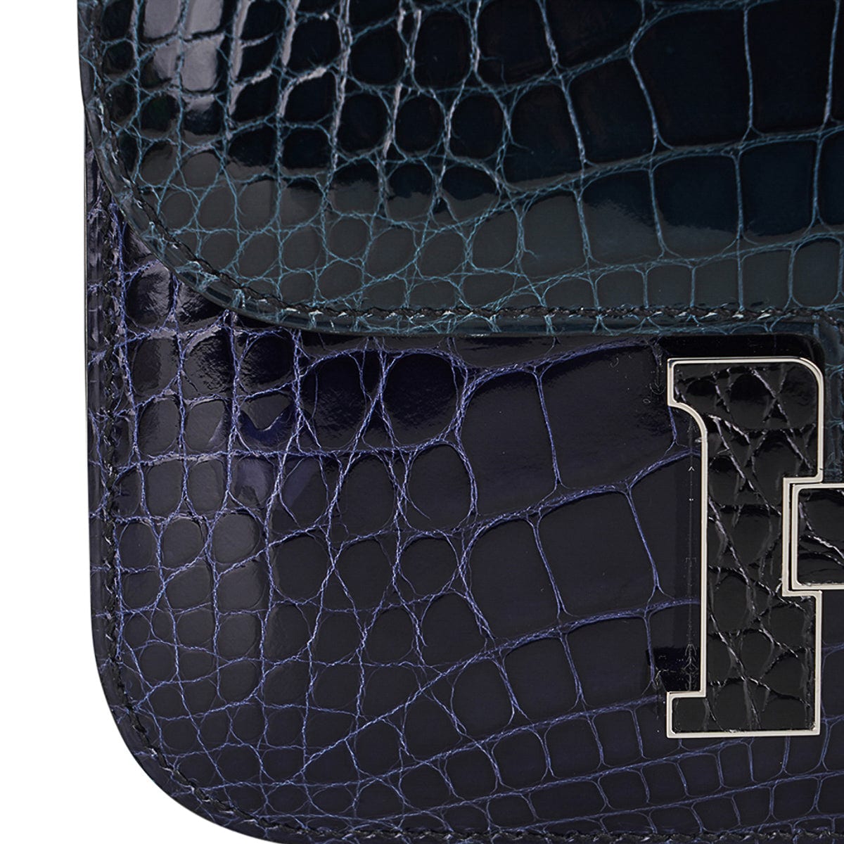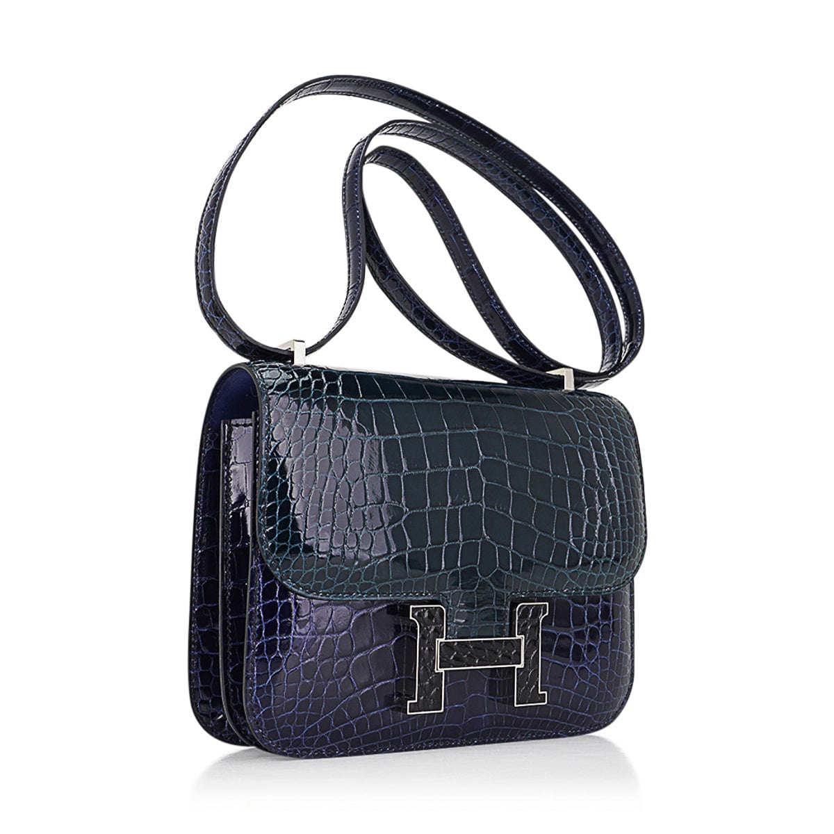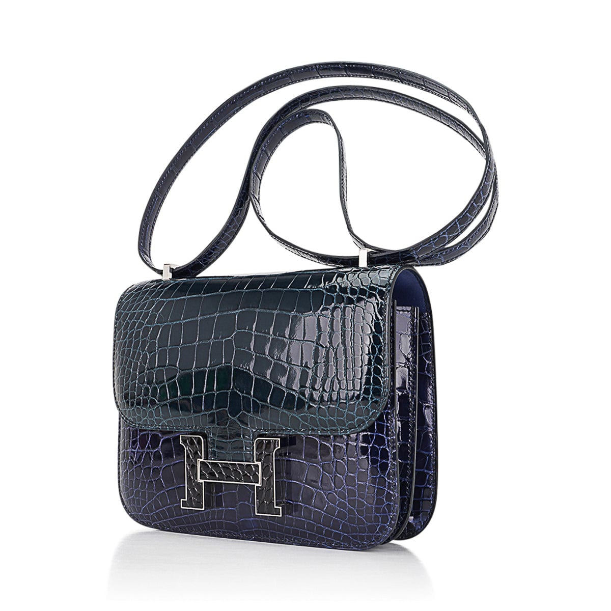 Coveted Hermes Constance 18 limited edition tri-color bag featured in Bleu Sapphire, Vert Rousseau lisse Alligator.