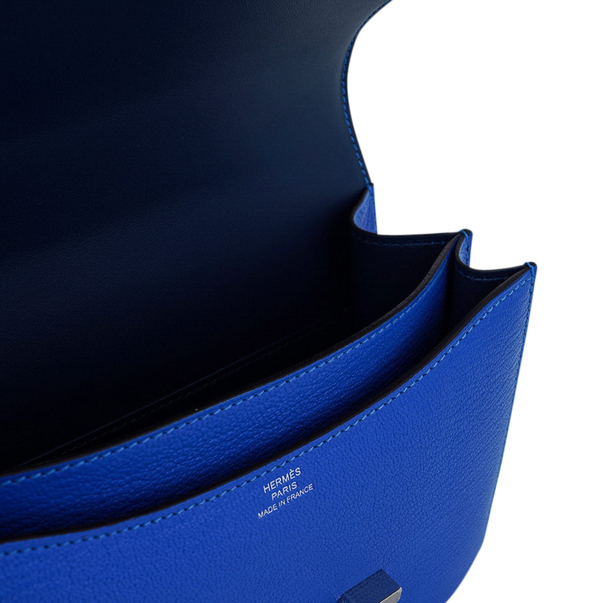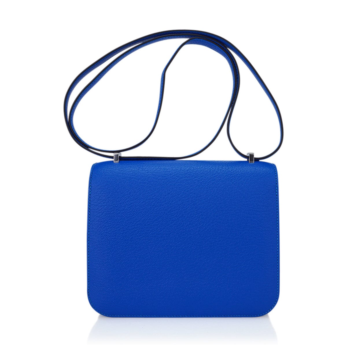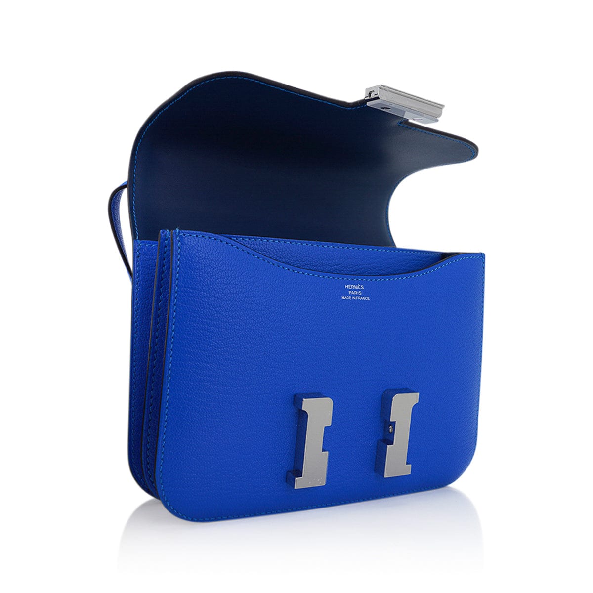 Guaranteed authentic Hermes Constance 18 bag featured in Bleu Hydra with Deep Bleu interior.