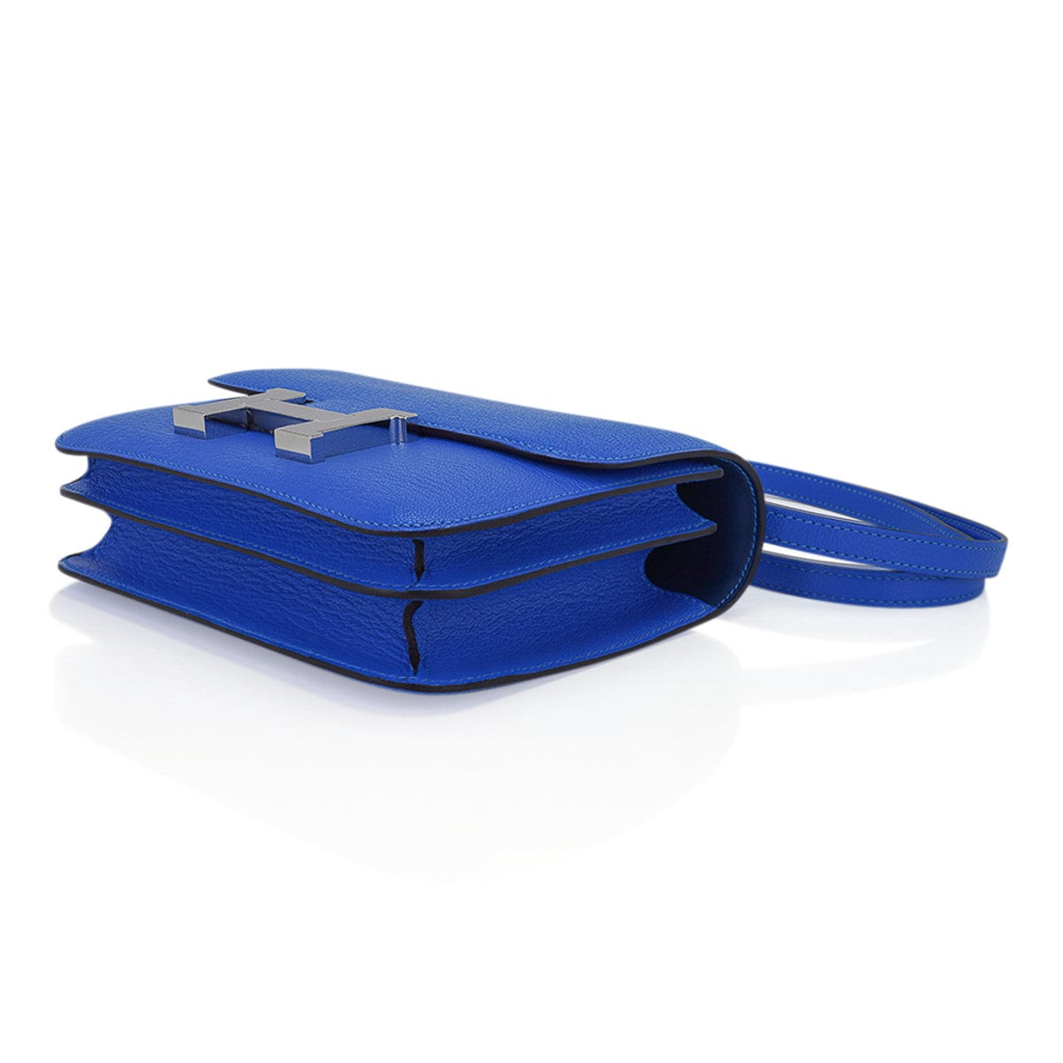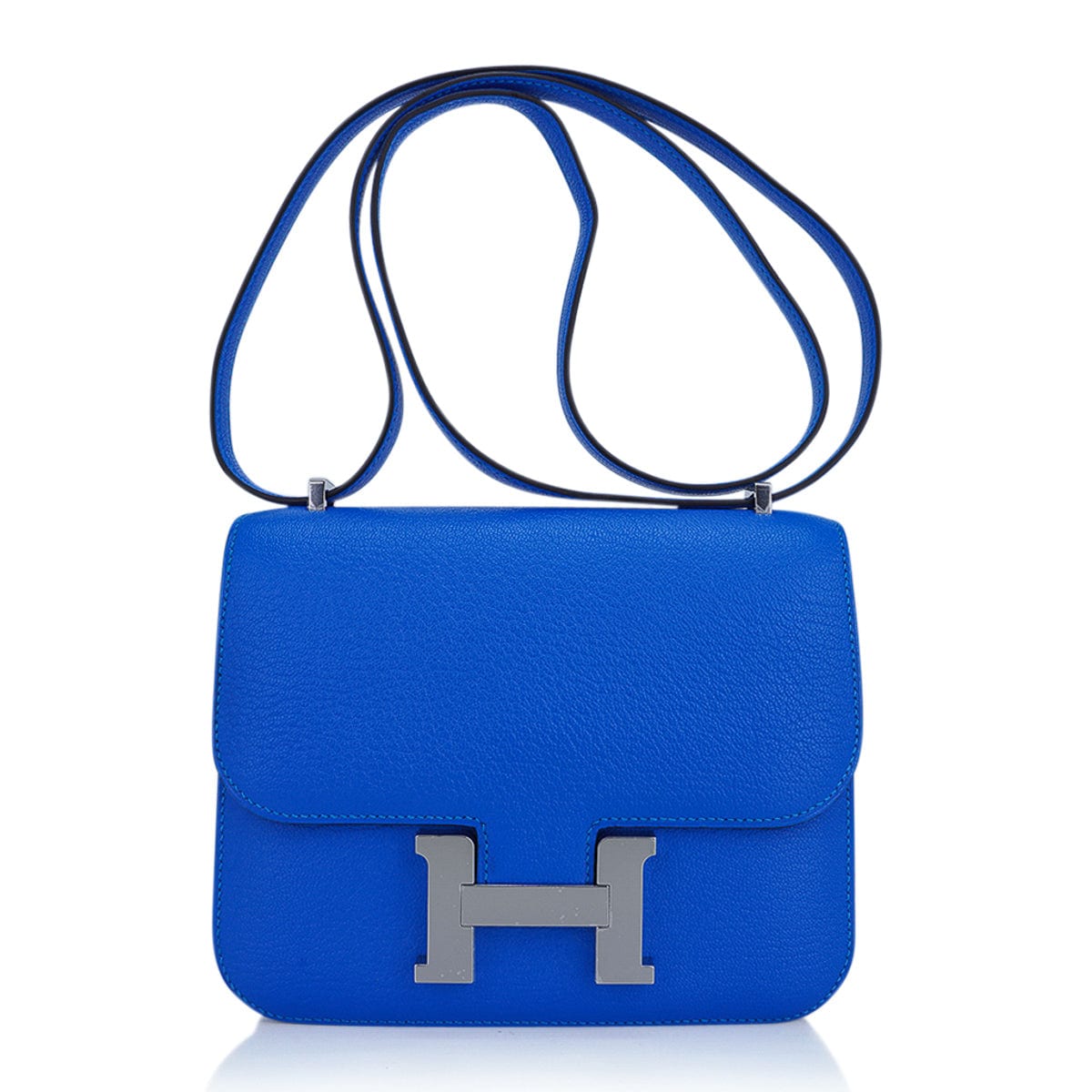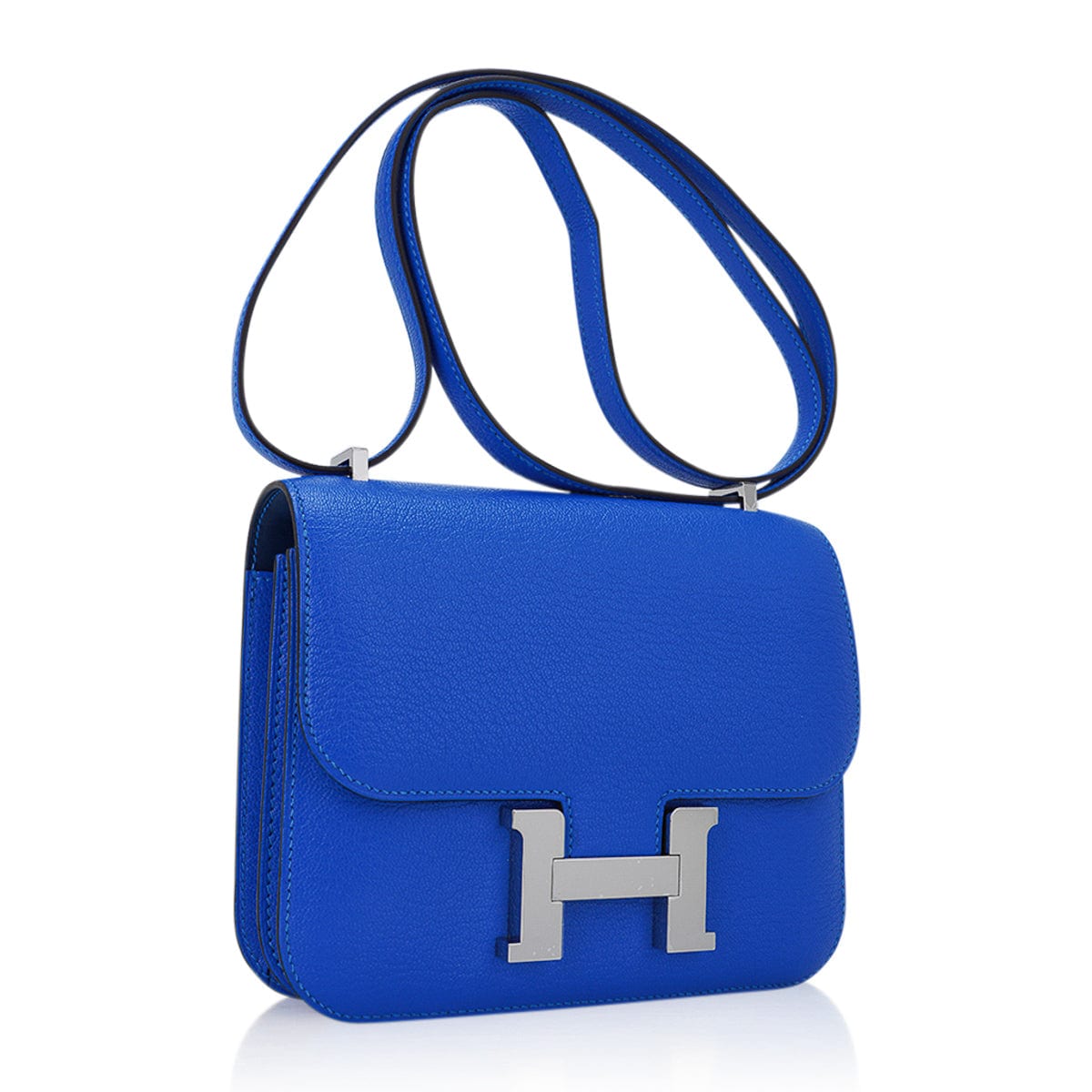 Guaranteed authentic Hermes Constance 18 bag featured in Bleu Hydra with Deep Bleu interior.