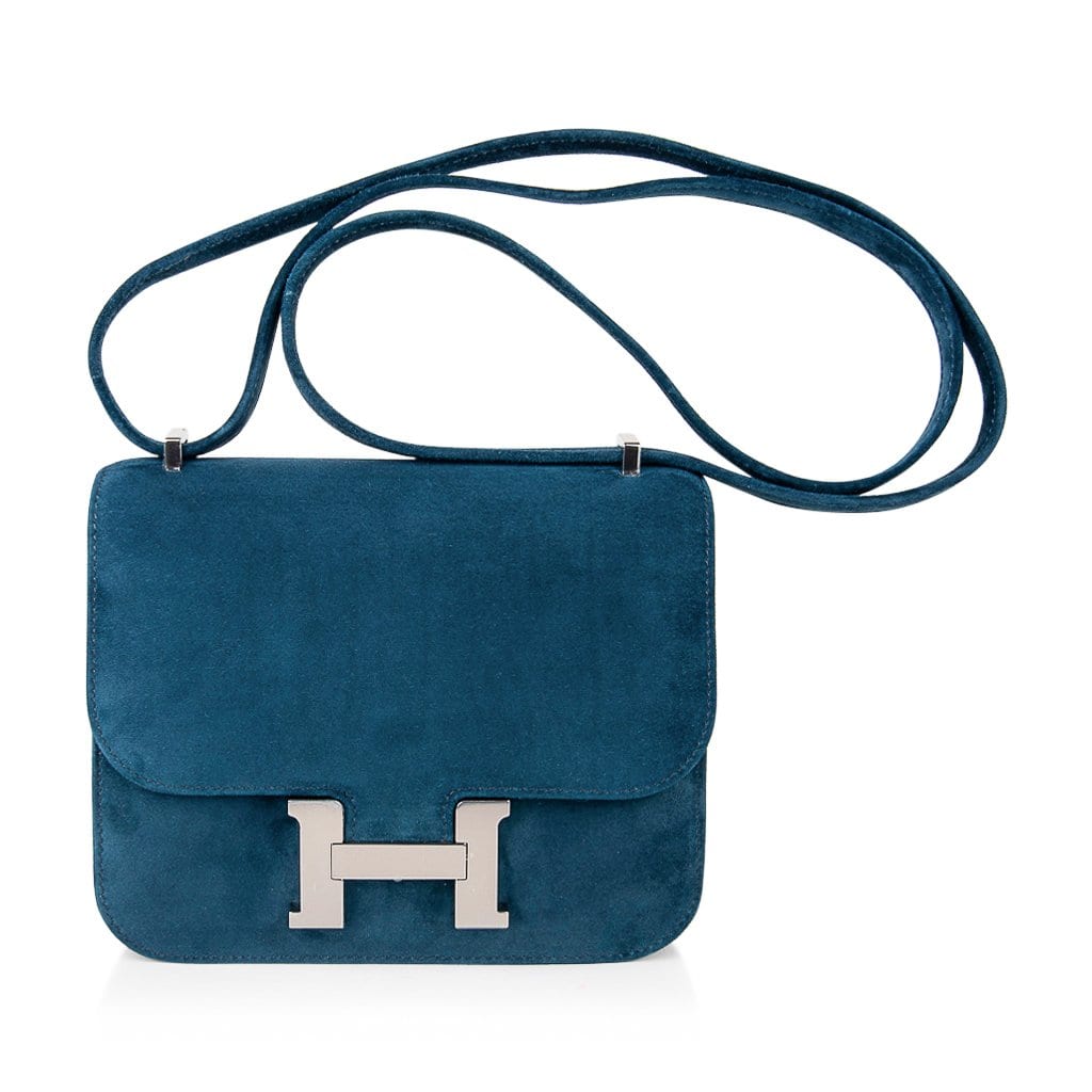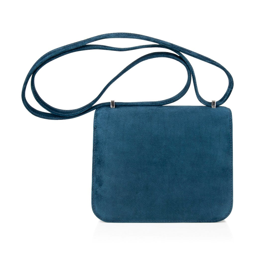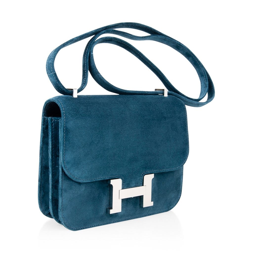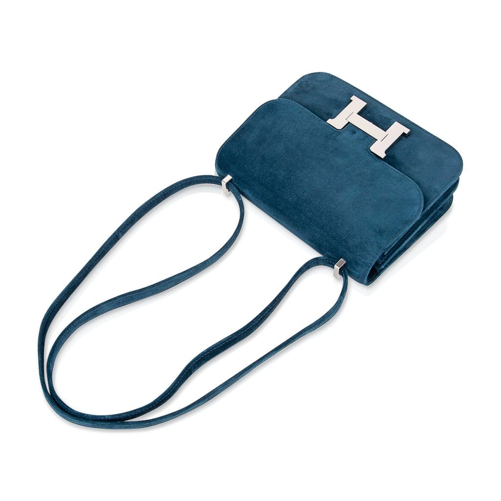 Guaranteed authentic exquisite limited edition Hermes coveted Doblis (suede) bag features the Constance Mini in Blue Ocean.