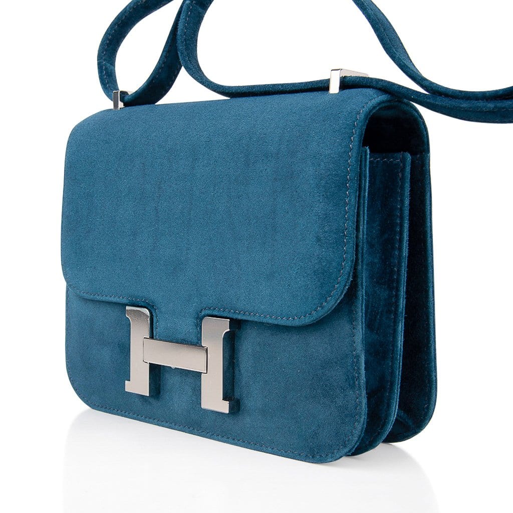 Guaranteed authentic exquisite limited edition Hermes coveted Doblis (suede) bag features the Constance Mini in Blue Ocean.
