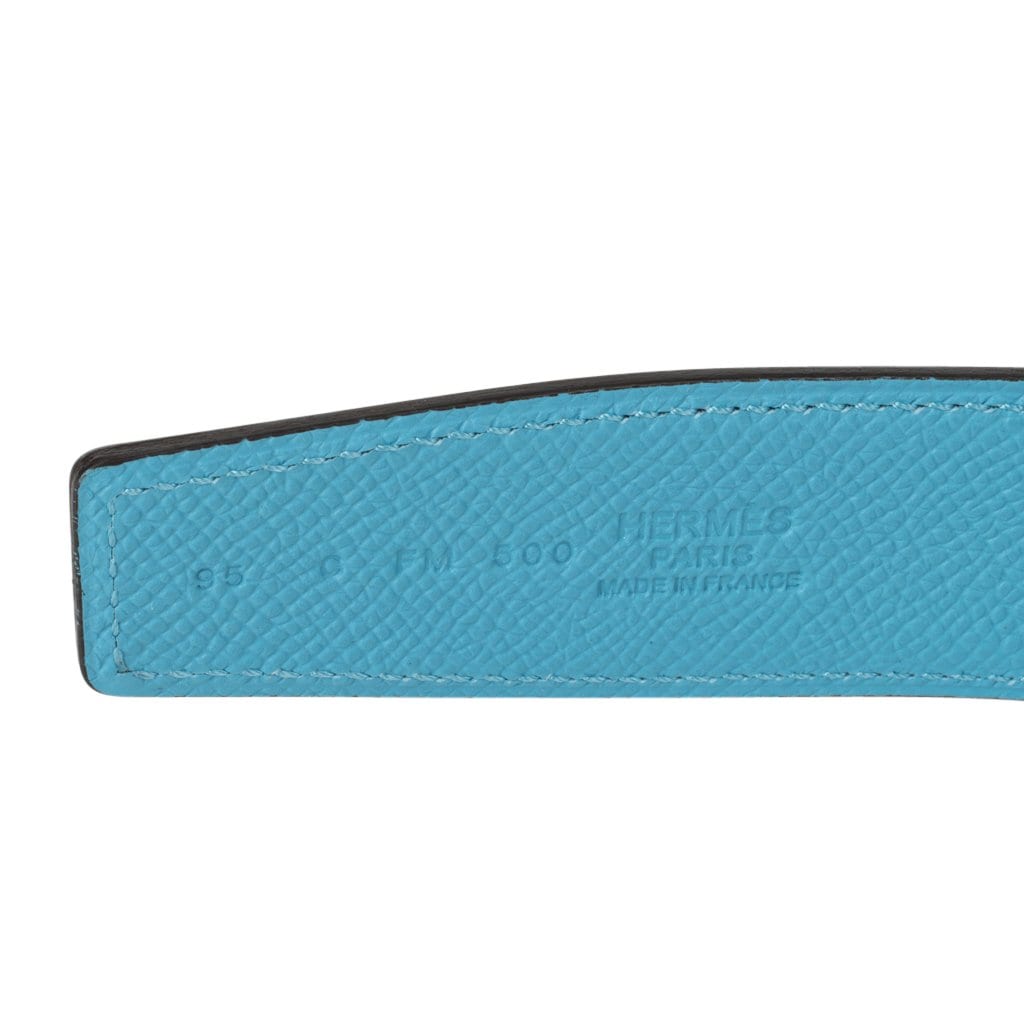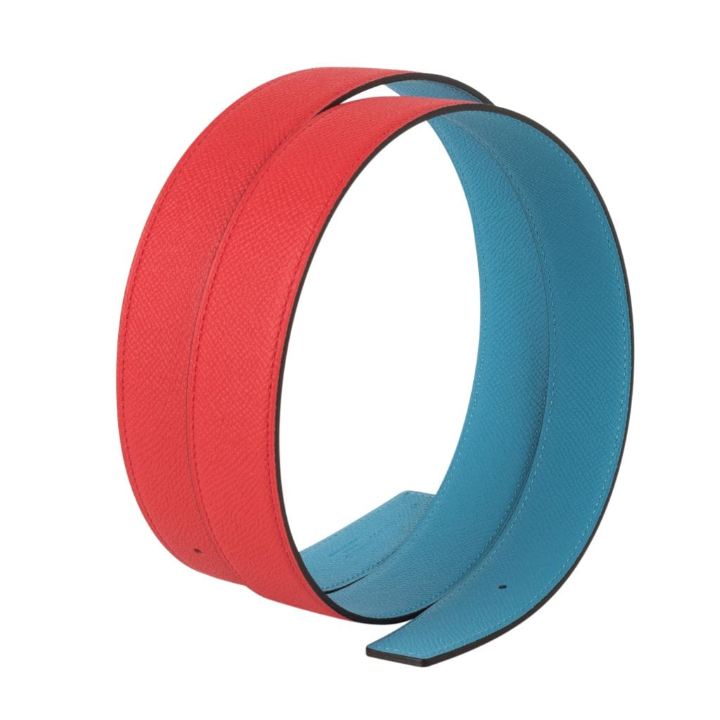 Guaranteed authentic Hermes coveted reversible 32 mm Constance H belt featured in rare Rouge Couer and Blue de Nord Epsom leathers.