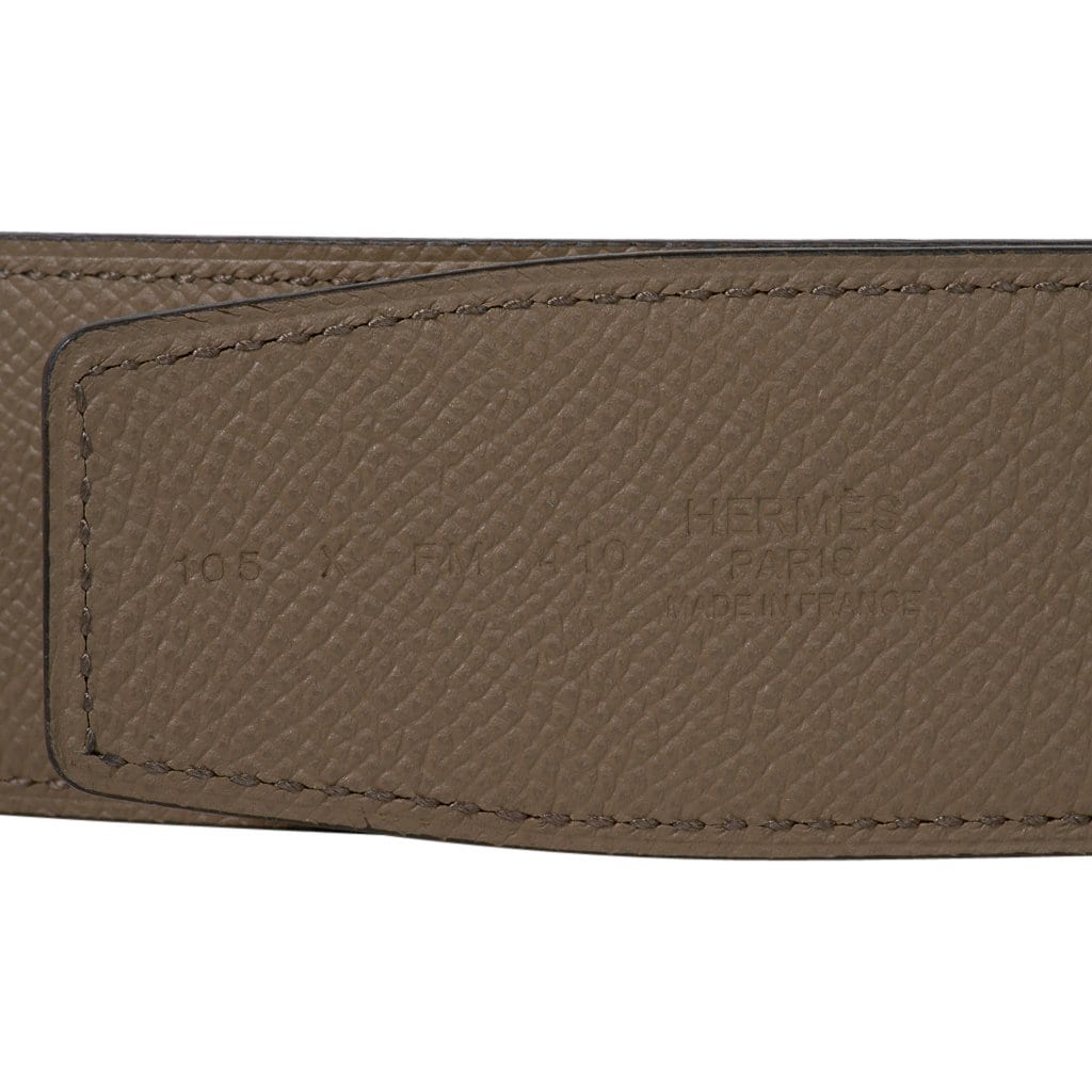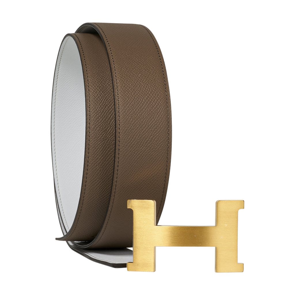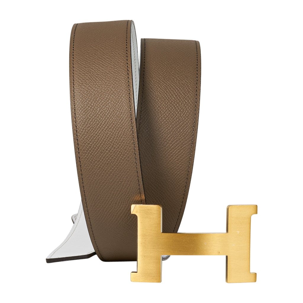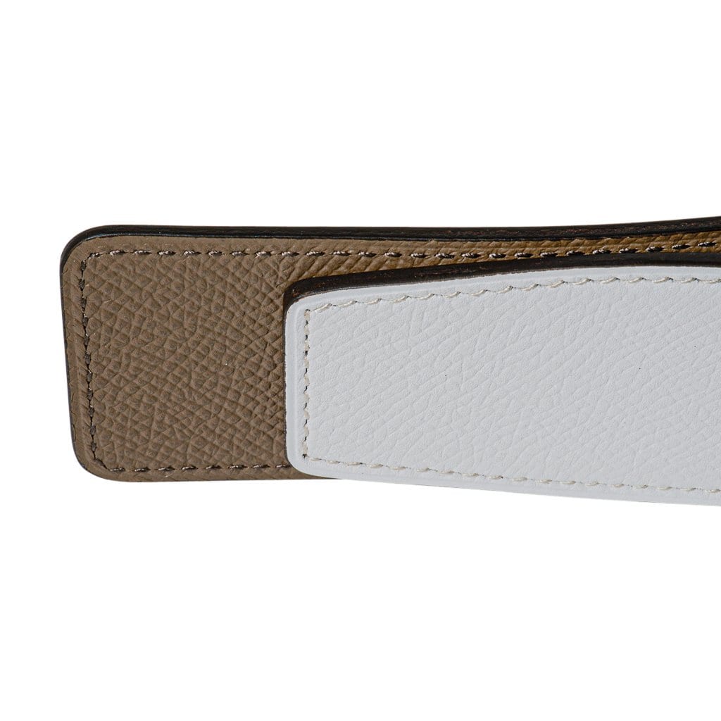Guaranteed authentic Hermes Constance 42 mm belt featured in reversible Etoupe to White Epsom leather.