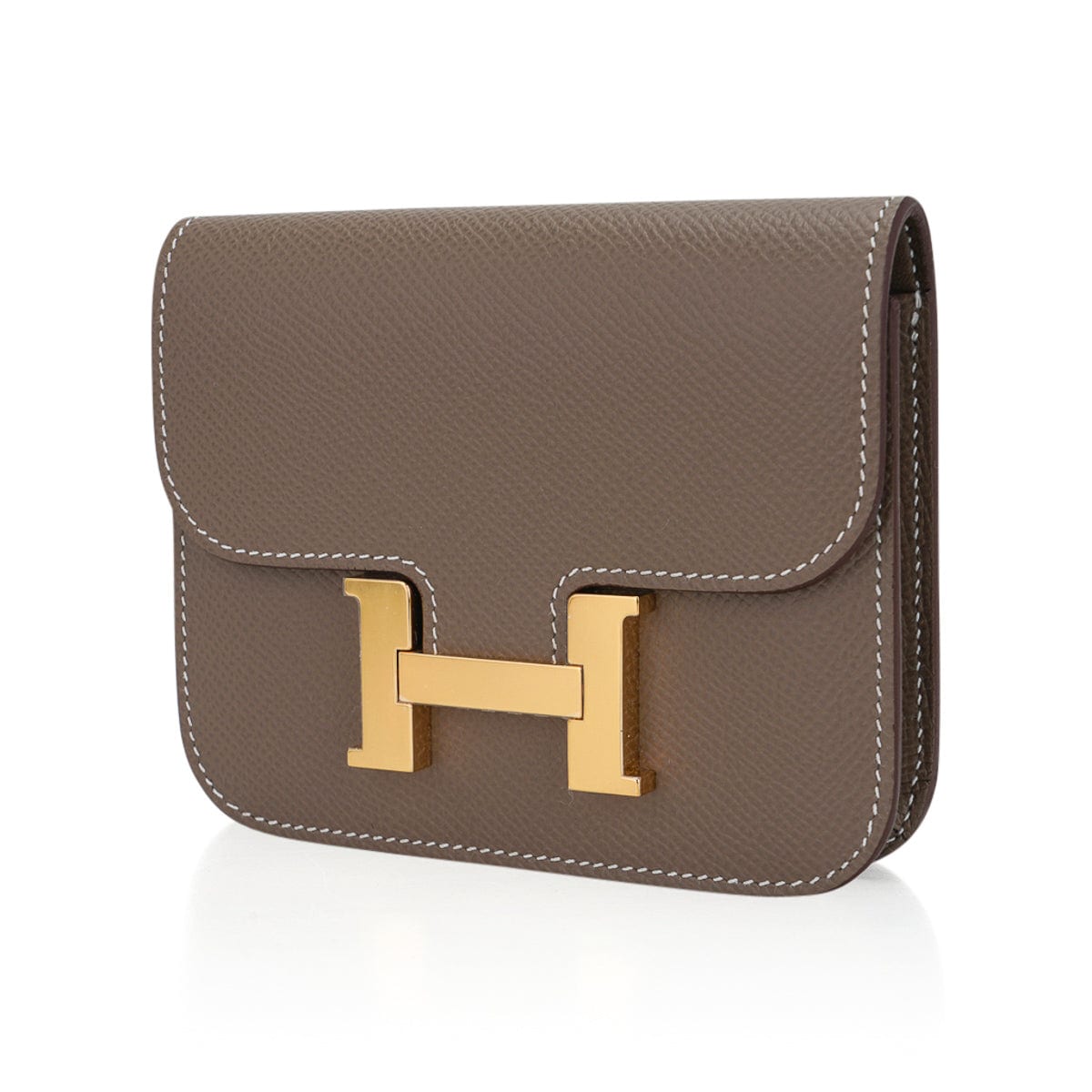 Guaranteed authentic, this Hermès Constance Slim Wallet is featured in the timeless Etoupe shade. Hermès crafts it from structured Epsom leather and finishes it with coveted Gold hardware for a polished, enduring look.