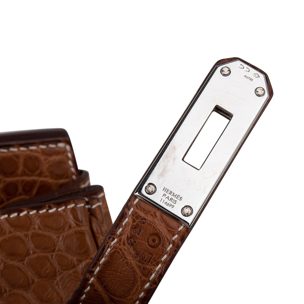 Guaranteed authentic rare Hermes 35 Birkin bag features Hermes set diamonds in Matte Fauve Barenia Alligator.