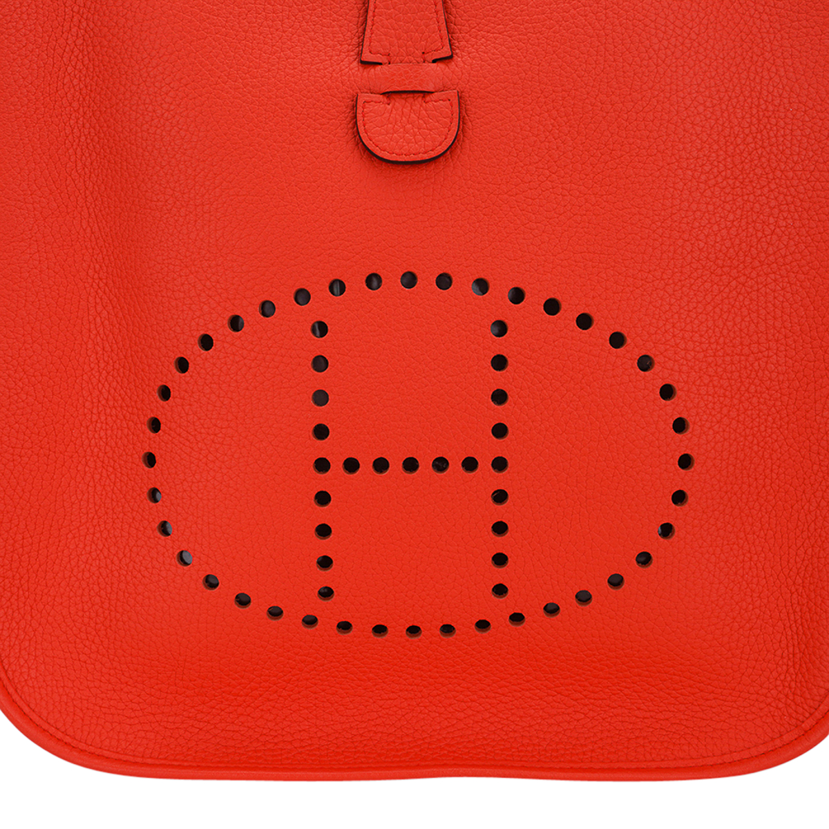 Guaranteed authentic Hermes Evelyne PM featured in vivid Orange Poppy.