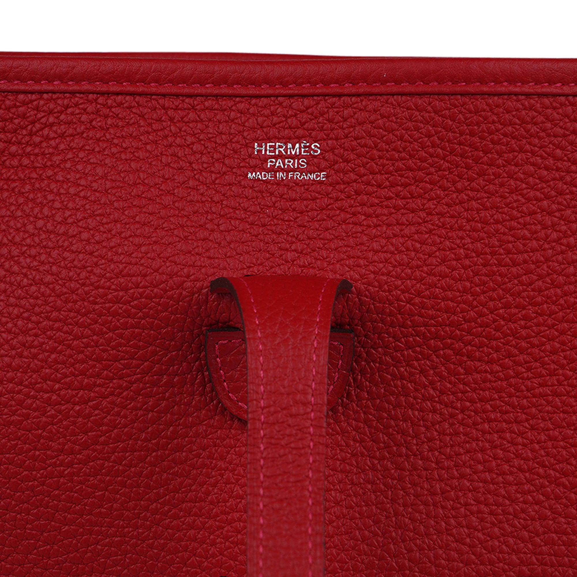Guaranteed authentic Hermes Evelyne PM featured in vivid Rouge Casaque.